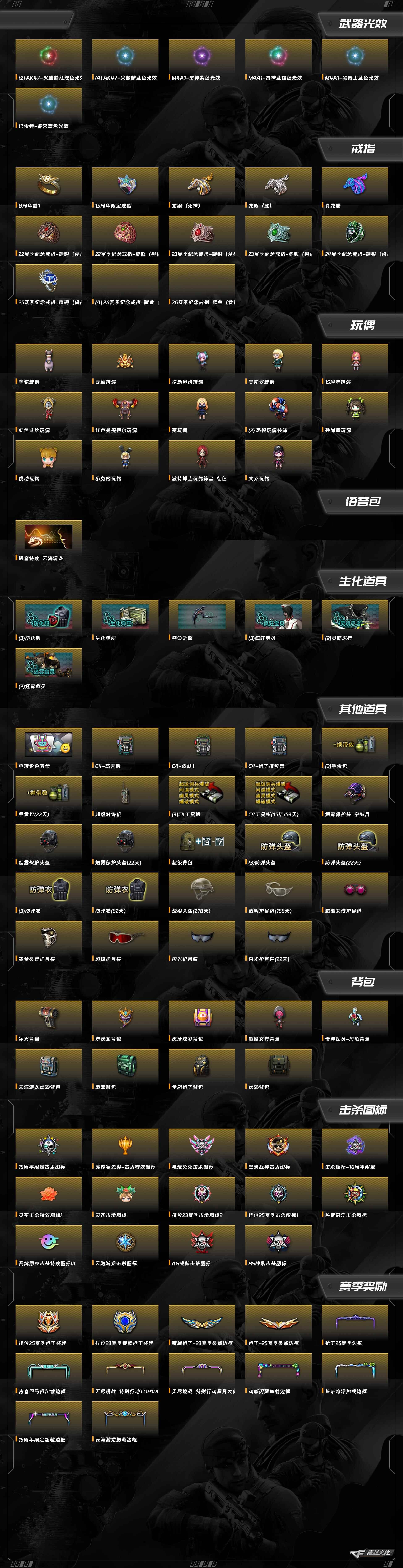AWM-裁决,麒麟刺,龙啸,屠龙,沙鹰-天神,柯尔特-竞技荣光,USP-雷暴,擎天-竞技荣光,沙鹰-修罗,加特林-炼狱,QBZ03-金色蔷薇,AA-12-雷霆,擎天-云海游龙,Barrett-暗月传说,Barrett-毁灭,M4A1-青龙,M4A1-雷神,AK47-B-战神,AK-47-猩红传说,M200-竞技荣光,龙啸-烈火龙威,天神-动感闪耀,白虎-电玩蓝兔
