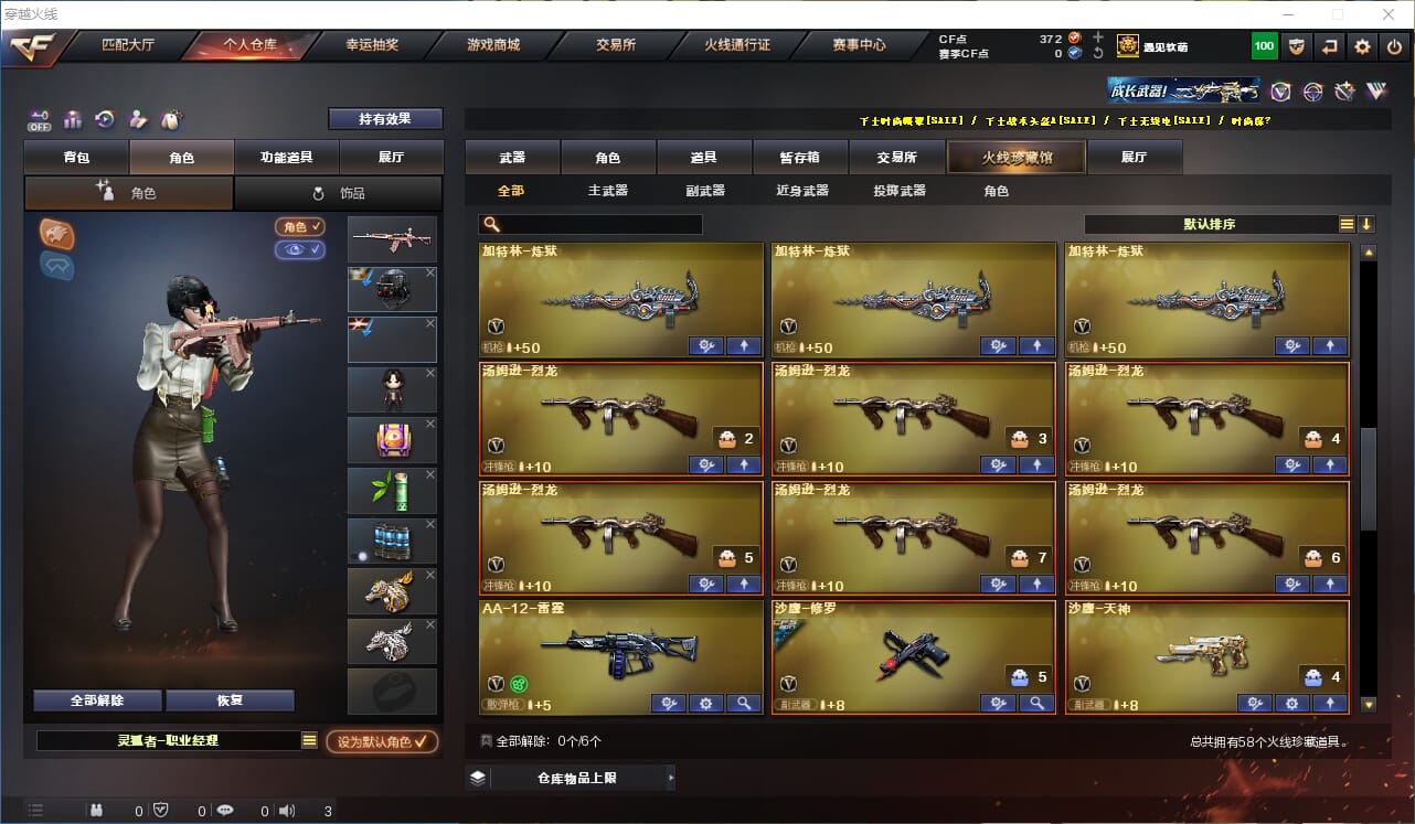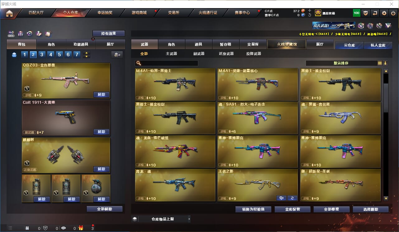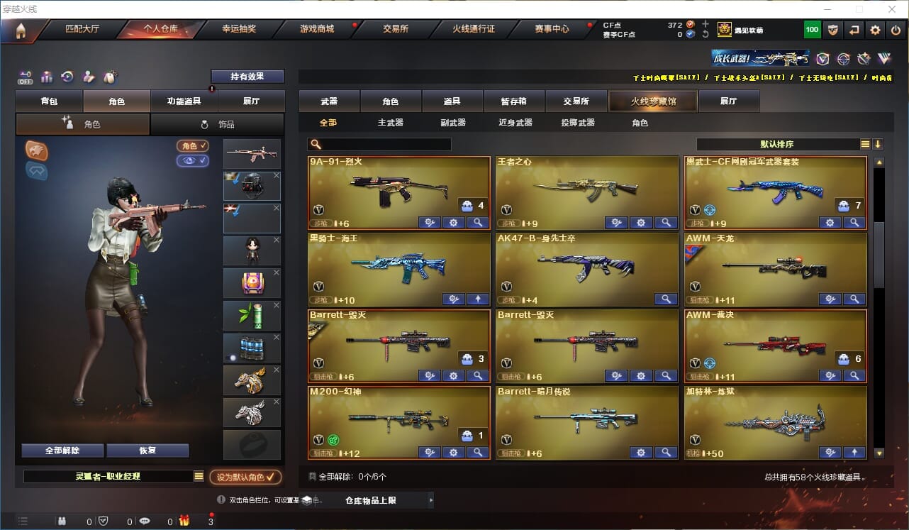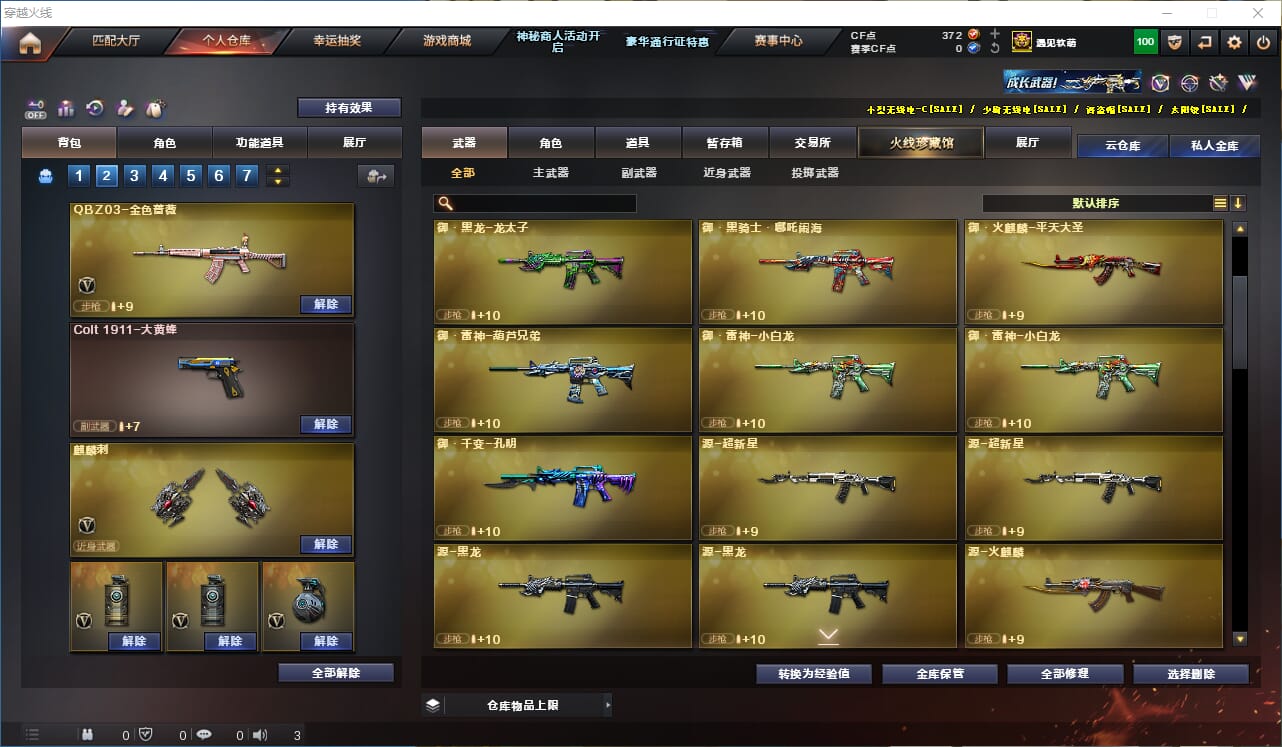 AA-12-雷霆,擎天,麒麟刺,龙啸,屠龙,沙鹰-天神,沙鹰-修罗,加特林-炼狱,汤姆逊-烈龙,9A91-烈火,QBZ03-金色蔷薇,HK417-朱雀,M200-幻神,AWM-裁决,AWM-天龙,Barrett-暗月传说,Barrett-毁灭,M4A1-玫瑰精灵,M4A1-死神,黑骑士-海王,M4A1-黑骑士,M4A1-雷神,AK47-火麒麟