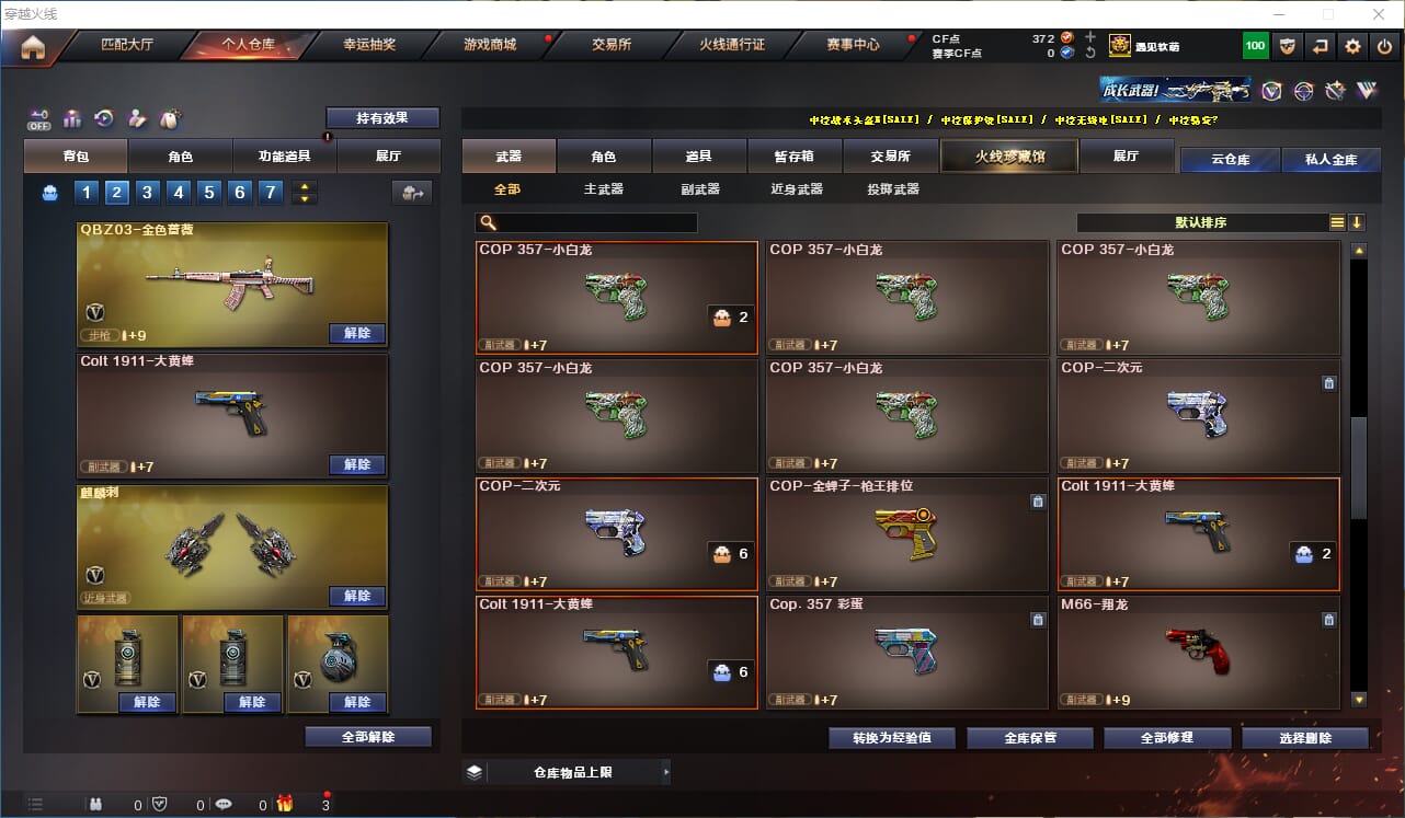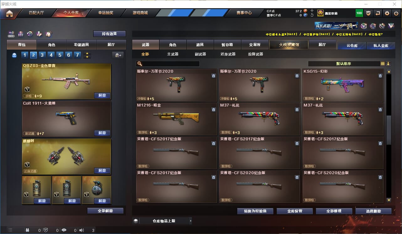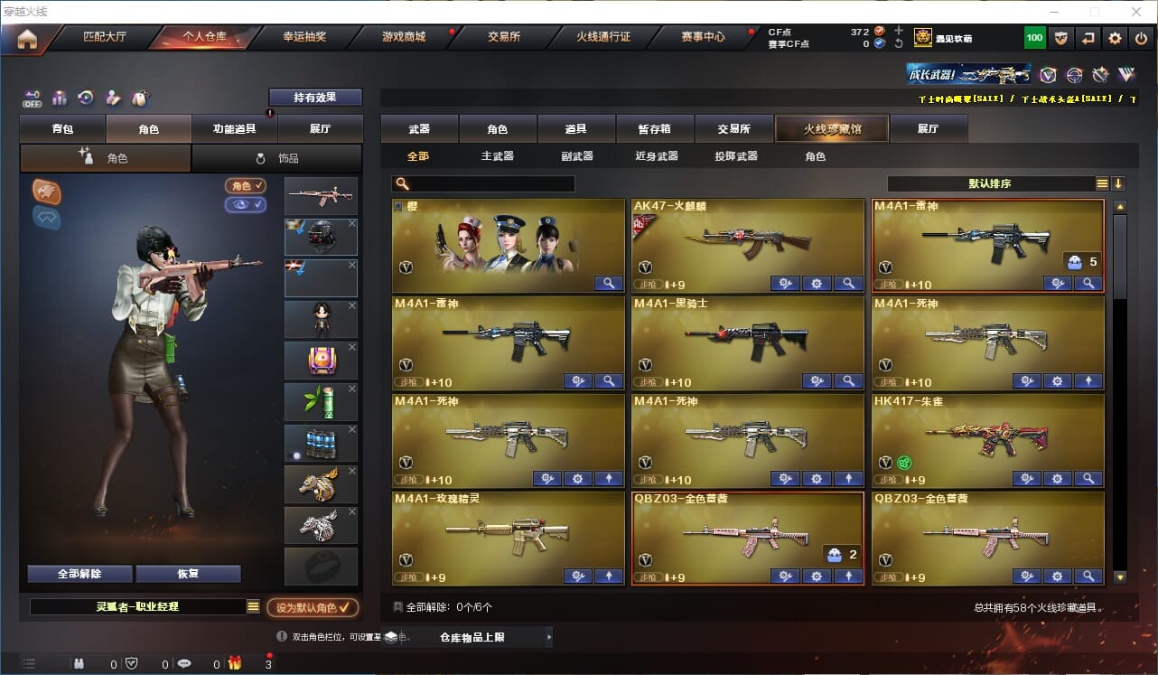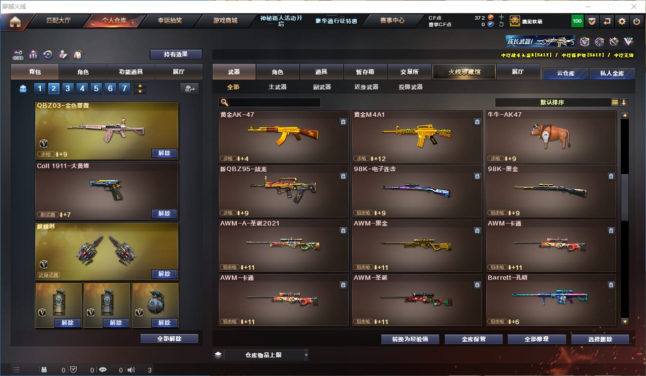 AA-12-雷霆,擎天,麒麟刺,龙啸,屠龙,沙鹰-天神,沙鹰-修罗,加特林-炼狱,汤姆逊-烈龙,9A91-烈火,QBZ03-金色蔷薇,HK417-朱雀,M200-幻神,AWM-裁决,AWM-天龙,Barrett-暗月传说,Barrett-毁灭,M4A1-玫瑰精灵,M4A1-死神,黑骑士-海王,M4A1-黑骑士,M4A1-雷神,AK47-火麒麟