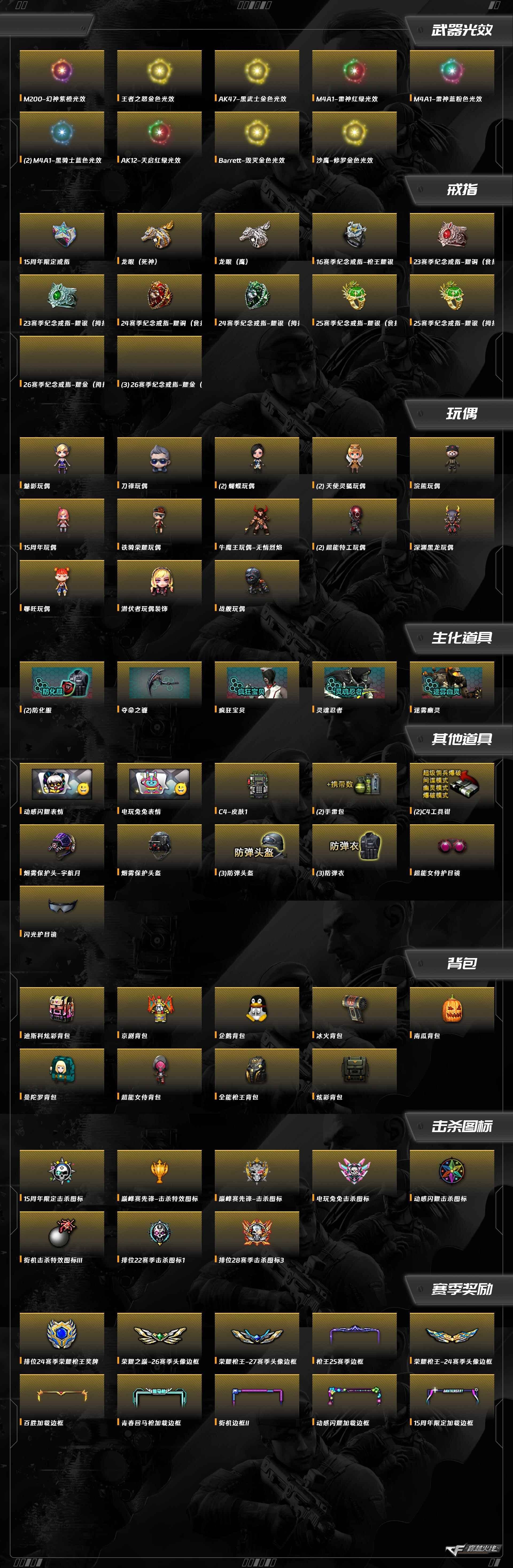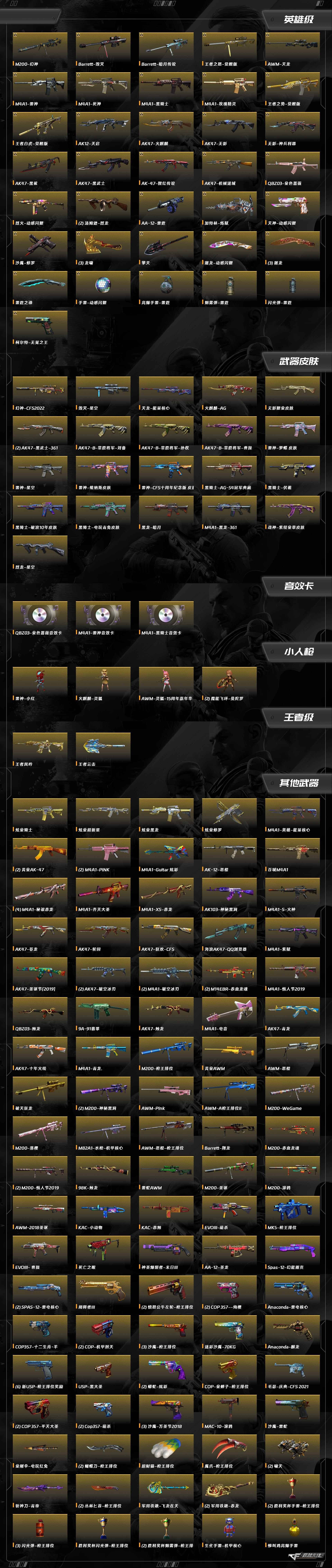 M4A1-玫瑰精灵,擎天,龙啸,屠龙,沙鹰-修罗,加特林-炼狱,汤姆逊-烈龙,QBZ03-金色蔷薇,AK12-天启,AA-12-雷霆,AWM-天龙,Barrett-暗月传说,Barrett-毁灭,M200-幻神,M4A1-死神,M4A1-黑骑士,M4A1-雷神,AK-47-猩红传说,AK47-机械迷城,AK47-黑武士,AK47-黑鲨,AK47-火麒麟,AK47-无影,天神-动感闪耀,屠龙-动感闪耀,烈火-动感闪耀