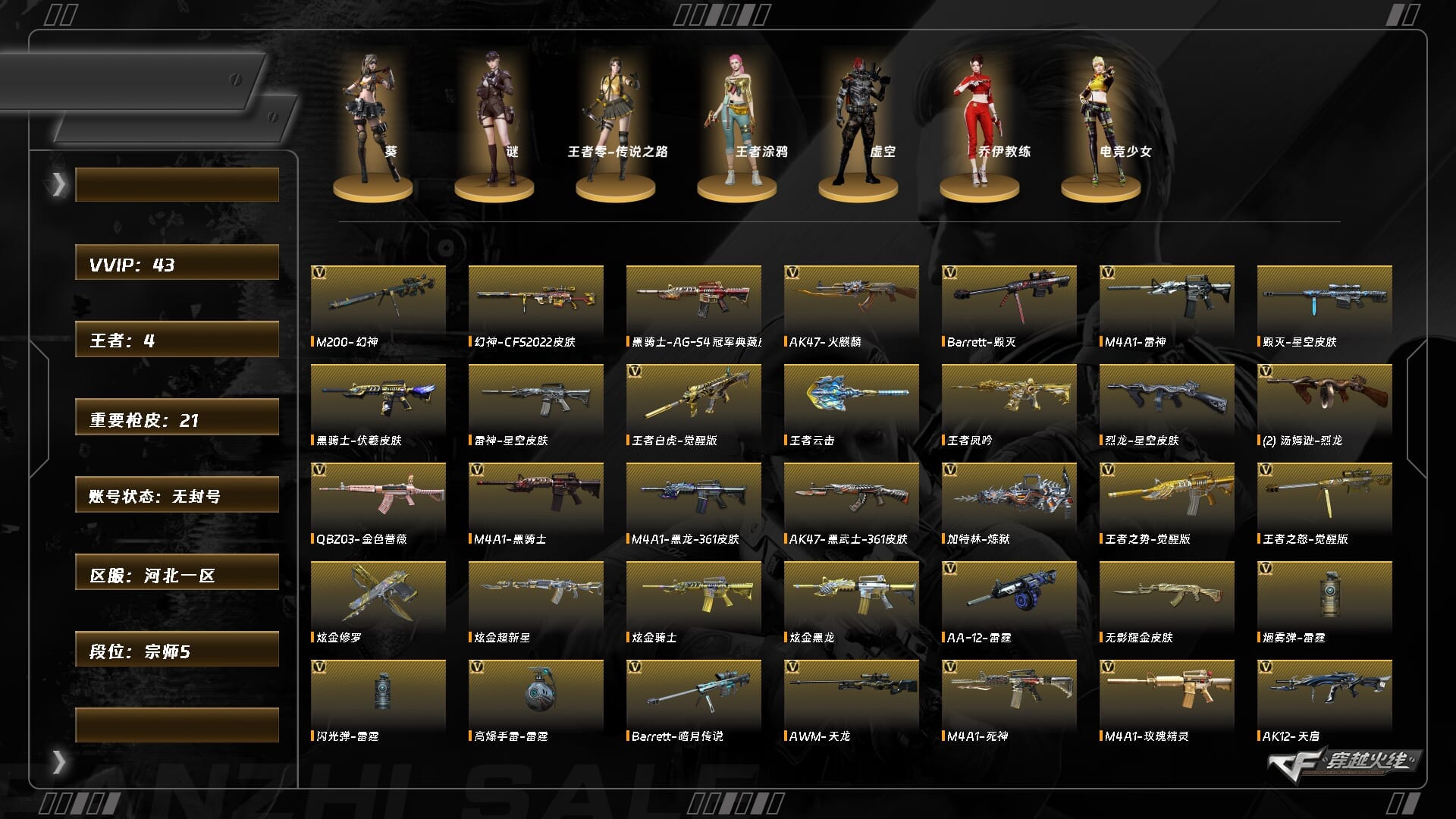 【C2528274738】[12480238]XH8437/北部/河北一区/可排位/【宗师5】【Lv100大元帅】/43V/4王者/4炫金/幻神/幻神CFS2022/QBZ金色蔷薇/金色蔷薇音效卡/柯尔特无冕之王/王者白虎//烈火动感闪耀/M4玫瑰精灵/【音效卡】/雷神音效卡/黑骑士音效卡/【枪皮】/毁灭星空/火麒麟AG/黑骑士伏羲/雷神CFS十周年纪念版/黑骑士电玩青兔/【角色】/葵/谜/王者零传说之路/王者涂鸦/乔伊教练/电竞少女/【道具】/永久烟雾头/护目镜/各种戒指/各种光效/各种玩偶/永久AC/永久雷包/细节看图/