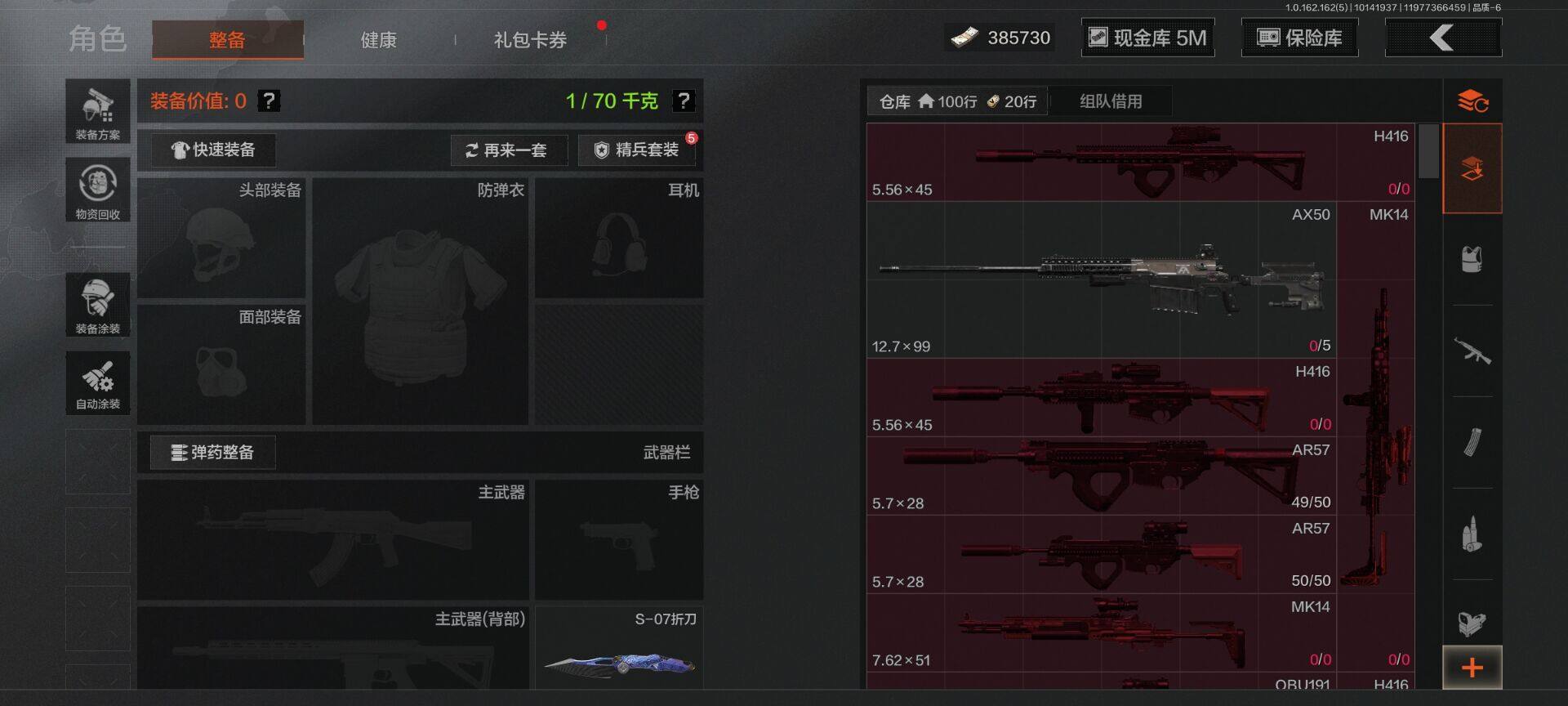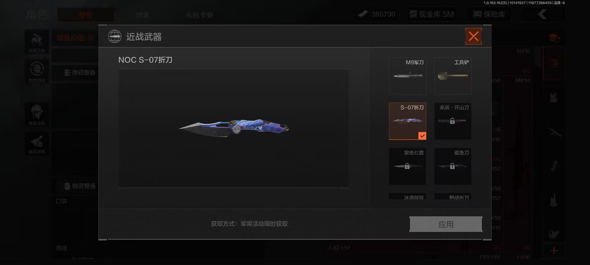 【C2528649468】【AQZG296】等级:30/段位:王牌/仓库价值(百万):13.9/柯恩币:385730/工兵铲/NOCs-7折刀