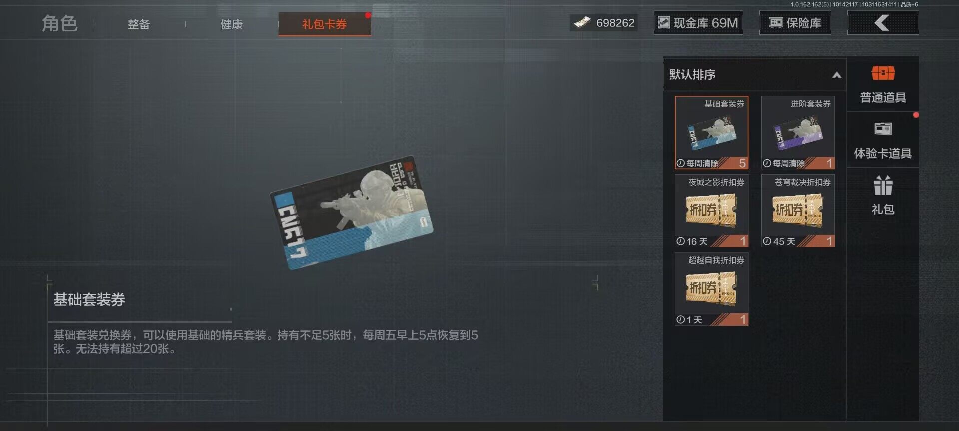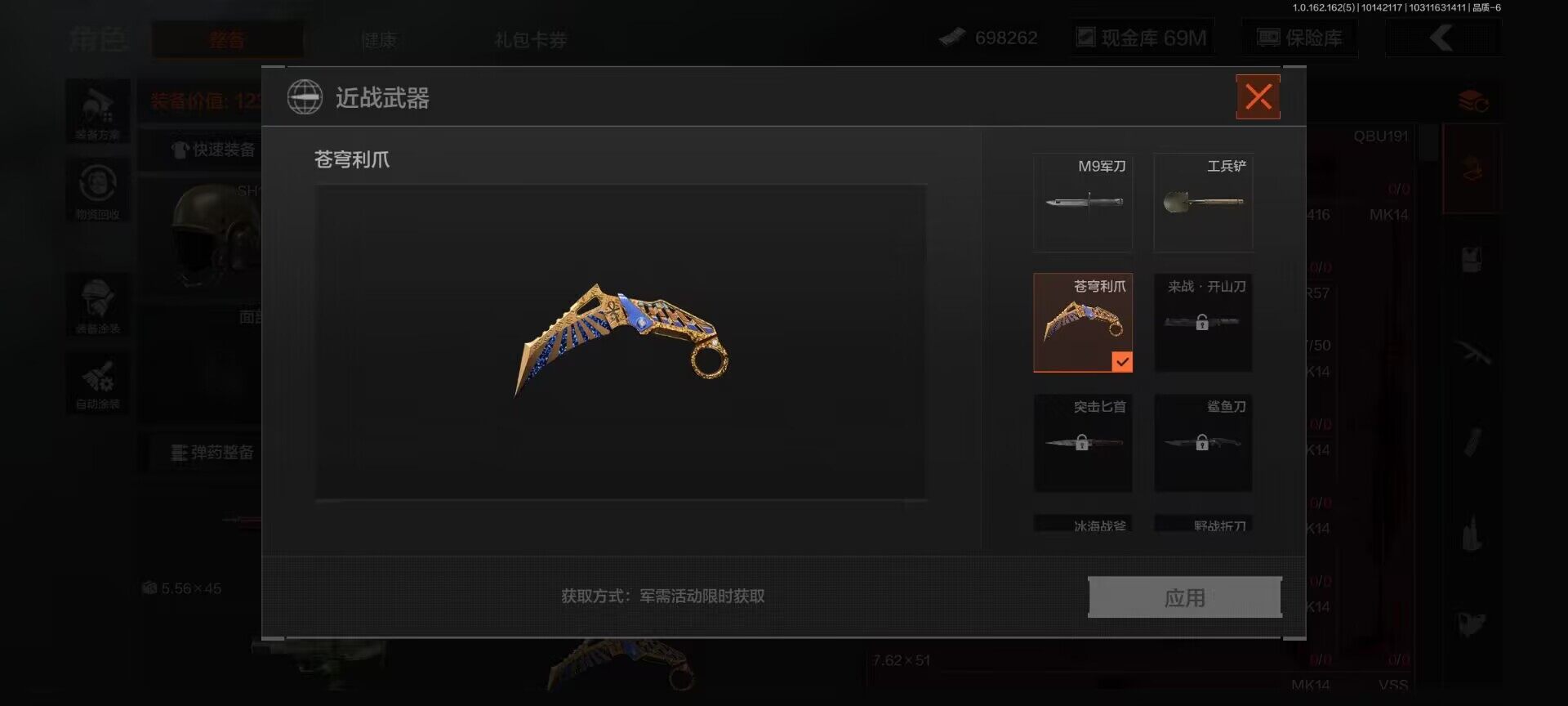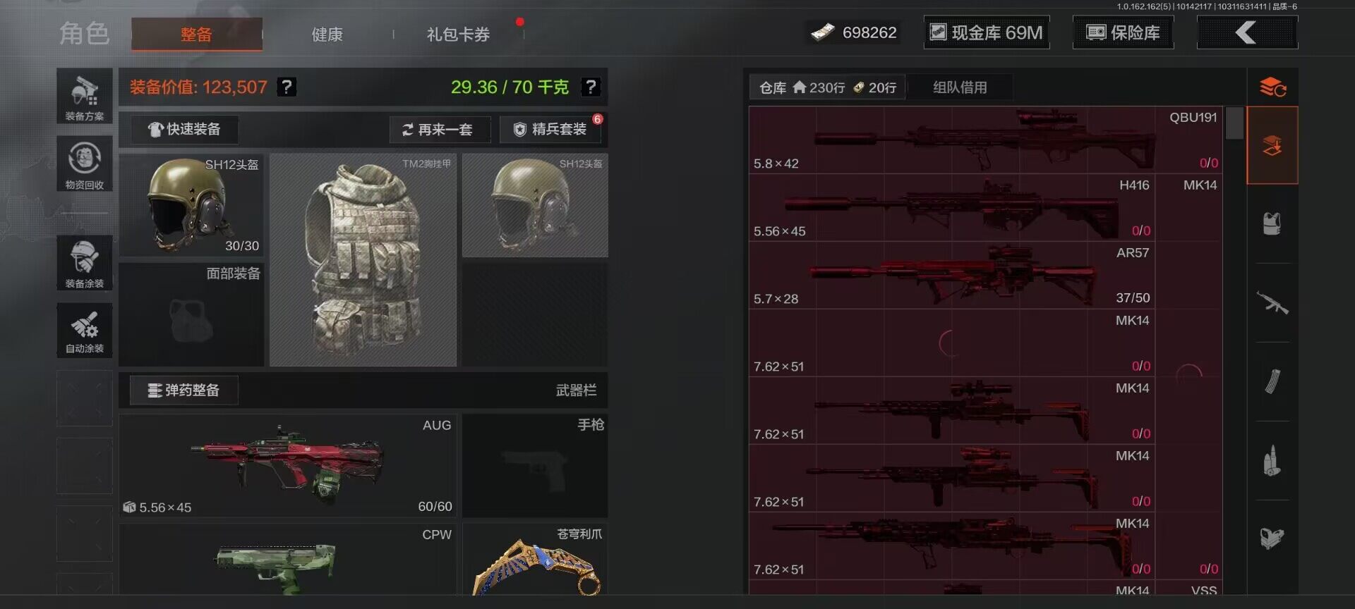 【C2528646180】【AQZG297】等级:30/段位:暗区传说/仓库价值(百万):83.5/柯恩币:698262/工兵铲