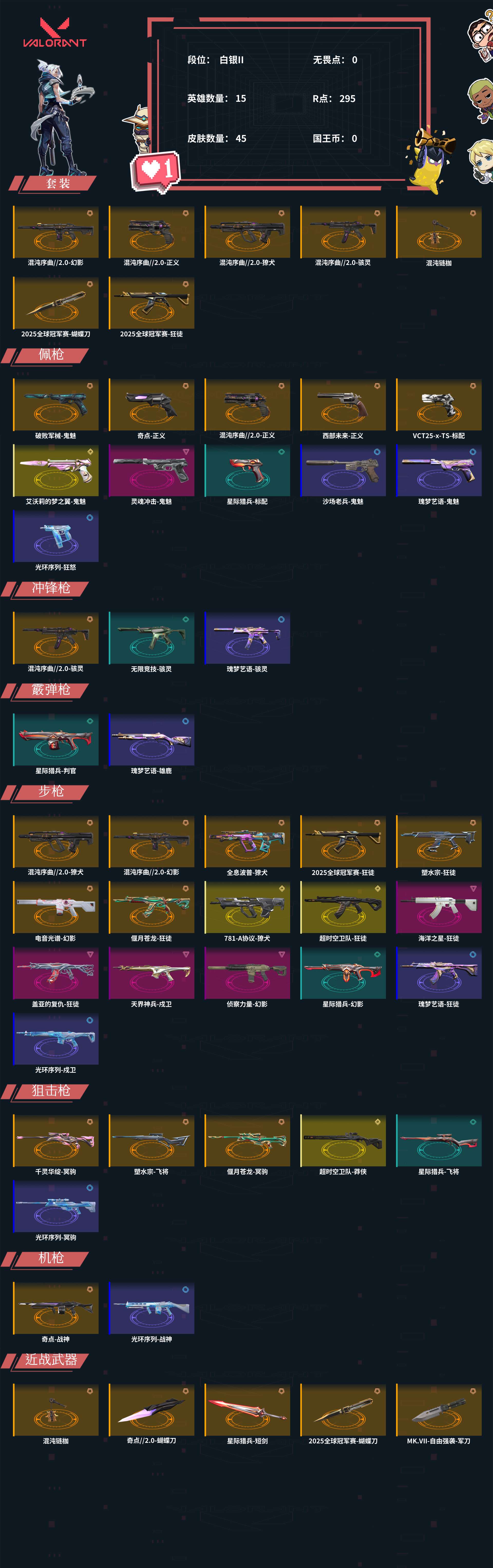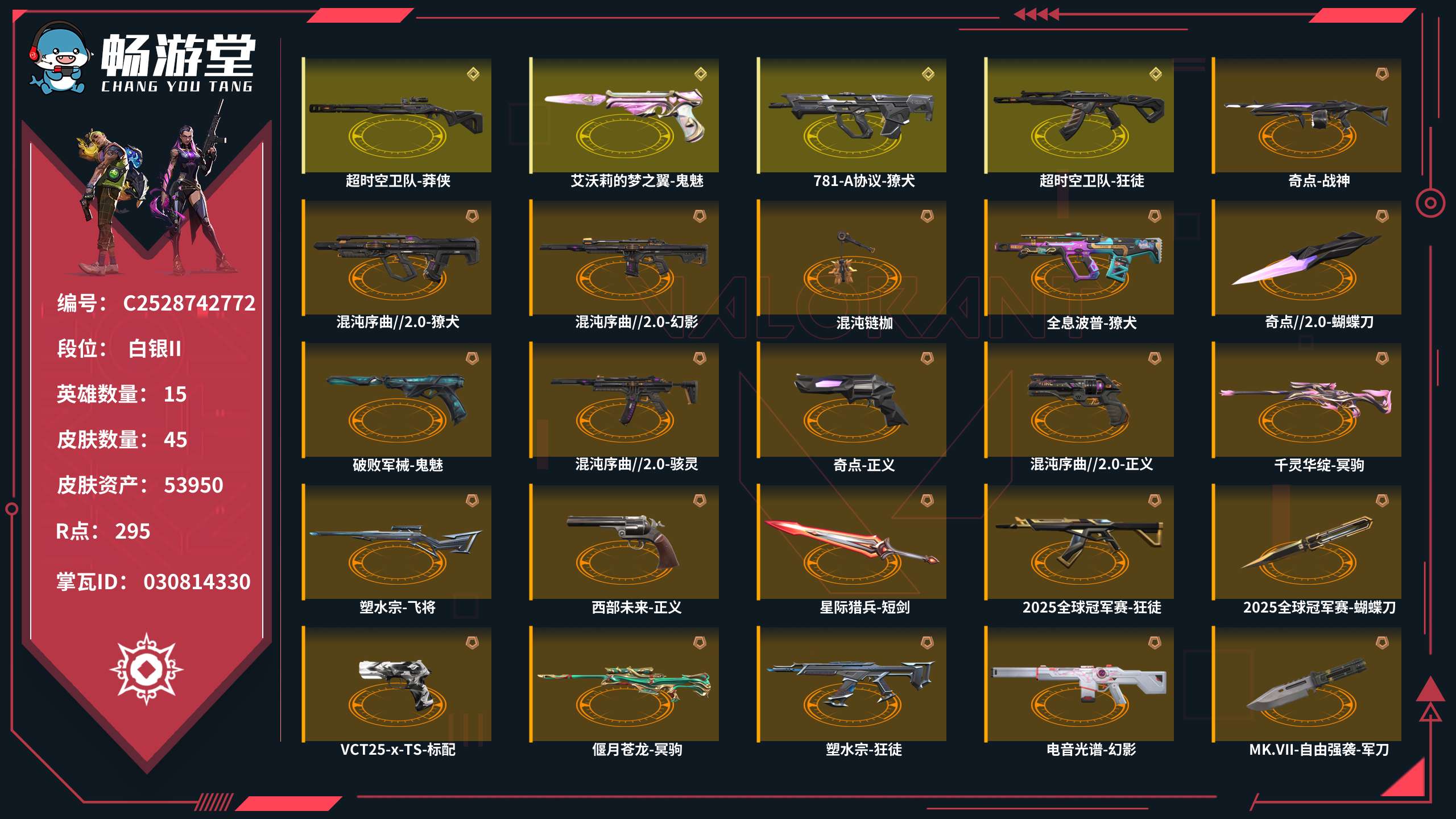 【C2528742772】皮肤资产:53950 皮肤数量:45 英雄数量:15 R点:295 段位: 白银II 套装 【混沌序曲//2.0 礼包(混沌序曲//2.0-幻影,混沌序曲//2.0-正义,混沌序曲//2.0-獠犬,混沌序曲//2.0-骇灵,混沌链枷)】 【2025全球冠军赛 礼包(2025全球冠军赛-蝴蝶刀,2025全球冠军赛-狂徒)】 狂徒【海洋之星-狂徒,盖亚的复仇-狂徒,超时空卫队-狂徒,瑰梦艺语-狂徒,塑水宗-狂徒,偃月苍龙-狂徒】幻影【电音光谱-幻影,星际猎兵-幻影,侦察力量-幻影】近战武器【奇点//2.0-蝴蝶刀,星际猎兵-短剑,MK.VII-自由强袭-军刀】正义【奇点-正义,西部未来-正义】冥驹【千灵华绽-冥驹,光环序列-冥驹,偃月苍龙-冥驹】鬼魅【破败军械-鬼魅,艾沃莉的梦之翼-鬼魅,灵魂冲击-鬼魅,沙场老兵-鬼魅,瑰梦艺语-鬼魅】骇灵【无限竞技-骇灵,瑰梦艺语-骇灵】标配【星际猎兵-标配,VCT25-x-TS-标配】獠犬【全息波普-獠犬,781-A协议-獠犬】戍卫【天界神兵-戍卫,光环序列-戍卫】飞将【塑水宗-飞将,星际猎兵-飞将】战神【奇点-战神,光环序列-战神】