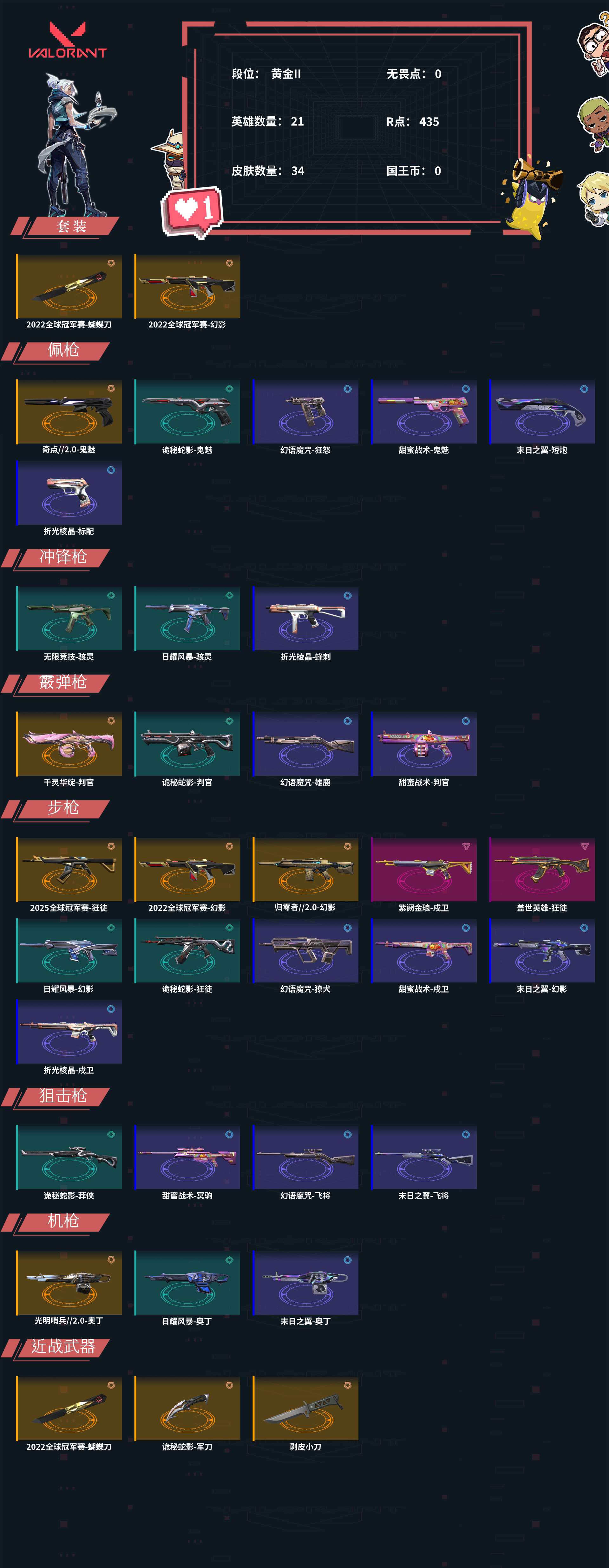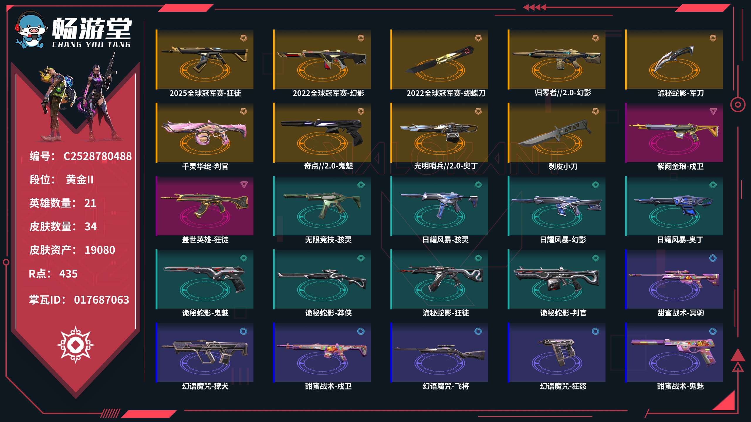 【C2528780488】皮肤资产:19080 皮肤数量:34 英雄数量:21 R点:435 段位: 黄金II 套装 【2022全球冠军赛 礼包(2022全球冠军赛-蝴蝶刀,2022全球冠军赛-幻影)】 狂徒【2025全球冠军赛-狂徒,诡秘蛇影-狂徒,盖世英雄-狂徒】幻影【日耀风暴-幻影,归零者//2.0-幻影,末日之翼-幻影】近战武器【诡秘蛇影-军刀,剥皮小刀】鬼魅【甜蜜战术-鬼魅,诡秘蛇影-鬼魅,奇点//2.0-鬼魅】骇灵【无限竞技-骇灵,日耀风暴-骇灵】判官【甜蜜战术-判官,诡秘蛇影-判官,千灵华绽-判官】戍卫【甜蜜战术-戍卫,紫阙金琅-戍卫,折光棱晶-戍卫】飞将【幻语魔咒-飞将,末日之翼-飞将】奥丁【日耀风暴-奥丁,末日之翼-奥丁,光明哨兵//2.0-奥丁】