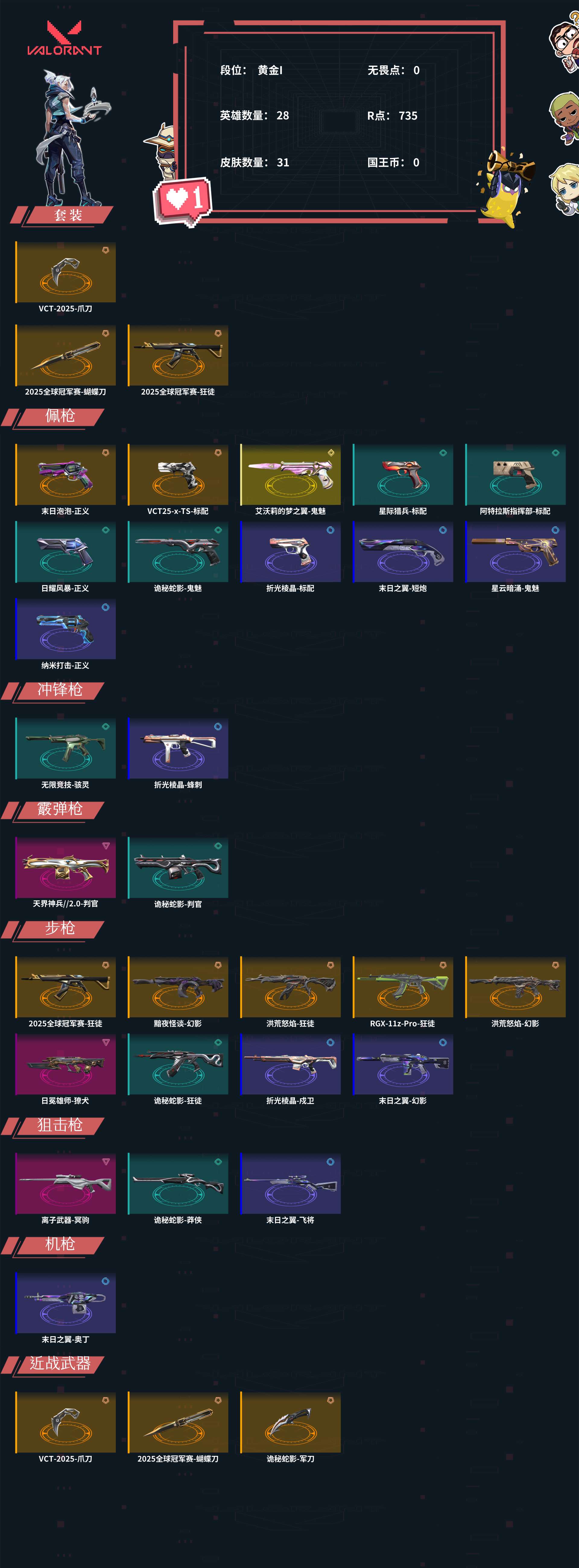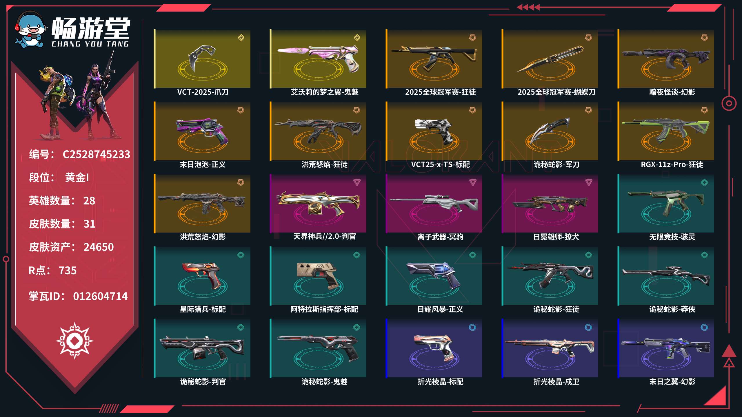 【C2528745233】皮肤资产:24650 皮肤数量:31 英雄数量:28 R点:735 段位: 黄金I VCT-2025-爪刀 套装 【2025全球冠军赛 礼包(2025全球冠军赛-蝴蝶刀,2025全球冠军赛-狂徒)】 【VCT 2025 赛季 礼包(VCT-2025-爪刀)】 狂徒【洪荒怒焰-狂徒,诡秘蛇影-狂徒,RGX-11z-Pro-狂徒】幻影【黯夜怪谈-幻影,末日之翼-幻影,洪荒怒焰-幻影】正义【末日泡泡-正义,日耀风暴-正义,纳米打击-正义】鬼魅【艾沃莉的梦之翼-鬼魅,诡秘蛇影-鬼魅,星云暗涌-鬼魅】标配【星际猎兵-标配,VCT25-x-TS-标配,阿特拉斯指挥部-标配,折光棱晶-标配】判官【诡秘蛇影-判官,天界神兵//2.0-判官】