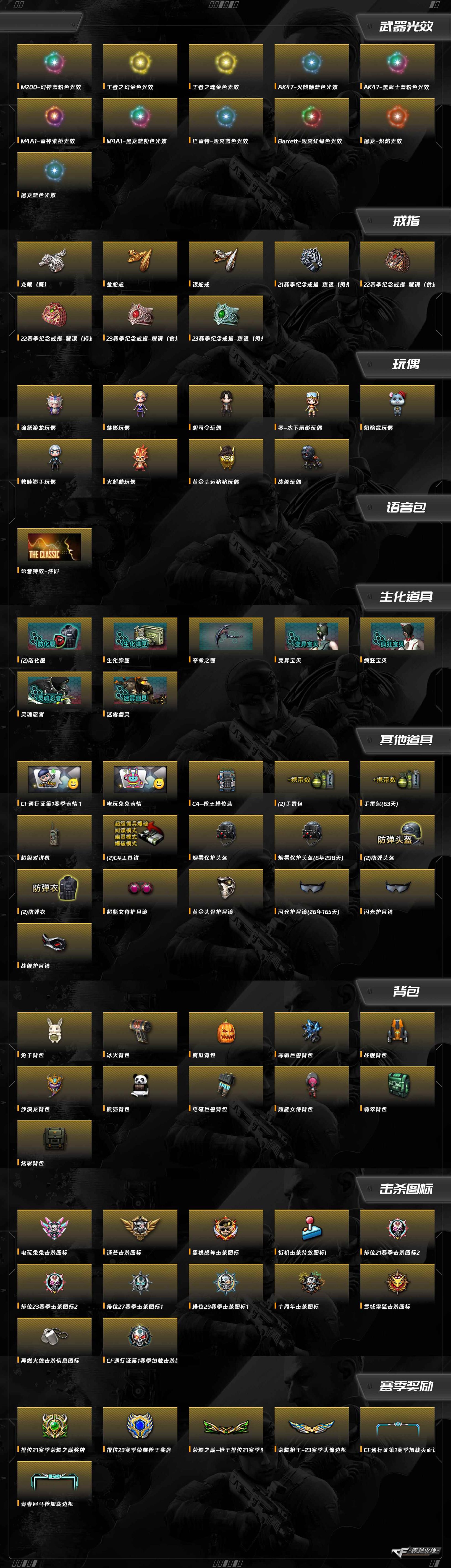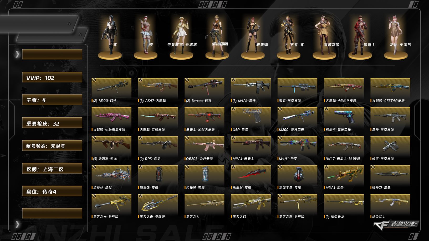 USP-雷暴,AK12-天启,AN94-超新星,QBZ03-金色蔷薇,RPK-盘龙,汤姆逊-烈龙,加特林-炼狱,沙鹰-修罗,擎天-竞技荣光,Barrett-暗月传说,柯尔特-竞技荣光,沙鹰-天神,屠龙,龙啸,麒麟刺,擎天,斩神刀-雷暴,M200-幻神,Barrett-极光,Barrett-毁灭,M4A1-玫瑰精灵,M4A1-千变,M4A1-武圣,M4A1-龙血,M4A1-黑龙,M4A1-黑骑士,M4A1-雷神,AK47-B-战神,AK47-黑武士,AK47-黑鲨,AK47-火麒麟,M200-竞技荣光,白虎-电玩蓝兔