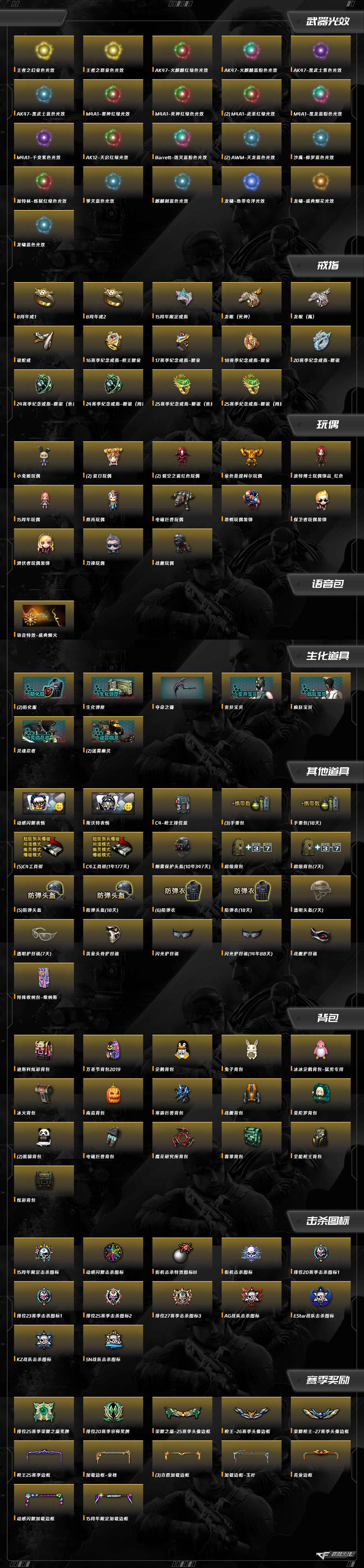 RPK-盘龙,Barrett-毁灭,Barrett-极光,Barrett-暗月传说,AWM-天龙,AWM-裁决,AA-12-雷霆,HK417-朱雀,QBZ03-金色蔷薇,9A91-烈火,M4A1-武圣,汤姆逊-烈龙,加特林-炼狱,沙鹰-修罗,沙鹰-天神,屠龙,龙啸,麒麟刺,擎天,AK47-麒麟,M4A1神工天巧,USP神工天巧,烈火-动感闪耀,屠龙-动感闪耀,天神-动感闪耀,AK47-无影,AK47-火麒麟,AK47-黑鲨,AK47-黑武士,M200-幻神,AK47-B-战士,AK47-机械迷城,AK-47-猩红传说,AK47-B-战神,M4A1-雷神,M4A1-黑骑士,M4A1-死神,M4A1-黑龙