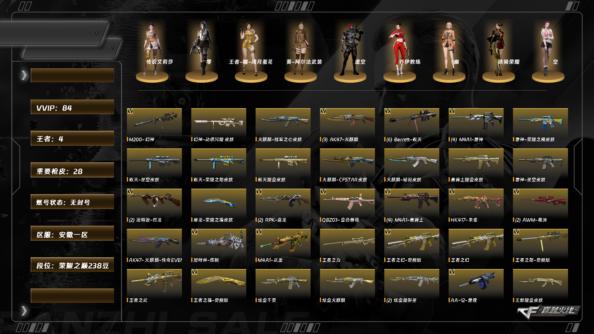【C2529839395】[13009519]LC6978,东部,安徽一区,可排位,84V,【幻神三件套,幻神,幻神动感闪耀,幻神动感闪耀音效卡,】,【,传说三防角色,传说艾莉莎,】,QBZ金色蔷薇,朱雀,白虎之魄,【,四防角色,王者瞳闭月羞花,】,【角色】,零,葵阿尔法武装,乔伊教练,【音效卡】,毁灭音效卡,碧霄极光音效卡,火麒麟音效卡,雷神音效卡,炼狱百战金芒庆典舞曲音效卡,【枪皮】,火麒麟传奇EVEN,火麒麟冠军之心,【小人枪】,火麒麟绝迹,火麒麟灵狐,金色蔷薇空,炼狱迷你小钢,【王者武器】,王者之幻,王者之武,王者之力,王者之怒,【炫金武器】,炫金火麒麟,炫金超新星,炫金千变,永久AC,钱包无法注销,有过十年记录,找回包赔