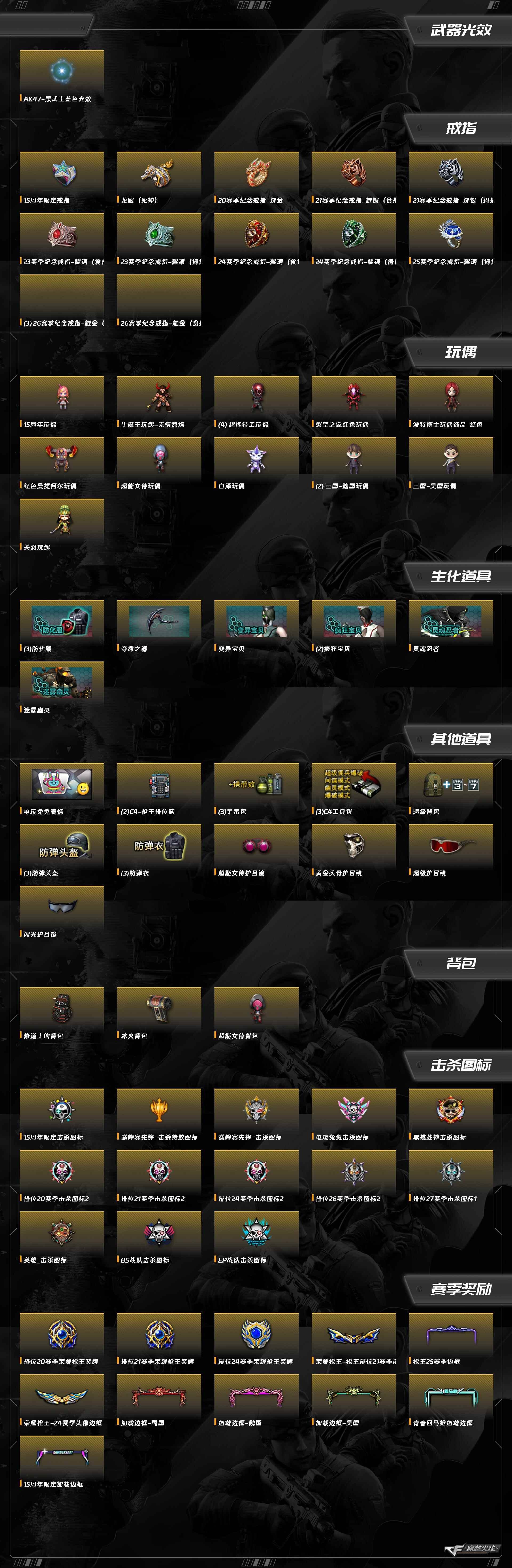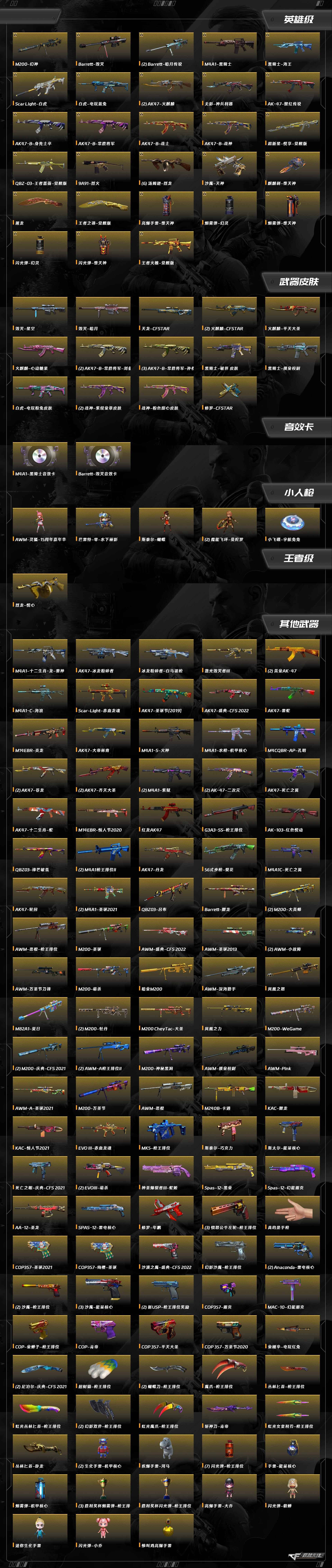M200-幻神,白虎-电玩蓝兔,Scar Light-白虎,AK47-火麒麟,AK47-B-战士,AK-47-猩红传说,AK47-B-战神,AK47-B-常胜将军,M4A1-黑骑士,黑骑士-海王,Barrett-毁灭,Barrett-暗月传说,9A91-烈火,汤姆逊-烈龙,沙鹰-天神,屠龙
