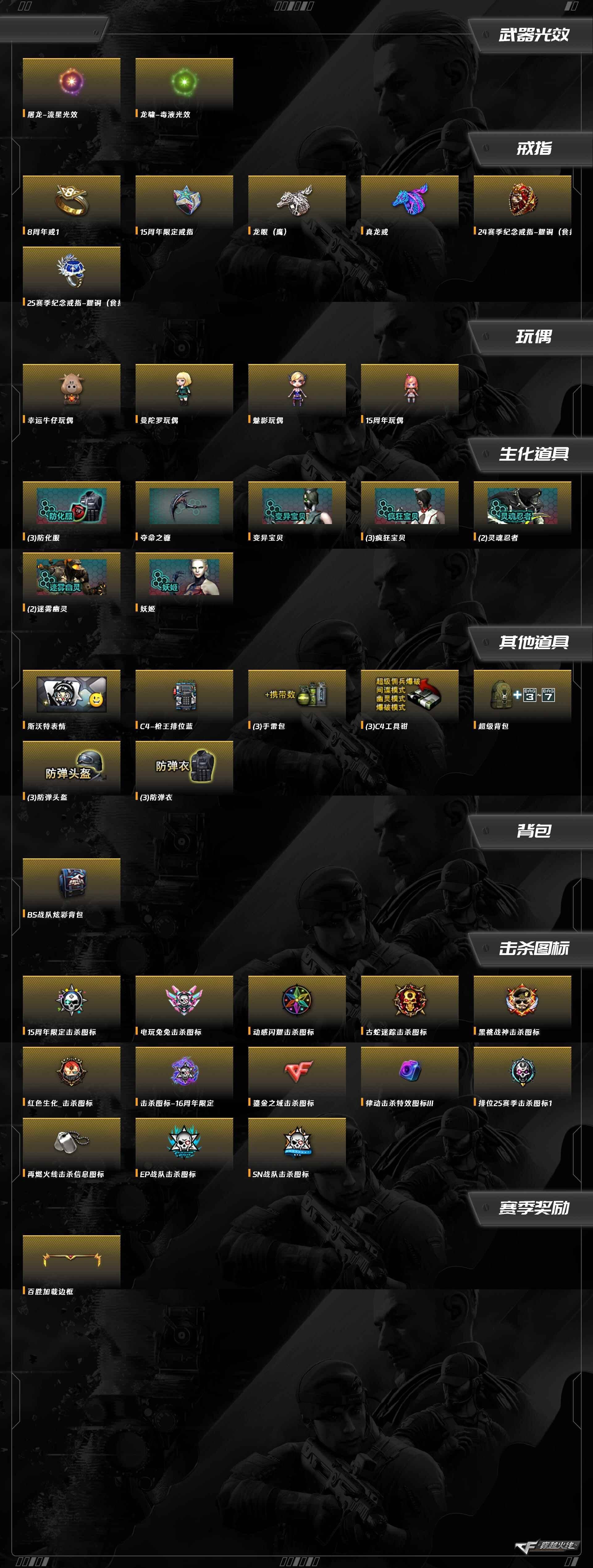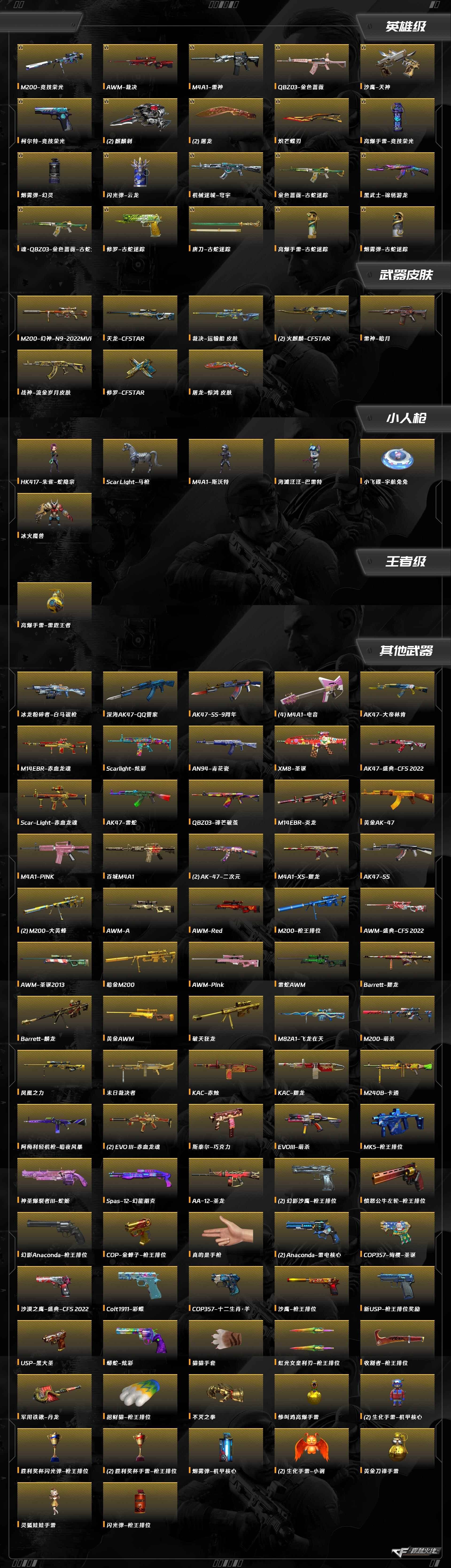 炽芒蝶刃,M200-竞技荣光,M4A1-雷神,AWM-裁决,QBZ03-金色蔷薇,柯尔特-竞技荣光,沙鹰-天神,屠龙,麒麟刺