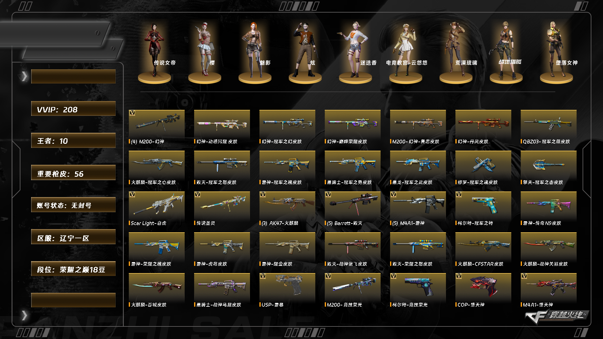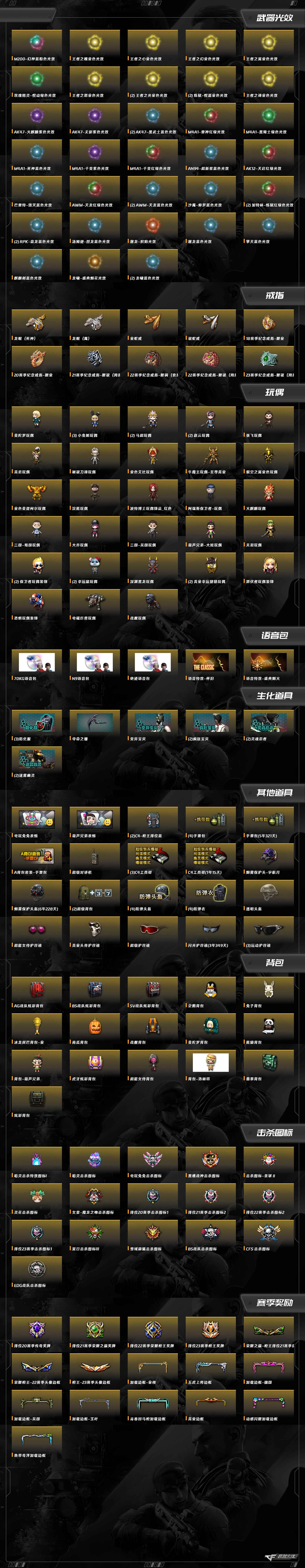 加特林-炼狱,Barrett-极光,Barrett-暗月传说,AWM-天龙,AWM-裁决,AA-12-雷霆,AK12-天启,AN94-超新星,QBZ03-金色蔷薇,9A91-烈火,RPK-盘龙,汤姆逊-烈龙,Barrett-毁灭,沙鹰-修罗,柯尔特-电竞装甲,擎天-竞技荣光,USP-雷暴,柯尔特-竞技荣光,沙鹰-天神,屠龙,龙啸,麒麟刺,擎天,幻灵之锋,AK-47-猩红传说,白虎-电玩蓝兔,柯尔特-冠军之特,传说圣灵,M200-竞技荣光,Scar Light-白虎,AK47-无影,AK47-火麒麟,AK47-黑鲨,AK47-黑武士,AK47-B-战士,AK47-机械迷城,M200-幻神,AK47-B-战神,AK47-B-常胜将军,M4A1-雷神,M4A1-黑骑士,M4A1-死神,M4A1-雷霆,M4A1-黑龙,M4A1-武圣,M4A1-堕天神,M4A1-猎神,M4A1-玫瑰精灵