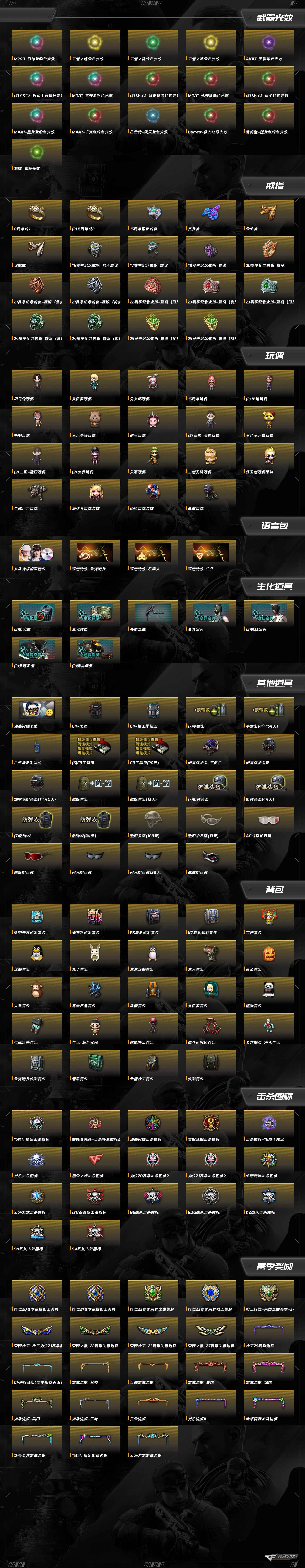 AN94-超新星,M4A1-雷霆,M4A1-黑龙,M4A1-龙血,M4A1-夜魔,M4A1-武圣,M4A1-千变,M4A1-玫瑰精灵,Barrett-毁灭,Barrett-朱雀,Barrett-暗月传说,AK12-天启,M4A1-黑骑士,QBZ03-金色蔷薇,9A91-烈火,加特林-炼狱,沙鹰-修罗,擎天-竞技荣光,USP-雷暴,柯尔特-竞技荣光,沙鹰-天神,屠龙,麒麟刺,擎天,Kar98k-星神,破空枪刃-夜魔,M200-幻神,QBZ03天罚,M4A1神工天巧,唐刀神工天巧,炽芒蝶刃,USP神工天巧,烈火-动感闪耀,屠龙-动感闪耀,天神-动感闪耀,M200-竞技荣光,擎天-云海游龙,Scar Light-白虎,AK47-无影,AK47-火麒麟,AK47-黑鲨,AK47-黑武士,AK47-机械迷城,AK-47-猩红传说,AK47-B-战神,AK47-B-常胜将军,M4A1-雷神