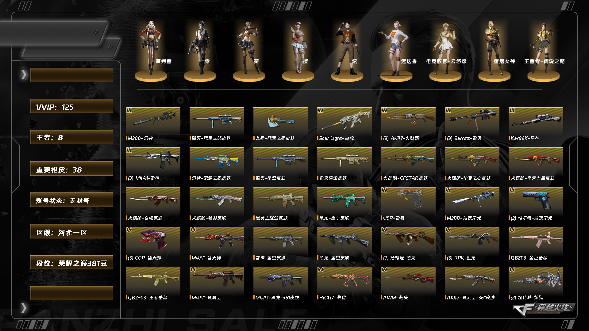 【C2530239530】[13132842]/北部/河北一区/可排位/【荣耀之巅381豆】/Lv.102 荣耀元帅/VIP6/125V/幻神/星神/M200竞技荣光套/白虎/朱雀/QBZ金色蔷薇/【未觉醒】QBZ王者蔷薇//堕天神套/USP雷暴/COP堕天神/COP雷霆/柯尔特竞技荣光/七套堕天神手雷/五套雷霆手雷/【生化】/6烈龙/3盘龙/2炼狱/4修罗/【皮肤音效卡】/毁灭冠军之怒/雷神荣耀之魄/雷神烈虎/雷神机甲刑天/黑龙墨子/龙啸冠军之啸/毁灭音效卡/极光音效卡/雷神音效卡/黑骑士音效卡/黑龙音效卡/火麒麟音效卡/【角色】/电竞教官云悠悠/审判者/零/葵/樱/炫/迷迭香/堕落女神/王者零传说之路/龙儿小淘气/零水下丽影/灵狐者黄金海岸///各种饰品、道具/【此账号封十年已解】