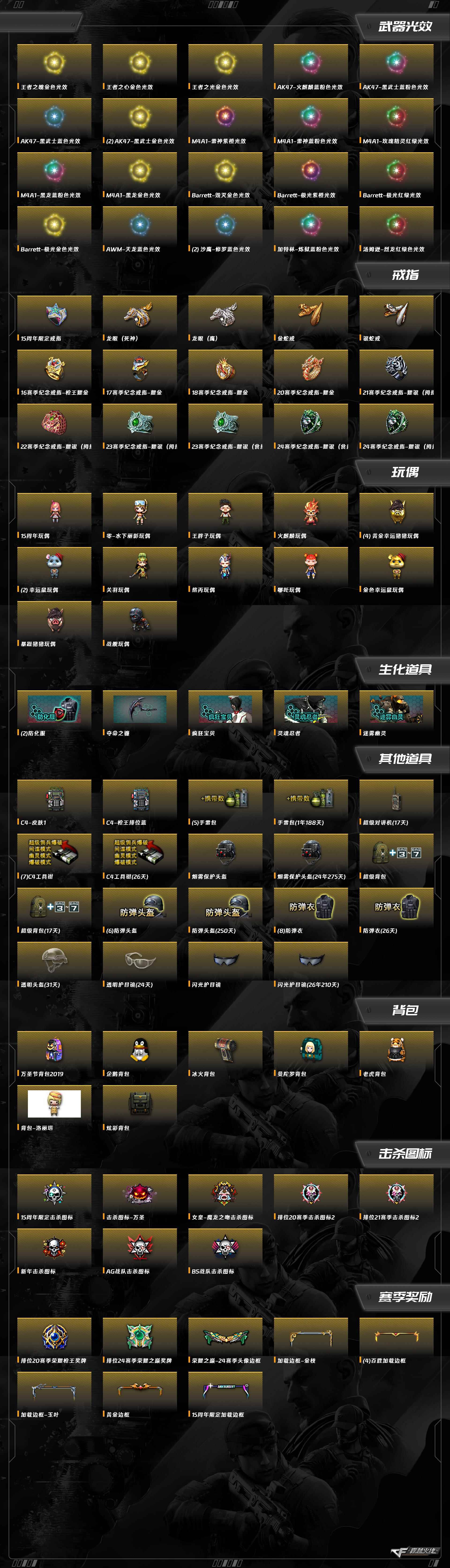 沙鹰-修罗,AK12-天启,AN94-超新星,HK417-朱雀,QBZ03-金色蔷薇,9A91-烈火,RPK-盘龙,汤姆逊-烈龙,加特林-炼狱,AA-12-雷霆,擎天-竞技荣光,USP-雷暴,柯尔特-竞技荣光,沙鹰-天神,屠龙,龙啸,麒麟刺,擎天,M4A1-雷神,M200-竞技荣光,Kar98k-星神,Scar Light-白虎,AK47-火麒麟,AK47-雷暴,AK47-黑鲨,AK47-黑武士,AK47-机械迷城,M200-幻神,M4A1-黑骑士,M4A1-死神,M4A1-黑龙,M4A1-堕天神,Barrett-毁灭,Barrett-极光,AWM-天龙,AWM-裁决