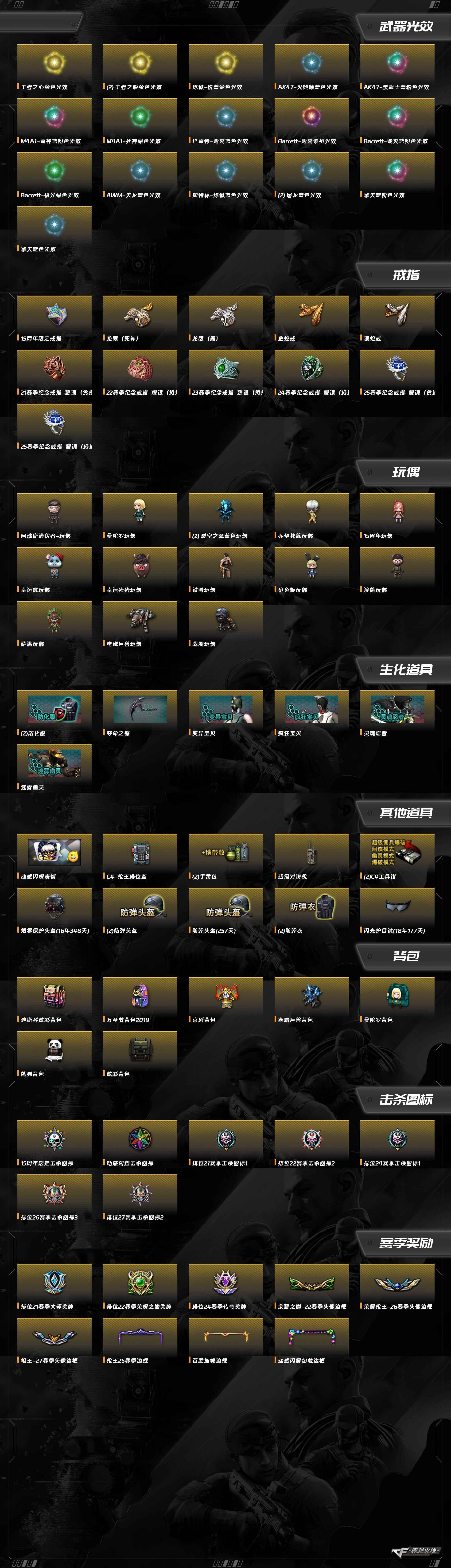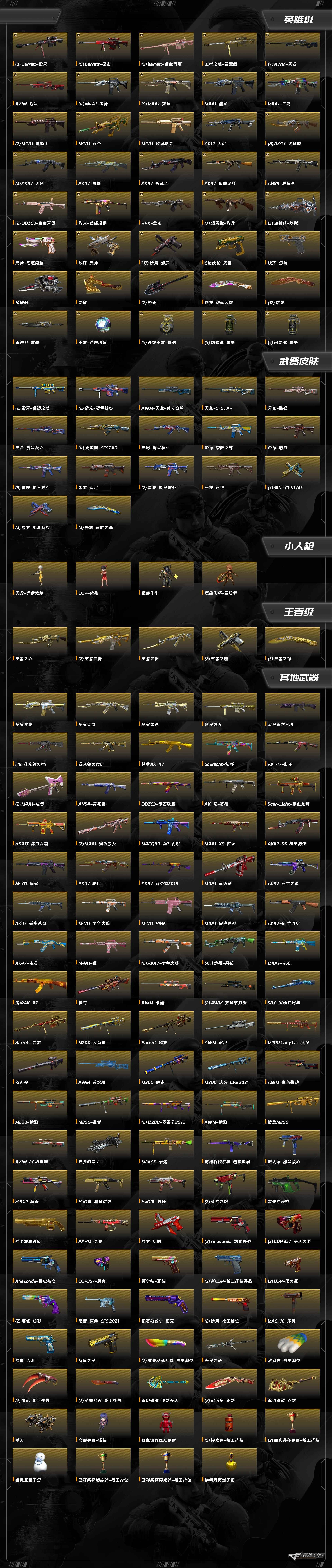 沙鹰-修罗,AWM-天龙,AWM-裁决,AK12-天启,AN94-超新星,QBZ03-金色蔷薇,RPK-盘龙,汤姆逊-烈龙,加特林-炼狱,Barrett-极光,USP-雷暴,沙鹰-天神,屠龙,龙啸,麒麟刺,擎天,斩神刀-雷暴,烈火-动感闪耀,Barrett-毁灭,M4A1-玫瑰精灵,M4A1-千变,M4A1-武圣,M4A1-黑龙,M4A1-死神,M4A1-黑骑士,M4A1-雷神,AK47-机械迷城,AK47-黑武士,AK47-雷暴,AK47-火麒麟,AK47-无影,天神-动感闪耀,屠龙-动感闪耀