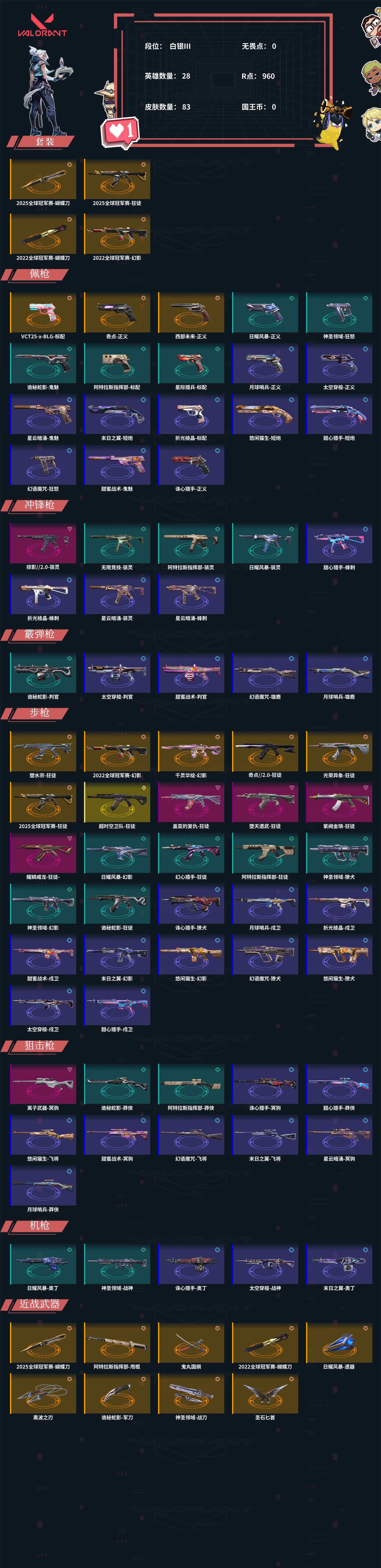 【C2530613089】皮肤资产:42840 皮肤数量:83 英雄数量:28 R点:960 段位: 白银III 套装 【2025全球冠军赛 礼包(2025全球冠军赛-蝴蝶刀,2025全球冠军赛-狂徒)】 【2022全球冠军赛 礼包(2022全球冠军赛-蝴蝶刀,2022全球冠军赛-幻影)】 狂徒【幻心猎手-狂徒,超时空卫队-狂徒,堕天遗武-狂徒,盖亚的复仇-狂徒,阿特拉斯指挥部-狂徒,光荣异象-狂徒,紫阙金琅-狂徒,奇点//2.0-狂徒,耀鳞威龙-狂徒-,诡秘蛇影-狂徒,塑水宗-狂徒】幻影【悠闲猫生-幻影,日耀风暴-幻影,末日之翼-幻影,千灵华绽-幻影,神圣领域-幻影】近战武器【阿特拉斯指挥部-甩棍,鬼丸国纲,日耀风暴-遗器,黑波之刃,诡秘蛇影-军刀,神圣领域-战刀,圣石匕首】正义【诛心猎手-正义,太空穿梭-正义,日耀风暴-正义,奇点-正义,西部未来-正义,月球哨兵-正义】冥驹【诛心猎手-冥驹,甜蜜战术-冥驹,星云暗涌-冥驹,离子武器-冥驹】鬼魅【甜蜜战术-鬼魅,诡秘蛇影-鬼魅,星云暗涌-鬼魅】骇灵【掠影//2.0-骇灵,无限竞技-骇灵,阿特拉斯指挥部-骇灵,日耀风暴-骇灵,星云暗涌-骇灵】标配【星际猎兵-标配,阿特拉斯指挥部-标配,折光棱晶-标配,VCT25-x-BLG-标配】短炮【甜心猎手-短炮,悠闲猫生-短炮,末日之翼-短炮】狂怒【幻语魔咒-狂怒,神圣领域-狂怒】蜂刺【甜心猎手-蜂刺,折光棱晶-蜂刺,星云暗涌-蜂刺】雄鹿【幻语魔咒-雄鹿,月球哨兵-雄鹿】判官【太空穿梭-判官,甜蜜战术-判官,诡秘蛇影-判官】獠犬【诛心猎手-獠犬,悠闲猫生-獠犬,幻语魔咒-獠犬,神圣领域-獠犬】戍卫【甜心猎手-戍卫,太空穿梭-戍卫,甜蜜战术-戍卫,折光棱晶-戍卫,月球哨兵-戍卫】飞将【悠闲猫生-飞将,幻语魔咒-飞将,末日之翼-飞将】战神【太空穿梭-战神,神圣领域-战神】奥丁【诛心猎手-奥丁,日耀风暴-奥丁,末日之翼-奥丁】莽侠【甜心猎手-莽侠,阿特拉斯指挥部-莽侠,诡秘蛇影-莽侠,月球哨兵-莽侠】