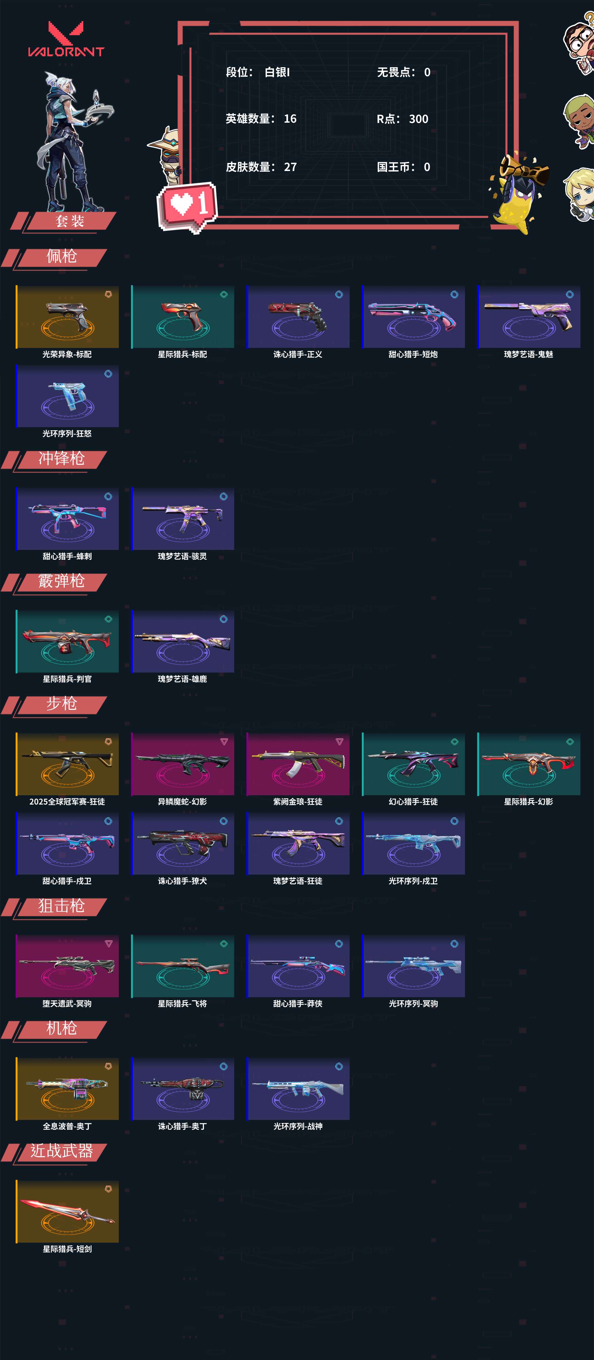 【C2530634445】皮肤资产:8940 皮肤数量:27 英雄数量:16 R点:300 段位: 白银I 狂徒【幻心猎手-狂徒,瑰梦艺语-狂徒,紫阙金琅-狂徒,2025全球冠军赛-狂徒】幻影【异鳞魔蛇-幻影,星际猎兵-幻影】冥驹【堕天遗武-冥驹,光环序列-冥驹】标配【光荣异象-标配,星际猎兵-标配】戍卫【甜心猎手-戍卫,光环序列-戍卫】奥丁【全息波普-奥丁,诛心猎手-奥丁】