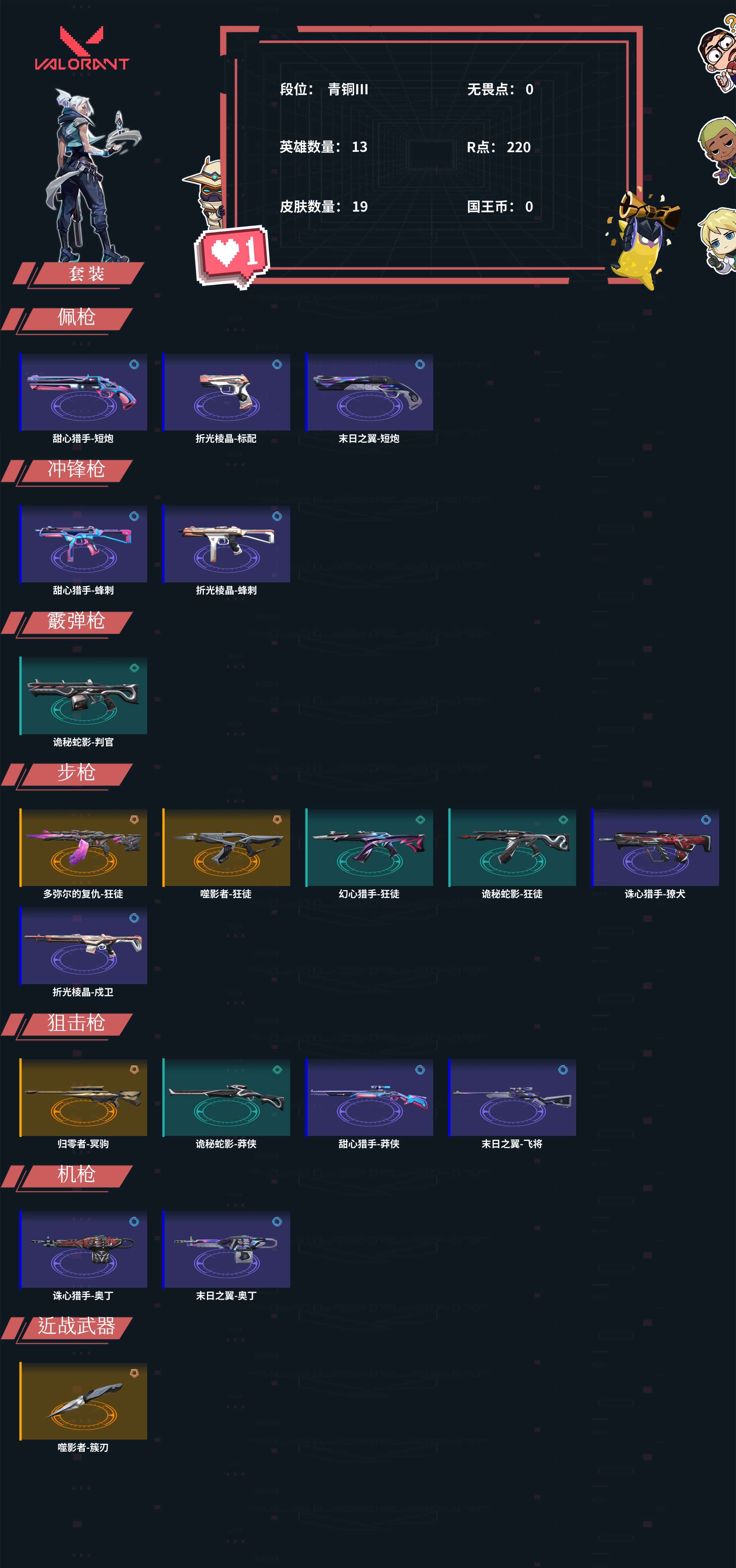 【C2530660234】皮肤资产:8550 皮肤数量:19 英雄数量:13 R点:220 段位: 青铜III 狂徒【幻心猎手-狂徒,多弥尔的复仇-狂徒,诡秘蛇影-狂徒,噬影者-狂徒】短炮【甜心猎手-短炮,末日之翼-短炮】蜂刺【甜心猎手-蜂刺,折光棱晶-蜂刺】奥丁【诛心猎手-奥丁,末日之翼-奥丁】莽侠【甜心猎手-莽侠,诡秘蛇影-莽侠】