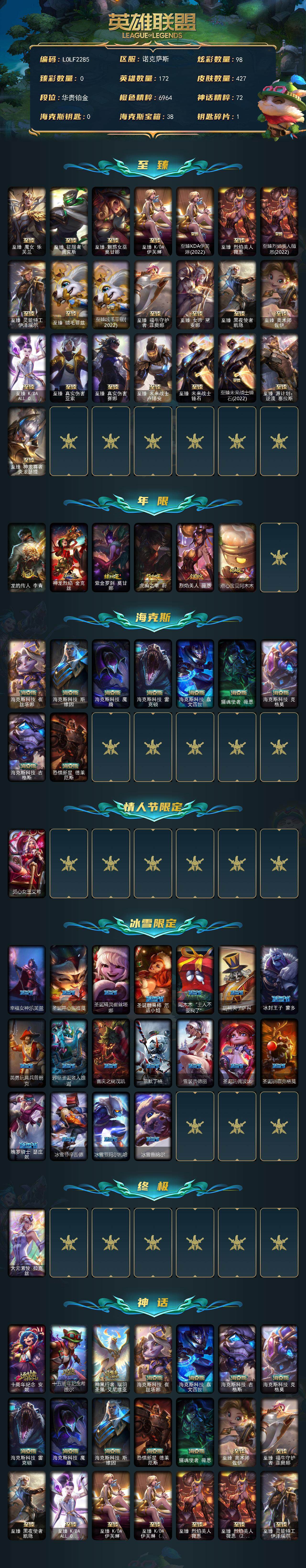 【C2532908775】【LOLF2285】172英雄/427皮肤/1终极/34神话/66限定/98炫彩/49传说/103史诗/铂金/至臻魔女乐芙兰/至臻征服者贾克斯/至臻魅惑女巫莫甘娜/至臻K/DA伊芙琳/至臻KDA伊芙琳(2022)/至臻烈焰美人薇恩/至臻烈焰美人薇恩(2022)/至臻灵能特工伊泽瑞尔/至臻绒毛菲兹/至臻绒毛菲兹(2022)/至臻福牛守护者菲奥娜/至臻女帝黛安娜/至臻黑夜使者凯影/至臻奥术师佐伊/至臻K/DA ALL OUT卡莎/至臻真实伤害亚索/至臻真实伤害赛娜/至臻未来战士卢锡安/至臻未来战士锤石/至臻未来战士锤石(2022)/至臻源计划:逆流塞拉斯/至臻神龙尊者炎龙瑟提/龙的传人李青/神龙烈焰金克丝/紫金罗刹莫甘娜/虎痴之拳蔚/烈焰美人薇恩/点心宝贝阿木木/海克斯科技崔丝塔娜/海克斯科技斯维因/海克斯科技魔腾/海克斯科技雷克顿/海克斯科技嘉文四世/摄魂使者薇恩/海克斯科技克格莫/海克斯科技吉格斯/恐惧新星德莱厄斯/觅心女皇艾希/幸福女神乐芙兰/圣诞开心鬼提莫/圣诞精灵崔丝塔娜/圣诞糖果棒厄运小姐/阿木木“主人不要我了”/胡桃夹子萨科/冰封王子蒙多/英勇玩具兵普朗克/邪恶圣诞老人维迦/喜庆之树茂凯/雪默丁格/雪装奈德丽/圣诞玩偶波比/圣诞驯鹿克格莫/魄罗骑士瑟庄妮/冰雪节辛吉德/冰雪节玛尔扎哈/冰雪兽纳尔/大元素使拉克丝/十周年纪念安妮/十五周年纪念希维尔/神凰行者瑞羽圣凰艾尼维亚/至臻KDAALLOUT卡莎/至臻KDA伊芙琳/至臻KDA伊芙琳2022/至臻烈焰美人薇恩2022/至臻绒毛菲兹2022/至臻未来战士锤石2022/至臻源计划逆流塞拉斯/创星之灵璐璐/送披萨的小姐姐希维尔/冠军之血希瓦娜/Fnatic嘉文四世/暗杀星蒙多/SKTT1薇恩/SSW辛吉德/SSW图奇/SSW泰隆/SSW雷恩加尔/SSW锤石/SKTT1卡莉丝塔/SKTT1娜美/SSG嘉文四世/iG卡莎/FPX薇恩/安妮梦游仙境/电玩勇者锐雯/玉剑传说无影/神凰行者烈羽焰凰霞/暗裔英雄盖伦/胜利女神希维尔/胜利之树茂凯/胜利之剑亚托克斯/胜利女神菲奥娜/南瓜头费德提克/大魔法锅布里茨/鬼影重重魔腾/死亡誓约维克托/泳池派对格雷福斯/泳池派对凯特琳/密林猎手提莫/野兽猎人德莱文/野兽猎人泰达米尔/勇者奈德丽/御星魔矢艾希/征服者韦鲁斯/制胜金球拉莫斯/防暴士兵辛吉德/防暴天使凯尔/警用试作体K9内瑟斯/地狱之门卫士加里奥/邪鸦魅影乐芙兰/大天使长米迦勒凯尔/战场女武神凯尔/源计划林易/约德尔国队长提莫/烈焰雄心崔丝塔娜/驯龙炮手崔丝塔娜/源计划联合艾希/恶魔之刃泰达米尔/战地巨兽科加斯/双重冰晶艾尼维亚/黯晶凤凰艾尼维亚/律政大亨蒙多/电玩女神娑娜/冰霜之刃艾瑞莉娅/最终BOSS维迦/女警狙击凯特琳/未来战士凯特琳/战斗学院凯特琳/地狱行者孙悟空/光明哨兵薇恩/第三类接触黑默丁格/屠龙勇士潘森/腥红之月鬼武姬阿卡丽/死亡骑士盖伦/钢铁军团盖伦/神王盖伦/黎明使者锐雯/星之守护者拉克丝/黯黑魔龙希瓦娜/焰尾妖狐阿狸/星之守护者阿狸/灵魂莲华阿狸/苍穹之光韦鲁斯/宇航员诺提勒斯/女校长菲奥娜/泳池派对吉格斯/金牌主播德莱文/霸天异形卡兹克/灌篮高手德莱厄斯/蔷薇绅士杰斯/黑夜使者亚索/神龙尊者昼日真龙亚索/星之守护者金克丝/西部天使赛娜/西部魔影卢锡安/真实伤害艾克/星之守护者霞/安伯斯与提妮/皇家火枪手崔斯特/绞肉机角斗士赵信/翼骑统领赵信/摄魂男爵弗拉基米尔/地狱火阿利斯塔/战争机器赛恩/战场公主希维尔/钢铁之心希维尔/圣洁化身索拉卡/源代码索拉卡/兔宝宝提莫/火牙狼人沃里克/荒野豺狼沃里克/黑帮狂花厄运小姐/国王泰达米尔/百夫长贾克斯/刀锋女王莫甘娜/炼金狂士辛吉德/死神卡尔萨斯/小小骑士阿木木/熔火之心拉莫斯/贵族血统萨科/飞越疯人院萨科/五杀摇滚键盘手娑娜/掠星魔刃卡萨丁/夜刃艾瑞莉娅/海克斯科技迦娜/穿着正装的恶魔维迦/北领前线斯维因/绝代智将斯维因/古墓丽影凯特琳/黑曜石守护者墨菲特/霸天巨兽墨菲特/暗夜猫女卡特琳娜/源计划雄心卡特琳娜/蓝焰梦魔魔腾/符文战神雷克顿/腥红之月伊莉丝/灵骨工匠奥莉安娜/三昧真火孙悟空/V字仇杀者布兰德/冰晶之核布兰德/防弹武僧李青/至高之拳李青/屠龙勇士薇恩/苍穹之光薇恩/深海妖姬卡西奥佩娅/战地机甲斯卡纳/生化博士黑默丁格/四神之力乌迪尔/军神战甲波比/飞车暴走族古拉加斯/钢铁意志潘森/大夏武士潘森/刺客信条凯南/腥红之月凯南/孤高游侠盖伦/钢铁烈阳蕾欧娜/至高君王玛尔扎哈/腥红之月泰隆/帝王斑蝶克格莫/深海怪鱼克格莫/战国大名慎/ODST地狱伞兵拉克丝/沙之守护泽拉斯/钢之逆鳞希瓦娜/黑帮教父格雷福斯/银河魔装机神菲兹/铁血猎人雷恩加尔/暗黑武士雷恩加尔/夜鸦菲奥娜/奥术大师吉格斯/绞肉机刽子手德莱文/永恒之森赫卡里姆/生化骑士德莱厄斯/天启骑士杰斯/源代码丽桑卓/暗黑女武神黛安娜/血羽凤凰奎因/野火之藤婕拉/驯龙女巫婕拉/邪恶魔人扎克/西部牛仔亚索/源计划风亚索/腥红之月亚索/战地机甲维克兹/苍穹之光维克兹/源代码卡蜜尔/猛虎布隆/腥红之月烬/黯焰双魂千珏/黑帮狂花金克丝/源计划雷卢锡安/源计划阴劫/爵士克烈/源计划自由艾克/霓虹杀拳蔚/霸天剑魔亚托克斯/星际之门阿兹尔/虚空使者俄洛伊/糖果之王艾翁/永恒之森巴德/五杀摇滚鼓手奥拉夫/孤胆英豪嘉文四世/霹雳游侠弗拉基米尔/死亡骑士内瑟斯/西部牛仔崔斯特/战地之王加里奥/拆弹专家黑默丁格/冰河时代奥拉夫/亮丽女神希维尔/