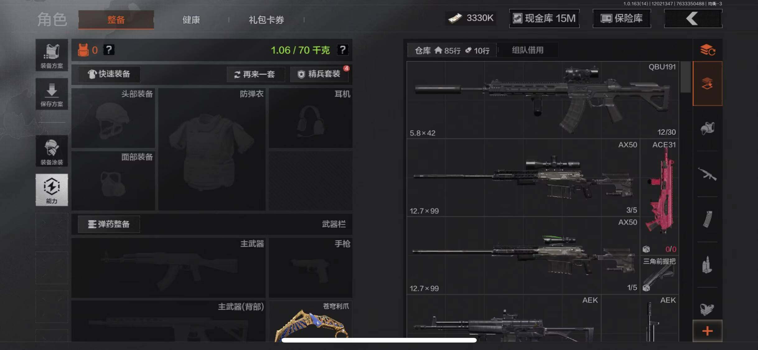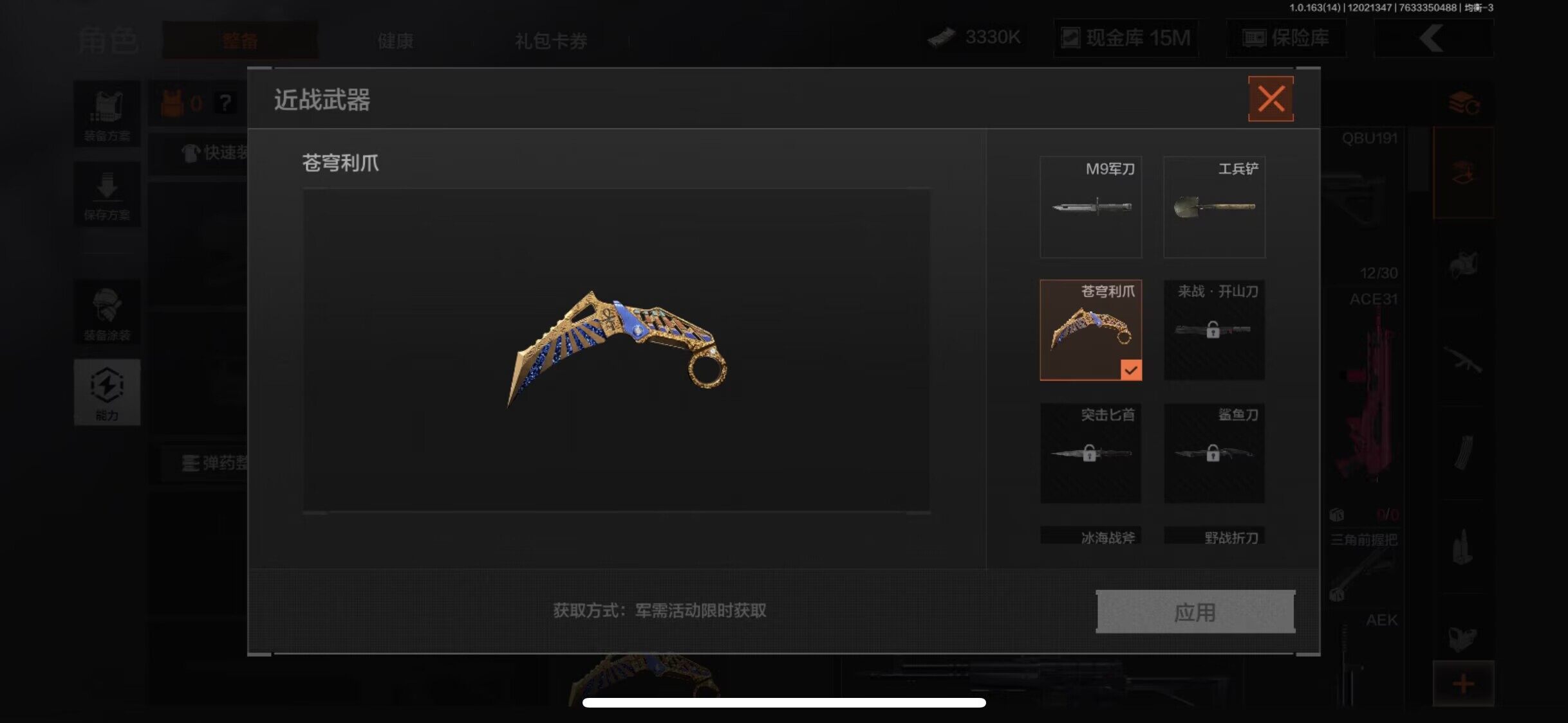 【C2533560769】【AQD39】等级:30/段位:王牌/仓库价值(百万):22.6/柯恩币:3330/苍穹利爪/工兵铲