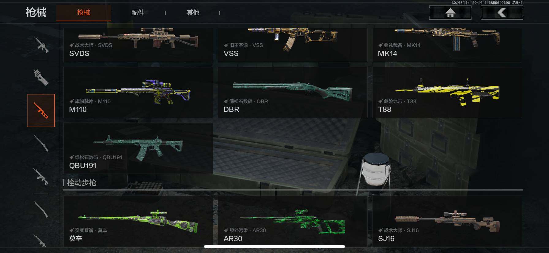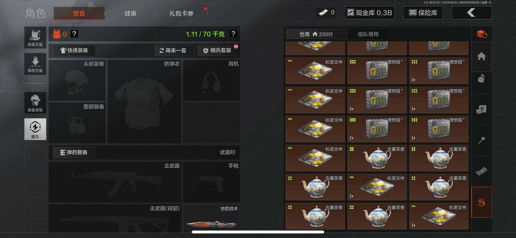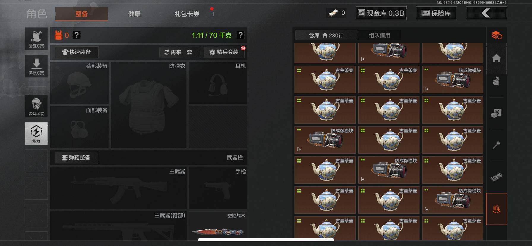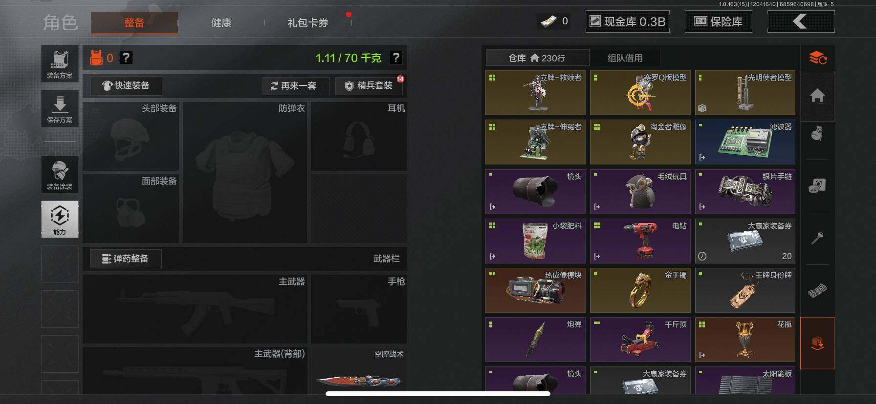 【C2533719311】【SJZG2306】等级:30/段位:王牌/仓库价值(百万):461/柯恩币:326294965/空腔战术/来战·开山刀/工兵铲/寒牙手刺/使徒欧瑞恩/绅士西服/生物危害M4A1/竞技FAL/蓝色咆哮H416/告丧夜曲AUG/告丧夜曲AR57/战术大师AEK/旗帜AEK/浮鳞影青QBZ192/旧王圣谕VSS