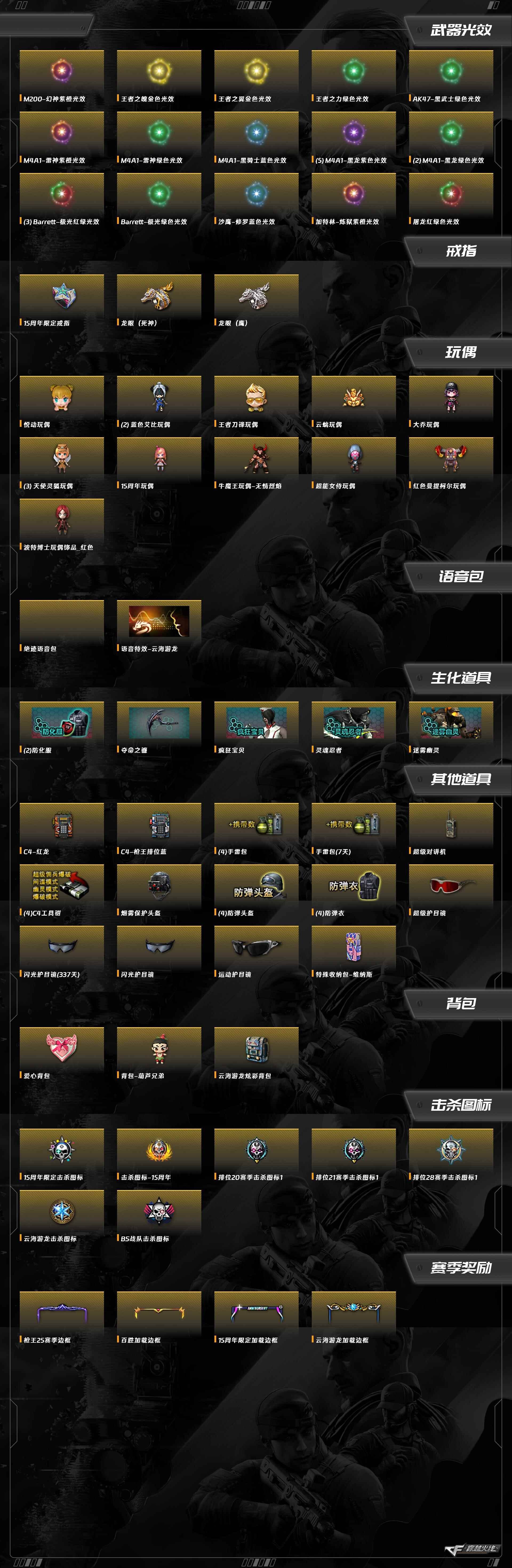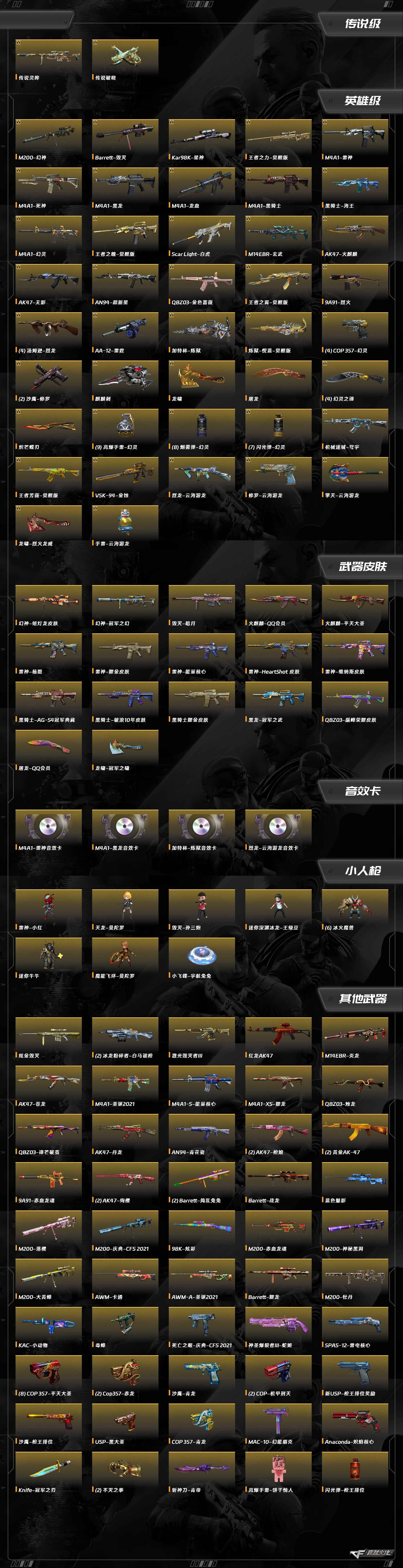 M4A1-死神,幻灵之锋,麒麟刺,龙啸,屠龙,沙鹰-修罗,加特林-炼狱,汤姆逊-烈龙,9A91-烈火,QBZ03-金色蔷薇,AN94-超新星,AA-12-雷霆,Barrett-毁灭,M4A1-幻灵,M4A1-龙血,M4A1-黑龙,擎天-云海游龙,黑骑士-海王,M4A1-黑骑士,M4A1-雷神,AK47-火麒麟,AK47-无影,Scar Light-白虎,Kar98k-星神,传说破晓,VSK-94-金蚀,龙啸-烈火龙威,修罗-云海游龙,传说灵眸,炽芒蝶刃,M14EBR-玄武,M200-幻神