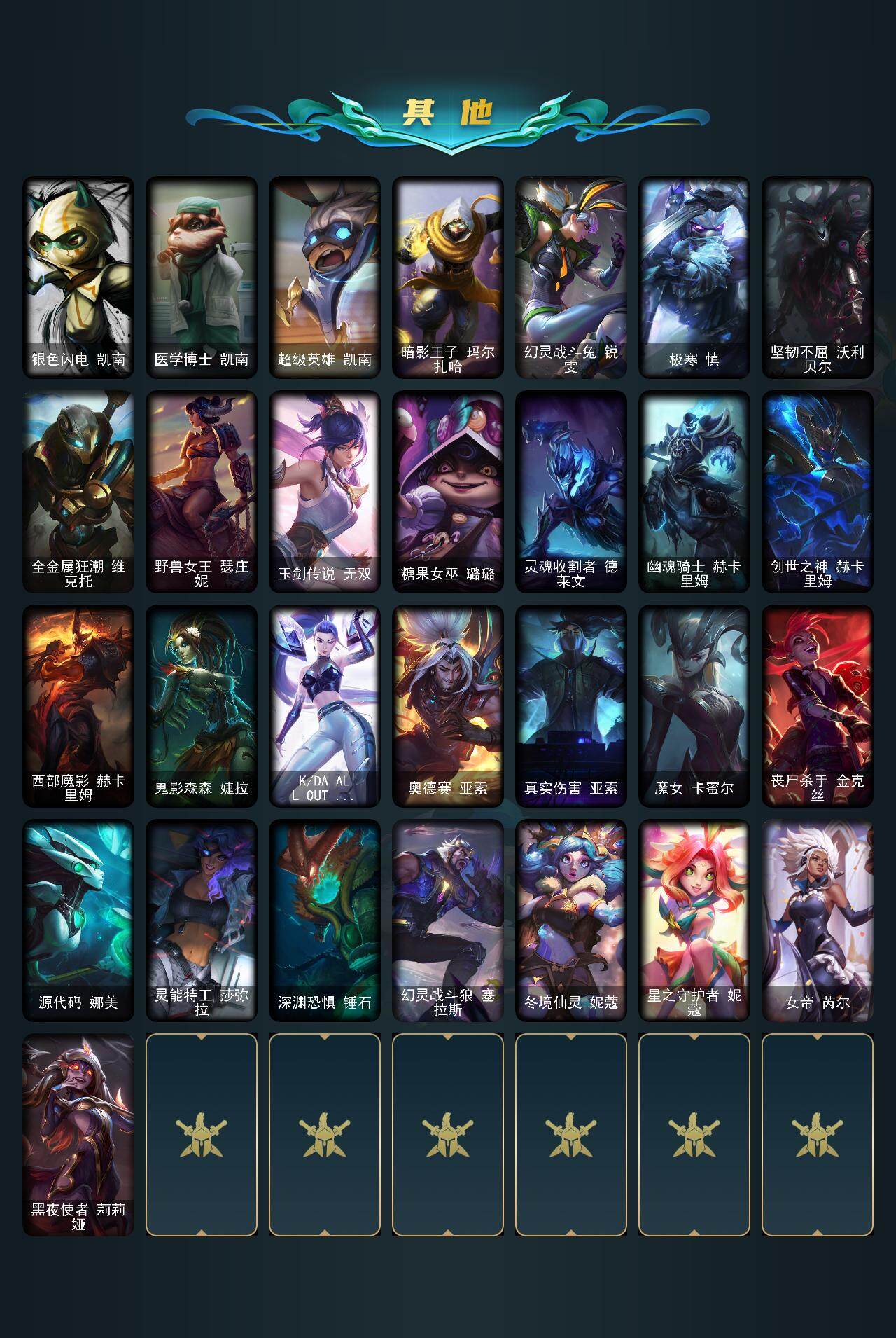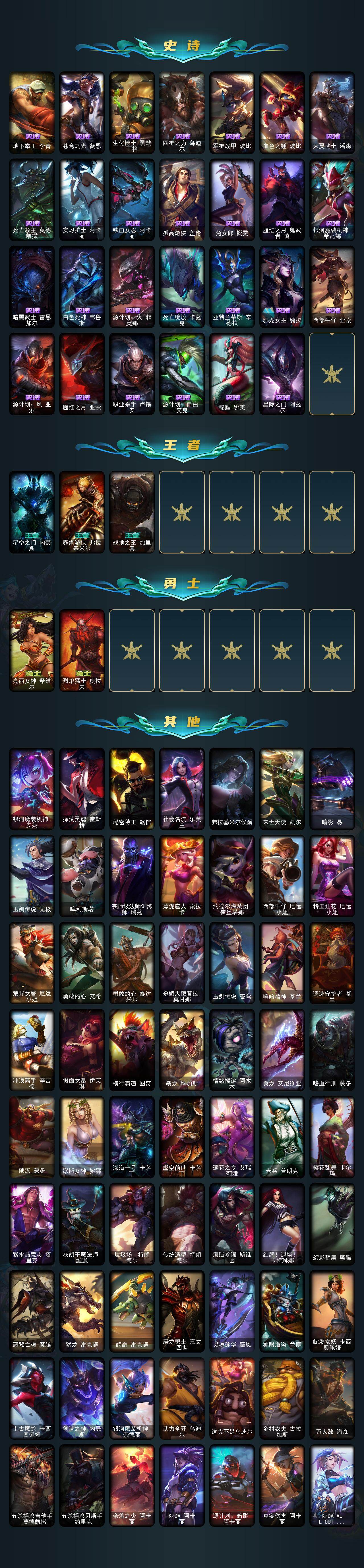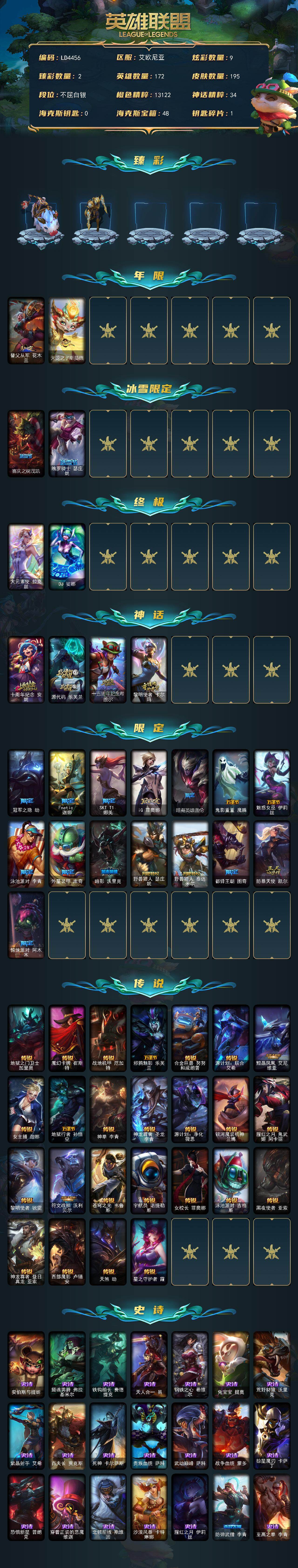 【C2534340243】【LD4456】172英雄/195皮肤/2终极/4神话/19限定/2臻彩/9炫彩/25传说/48史诗/白银/无畏骑士瑟庄妮赤子初心/冠军之隐劫凯旋圣装/替父从军花木兰/天龙之子斯莫德/喜庆之树茂凯/魄罗骑士瑟庄妮/大元素使拉克丝/DJ娑娜/十周年纪念安妮/源代码乐芙兰/十五周年纪念希维尔/黎明使者卡尔玛/冠军之隐劫/Fnatic迦娜/SKTT1娜美/iG菲奥娜/暗裔英雄盖伦/鬼影重重魔腾/魅惑女巫伊莉丝/泳池派对李青/外星装甲库奇/暗影沃里克/野兽猎人瑟庄妮/野兽猎人泰达米尔/都铎王朝图奇/防暴天使凯尔/惊悚派对阿木木/地狱之门卫士加里奥/魔幻卡牌崔斯特/战地机甲厄加特/邪鸦魅影乐芙兰/合金巨兽努努和威朗普/源计划联合艾希/黯晶凤凰艾尼维亚/女主播迦娜/地狱行者孙悟空/神拳李青/神龙尊者圣龙李青/源计划净化薇恩/银河魔装机神兰博/腥红之月鬼武姬阿卡丽/黎明使者锐雯/符文战熊沃利贝尔/苍穹之光韦鲁斯/宇航员诺提勒斯/女校长菲奥娜/泳池派对吉格斯/黑夜使者亚索/神龙尊者昼日真龙亚索/西部魔影卢锡安/天煞劫/星之守护者霞/安伯斯与提妮/摄魂男爵弗拉基米尔/铁钩船长费德提克/天人合一易/钢铁之心希维尔/兔宝宝提莫/荒野豺狼沃里克/紫晶射手艾希/百夫长贾克斯/死神卡尔萨斯/贵族血统萨科/武动巅峰萨科/战争血统蒙多/掠星魔刃卡萨丁/恐惧新星普朗克/穿着正装的恶魔维迦/北领前线斯维因/沙漠风暴卡特琳娜/腥红之月伊莉丝/防弹武僧李青/至高之拳李青/地下拳王李青/苍穹之光薇恩/生化博士黑默丁格/四神之力乌迪尔/军神战甲波比/血色之锤波比/大夏武士潘森/死亡领主莫德凯撒/实习护士阿卡丽/铁血女忍阿卡丽/孤高游侠盖伦/兔女郎锐雯/腥红之月鬼武者慎/银河魔装机神希瓦娜/暗黑武士雷恩加尔/白色死神韦鲁斯/源计划火菲奥娜/死亡绽放卡兹克/亚特兰蒂斯辛德拉/驯龙女巫婕拉/西部牛仔亚索/源计划风亚索/腥红之月亚索/职业杀手卢锡安/源计划自由艾克/锦鲤娜美/星际之门阿兹尔/星空之门内瑟斯/霹雳游侠弗拉基米尔/战地之王加里奥/亮丽女神希维尔/烈焰猛士奥拉夫/银河魔装机神安妮/探戈灵魂崔斯特/秘密特工赵信/社会名流乐芙兰/弗拉基米尔侯爵/末世天使凯尔/暗影易/玉剑传说无极/哞利斯塔/宗师级法师训练师瑞兹/蕉泥座人索拉卡/约德尔海贼团崔丝塔娜/西部牛仔厄运小姐/特工狂花厄运小姐/荒野女警厄运小姐/勇敢的心艾希/勇敢的心泰达米尔/杀戮天使昔拉莫甘娜/玉剑传说苍鸾/嘻哈精神基兰/遗迹守护者基兰/冲浪高手辛吉德/假面女皇伊芙琳/横行霸道图奇/暴龙科加斯/情绪摇滚阿木木/翼龙艾尼维亚/嗜血行刑蒙多/硬汉蒙多/缪斯女神娑娜/深海一号卡萨丁/虚空前世卡萨丁/莲花之令艾瑞莉娅/老兵普朗克/樱花乱舞卡尔玛/紫水晶意志塔里克/灰胡子魔法师维迦/垃圾场特朗德尔/传统造型特朗德尔/海贼参谋斯维因/红牌退场卡特琳娜/幻影梦魔魔腾/恶咒亡魂魔腾/猛龙雷克顿/鳄霸雷克顿/屠龙勇士嘉文四世/灵魂莲华薇恩/独眼海盗兰博/蛇发女妖卡西奥佩娅/上古魔蛇卡西奥佩娅/创世之神内瑟斯/银河魔装机神奈德丽/武力全开乌迪尔/这货不是乌迪尔/乡村农夫古拉加斯/万人敌潘森/五杀摇滚吉他手莫德凯撒/五杀摇滚贝斯手约里克/奈落之炎阿卡丽/KDA阿卡丽/源计划暗影阿卡丽/真实伤害阿卡丽/KDAALLOUT阿卡丽/银色闪电凯南/医学博士凯南/超级英雄凯南/暗影王子玛尔扎哈/幻灵战斗兔锐雯/极寒慎/坚韧不屈沃利贝尔/全金属狂潮维克托/野兽女王瑟庄妮/玉剑传说无双/糖果女巫璐璐/灵魂收割者德莱文/幽魂骑士赫卡里姆/创世之神赫卡里姆/西部魔影赫卡里姆/鬼影森森婕拉/KDAALLOUT卡莎/奥德赛亚索/真实伤害亚索/魔女卡蜜尔/丧尸杀手金克丝/源代码娜美/灵能特工莎弥拉/深渊恐惧锤石/幻灵战斗狼塞拉斯/冬境仙灵妮蔻/星之守护者妮蔻/女帝芮尔/黑夜使者莉莉娅