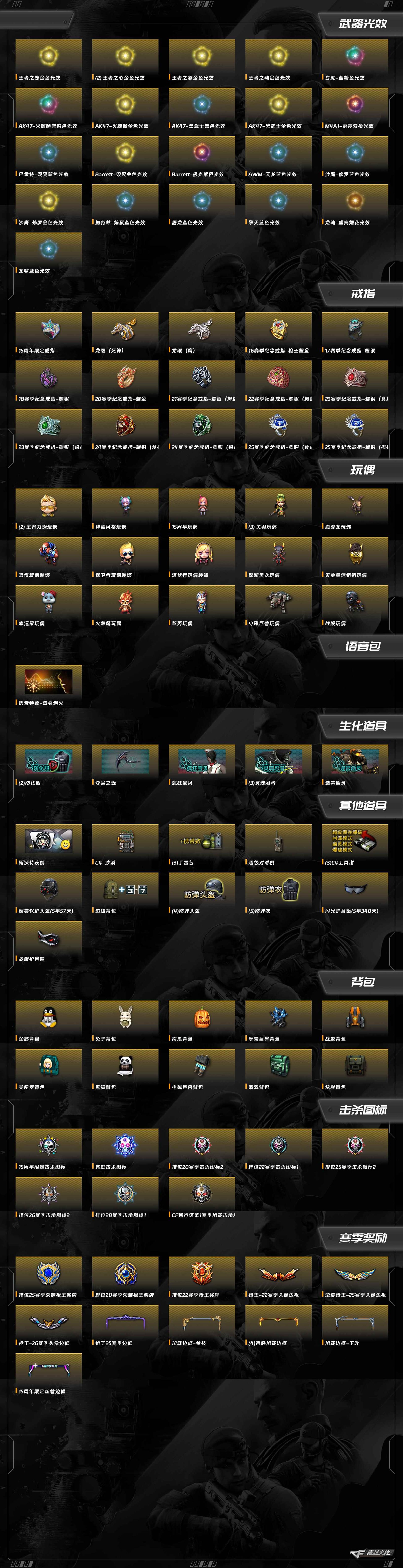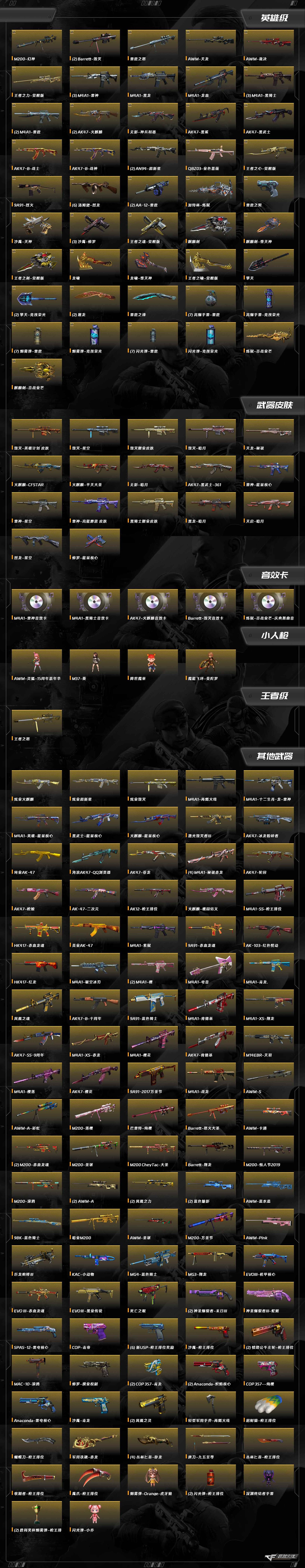 AWM-裁决,擎天,麒麟刺,龙啸,屠龙,沙鹰-天神,擎天-竞技荣光,沙鹰-修罗,加特林-炼狱,汤姆逊-烈龙,9A91-烈火,QBZ03-金色蔷薇,AN94-超新星,AA-12-雷霆,M200-幻神,AWM-天龙,Barrett-毁灭,M4A1-龙血,M4A1-黑龙,M4A1-雷霆,M4A1-黑骑士,M4A1-雷神,AK47-B-战神,AK47-B-战士,AK47-黑武士,AK47-黑鲨,AK47-火麒麟