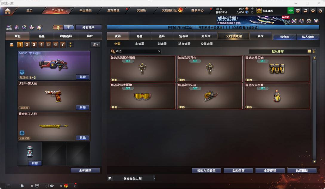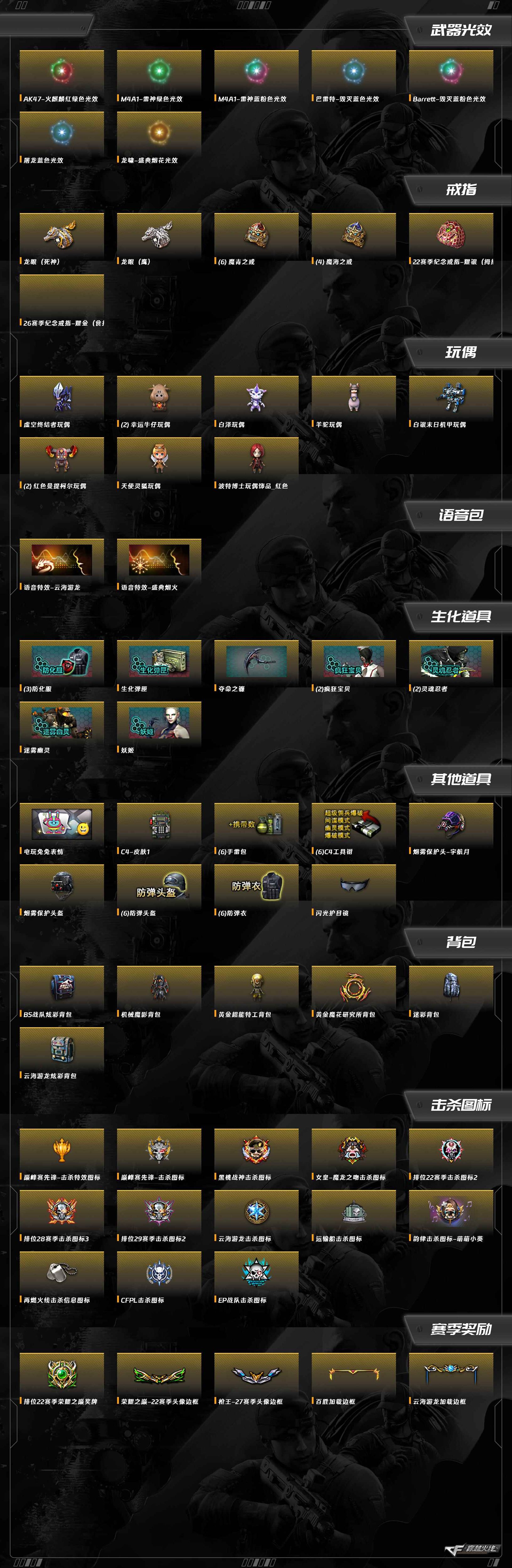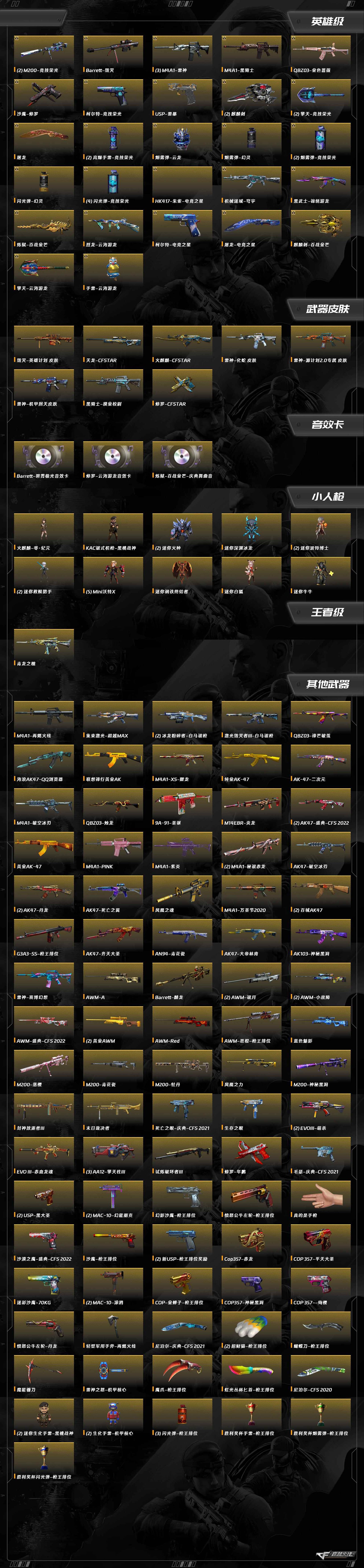 擎天-云海游龙,M200-竞技荣光,M4A1-雷神,M4A1-黑骑士,Barrett-毁灭,QBZ03-金色蔷薇,沙鹰-修罗,擎天-竞技荣光,USP-雷暴,柯尔特-竞技荣光,屠龙,麒麟刺