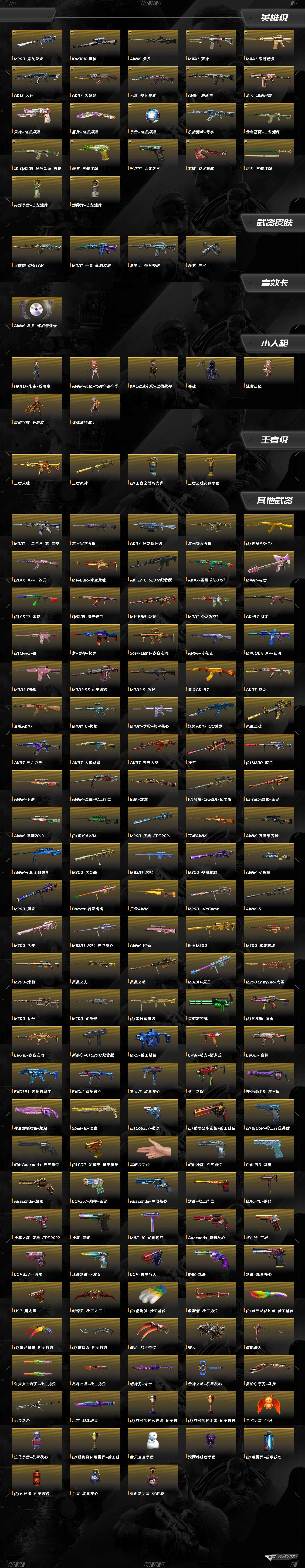 烈火-动感闪耀,屠龙-动感闪耀,天神-动感闪耀,龙啸-烈火龙威,M200-竞技荣光,Kar98k-星神,AK47-火麒麟,M4A1-死神,M4A1-玫瑰精灵,AWM-天龙,AK12-天启,AN94-超新星