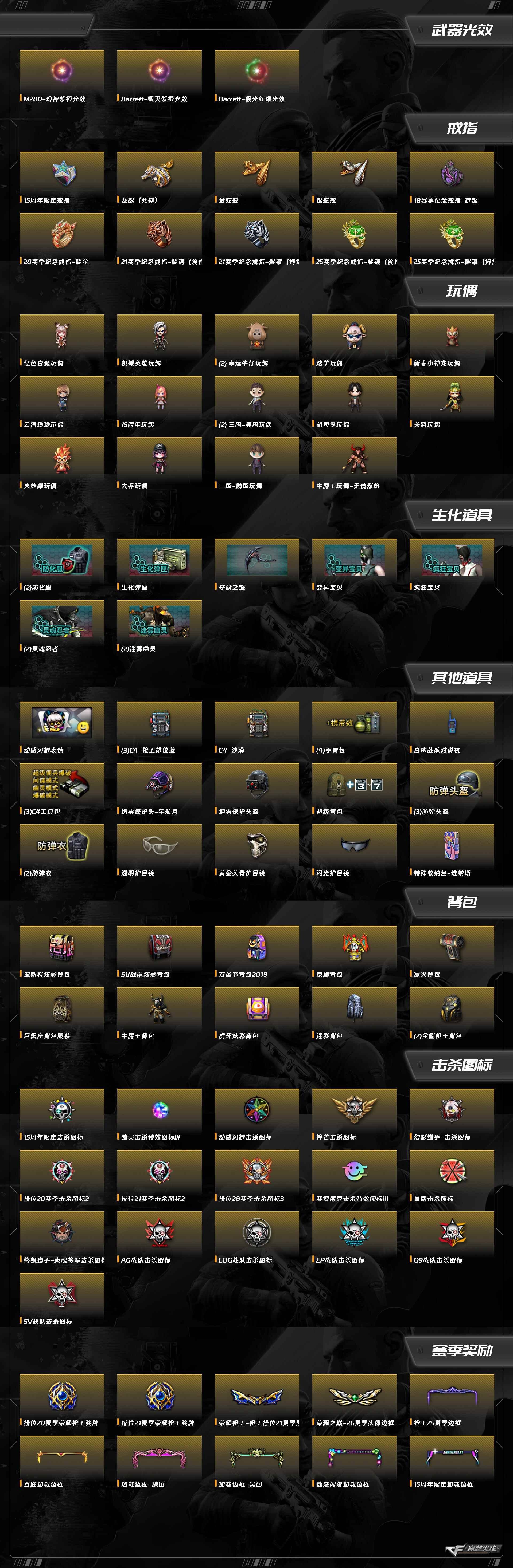 黑骑士-海王,幻灵之锋,屠龙,柯尔特-竞技荣光,USP-雷暴,擎天-竞技荣光,沙鹰-修罗,QBZ03-金色蔷薇,Barrett-暗月传说,Barrett-极光,Barrett-毁灭,M4A1-死神,M200-幻神,M4A1-黑骑士,M4A1-雷神,AK47-B-常胜将军,AK-47-猩红传说,AK47-B-战士,AK47-火麒麟,M200-竞技荣光,龙啸-烈火龙威,天神-动感闪耀,屠龙-动感闪耀,烈火-动感闪耀