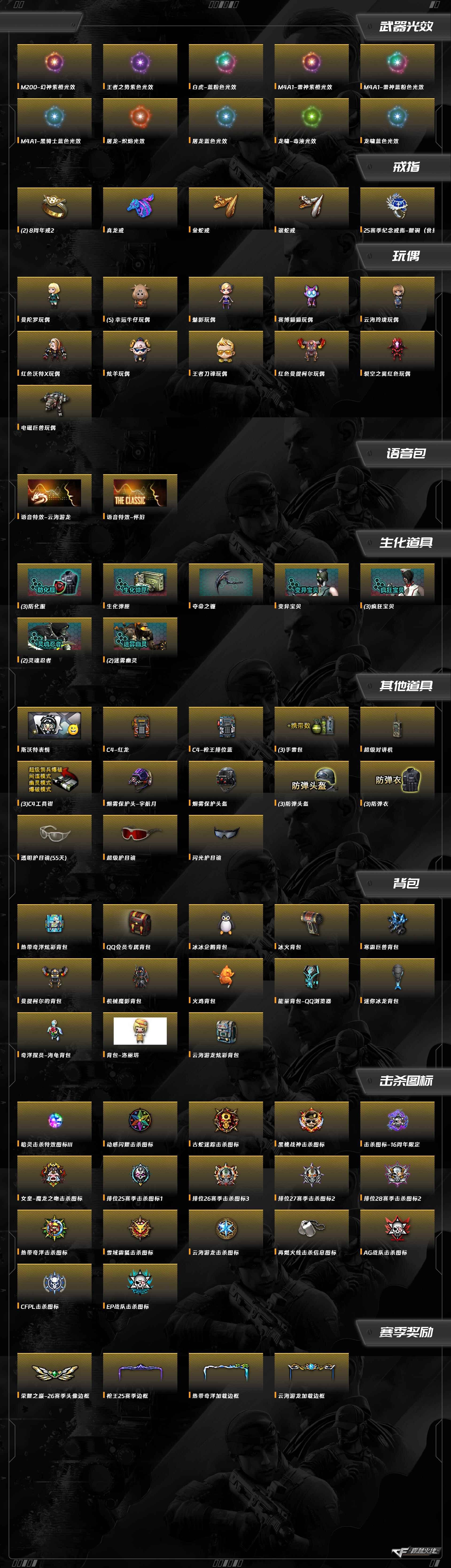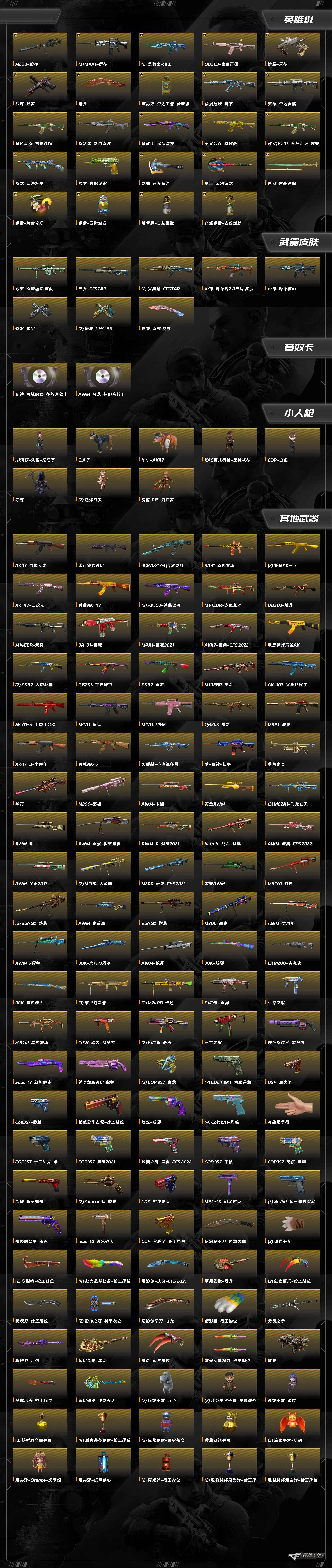 擎天-云海游龙,M200-幻神,M4A1-雷神,黑骑士-海王,QBZ03-金色蔷薇,沙鹰-修罗,沙鹰-天神,屠龙