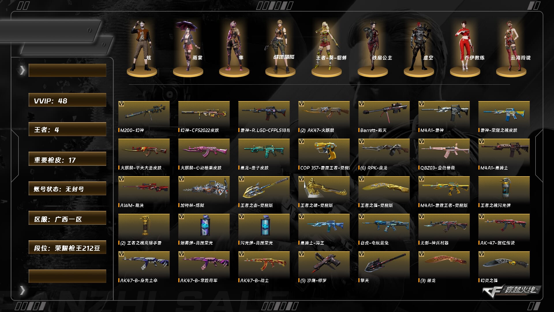 【C2535917331】[14917665]XH9443/南部/广西一区/可排位/【荣耀枪王212豆】【Lv.102 荣耀元帅】VIP6/47V/幻神/幻神动感闪耀音效卡/幻神CFS2022/幻神电竞之星/QBZ金色蔷薇/QBZ金色蔷薇音效卡/G36C幻影/白虎电玩蓝兔/朱雀电竞之星/6盘龙/COP雷霆王者/5修罗/炽芒蝶刃/【皮肤音效卡】/毁灭BEAN2020MVP/雷神荣耀之魄/黑龙墨子/毁灭音效卡/黑骑士音效卡/火麒麟音效卡/昌龙怀旧音效卡/【1个四防角色】/王者葵貂蝉/【其他角色】/隼/雨棠/炫/战地猎狐/乔伊教练/云海玲珑/【玩偶武器】/白虎迷你小艾/C.A.T/迷你深渊冰龙///各种道具、饰品/细节看图/【账号封禁过十年已解】/