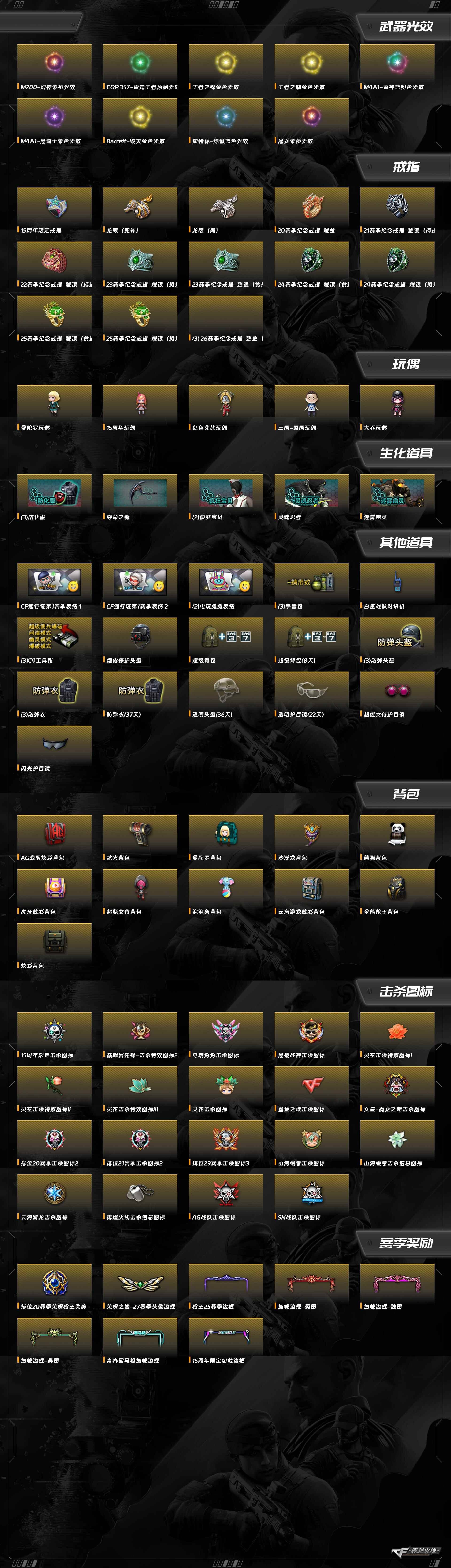 黑骑士-海王,幻灵之锋,擎天,屠龙,沙鹰-修罗,加特林-炼狱,RPK-盘龙,QBZ03-金色蔷薇,AWM-裁决,Barrett-毁灭,M200-幻神,M4A1-黑骑士,M4A1-雷神,AK47-B-常胜将军,AK-47-猩红传说,AK47-B-战士,AK47-火麒麟,G36C-幻影,炽芒蝶刃,白虎-电玩蓝兔