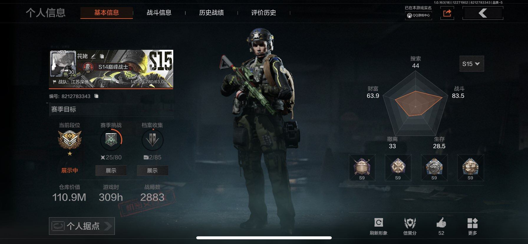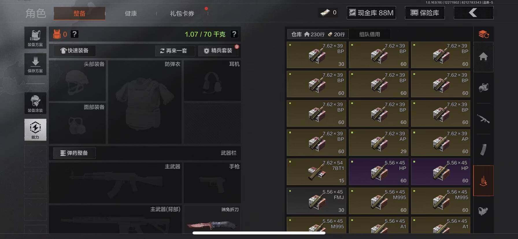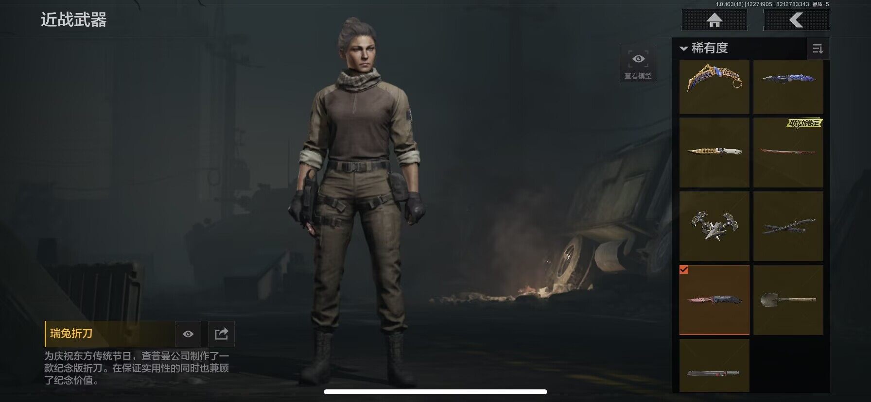【C2536065417】【AQQH148】段位:暗区传说/仓库价值(百万):110.9/苍穹利爪/NOCs-7折刀/胜利军刀/热能武器补牢/寒牙手刺/明刀·绣春/工兵铲/来战·开山刀/瑞兔折刀