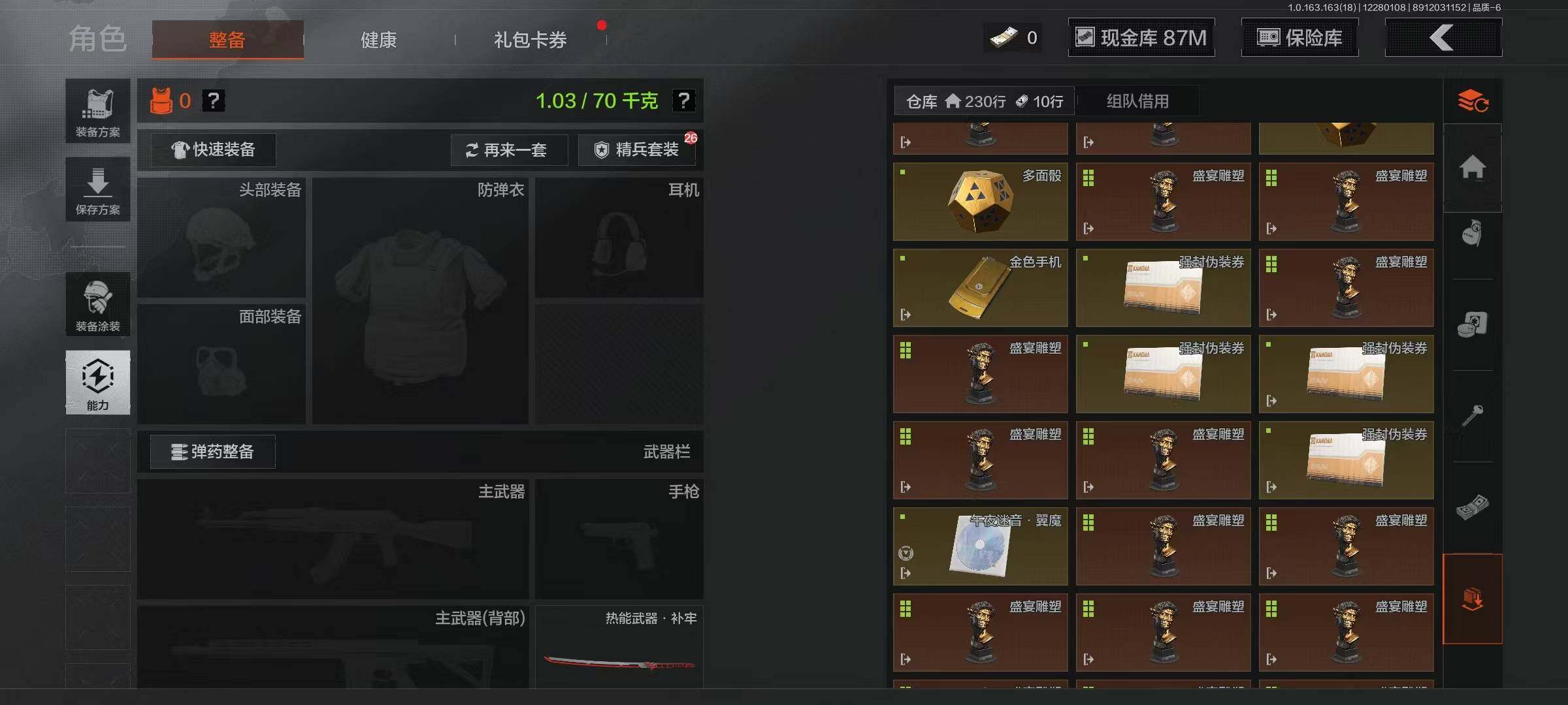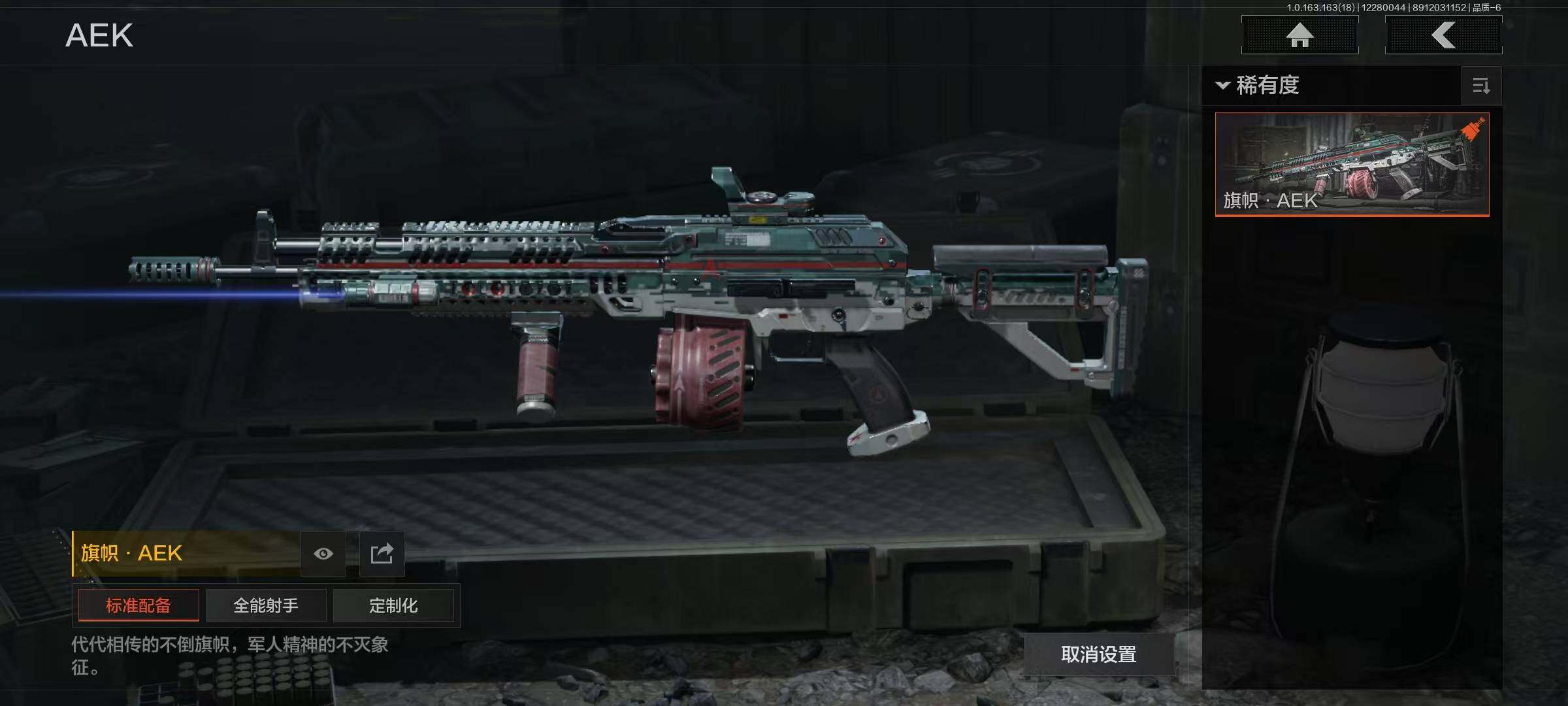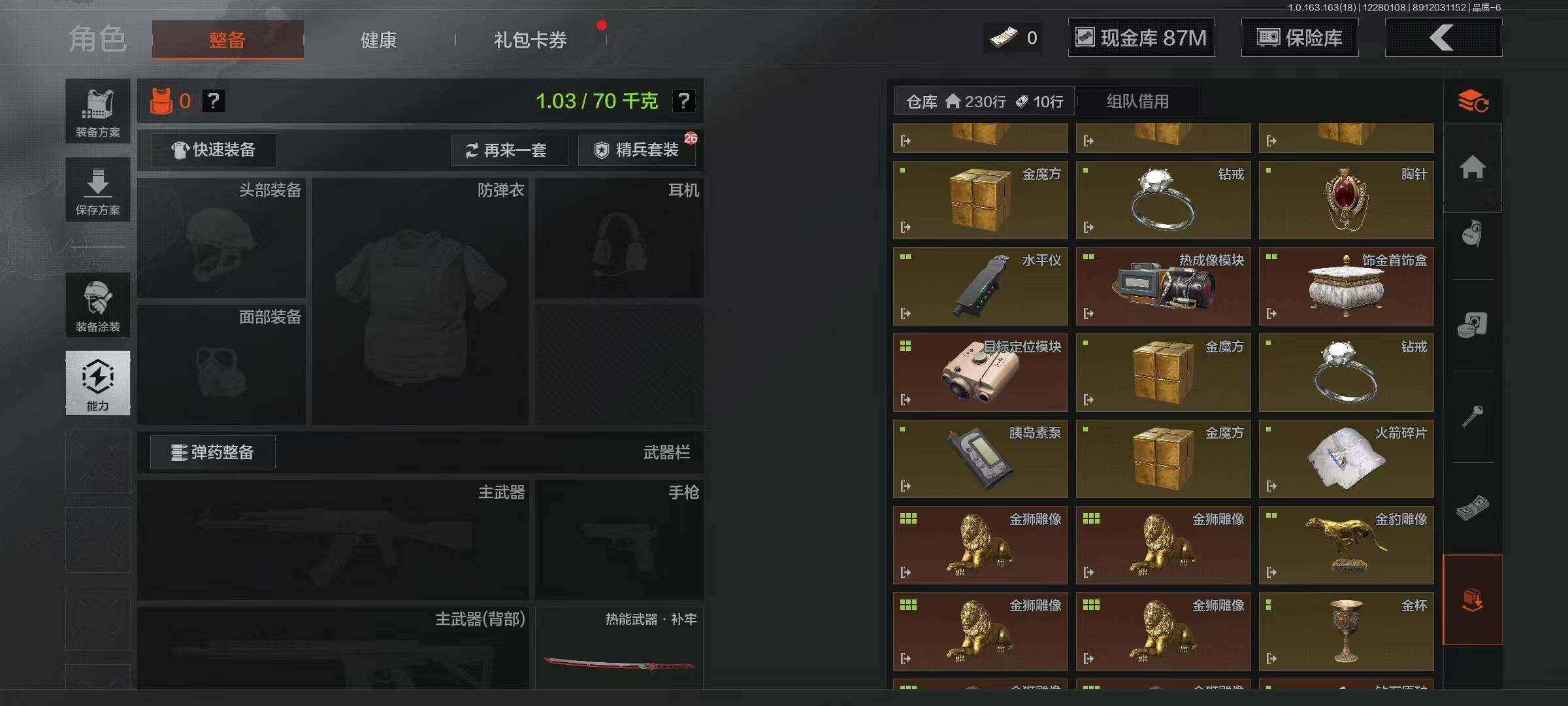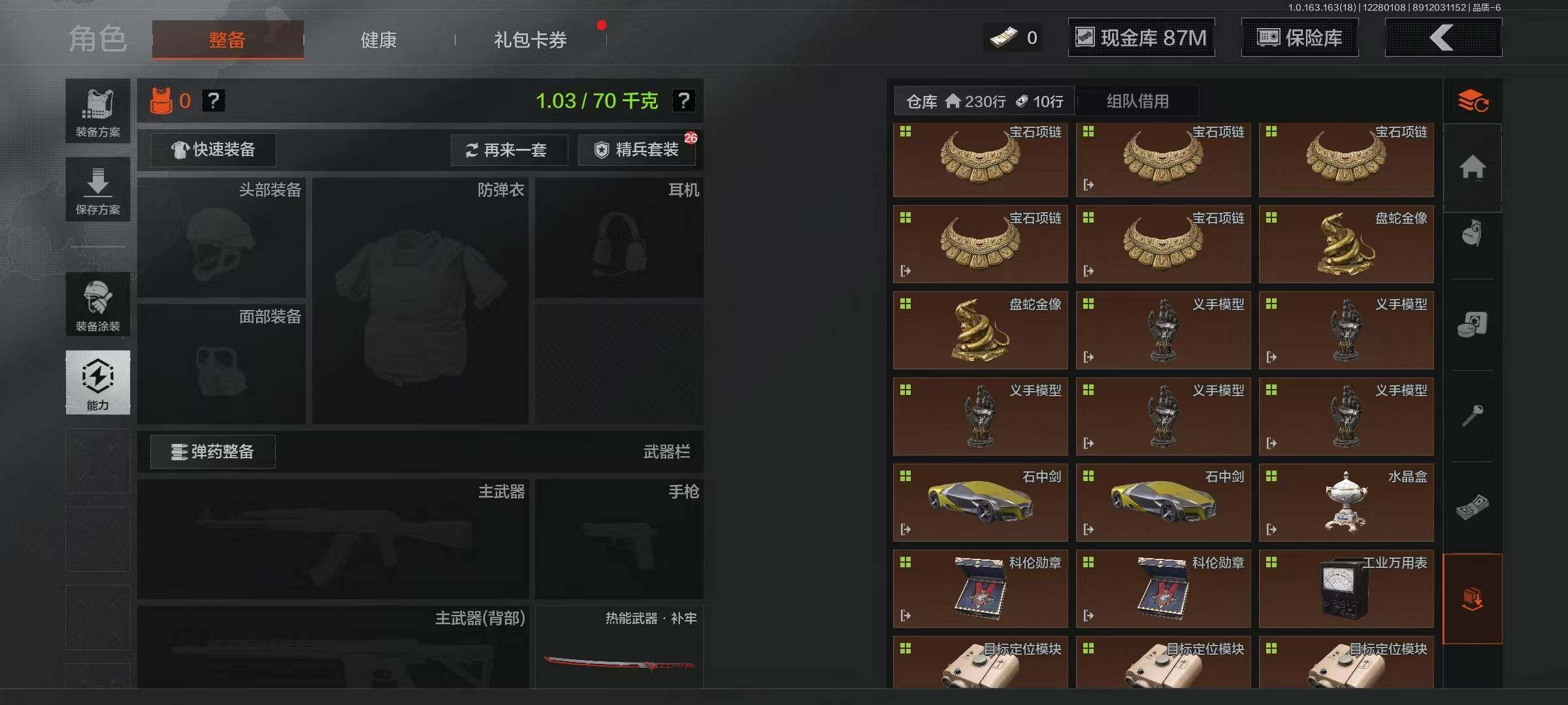 【C2536113172】【AQZG798】等级:30/段位:暗区传说/仓库价值(百万):200.3/柯恩币:87507816/热能武器补牢/来战·开山刀/工兵铲/伦琴幻影FAL/旗帜AEK/旧王圣谕QBZ191/浮鳞影青QBZ192/利齿风暴MPX/骑士之剑VSS/骑士之剑AX50