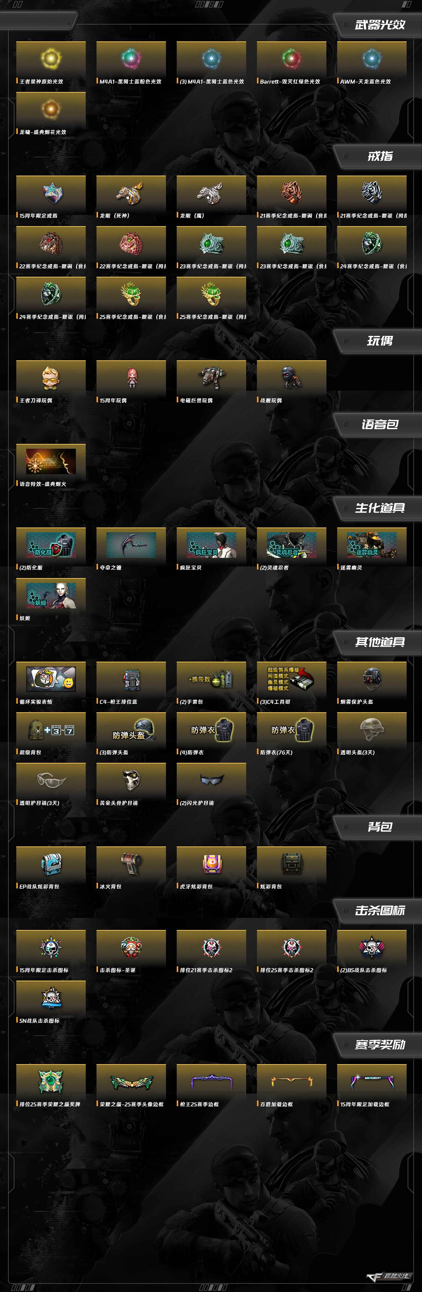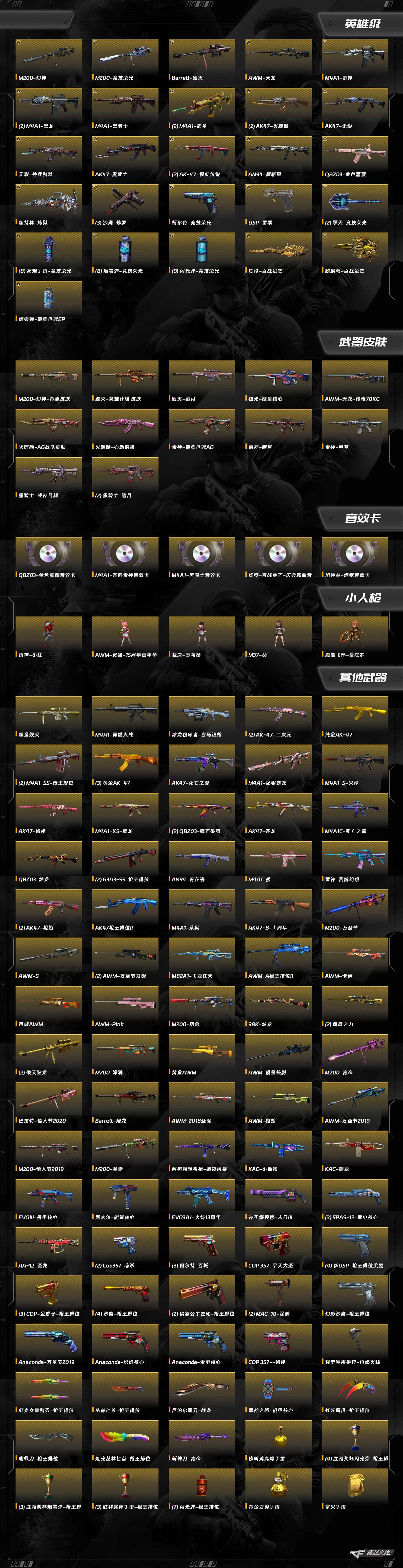 M4A1-武圣,柯尔特-竞技荣光,USP-雷暴,擎天-竞技荣光,沙鹰-修罗,加特林-炼狱,QBZ03-金色蔷薇,AN94-超新星,AWM-天龙,Barrett-毁灭,M200-幻神,M4A1-黑龙,M4A1-黑骑士,M4A1-雷神,AK-47-猩红传说,AK47-黑武士,AK47-火麒麟,AK47-无影,M200-竞技荣光