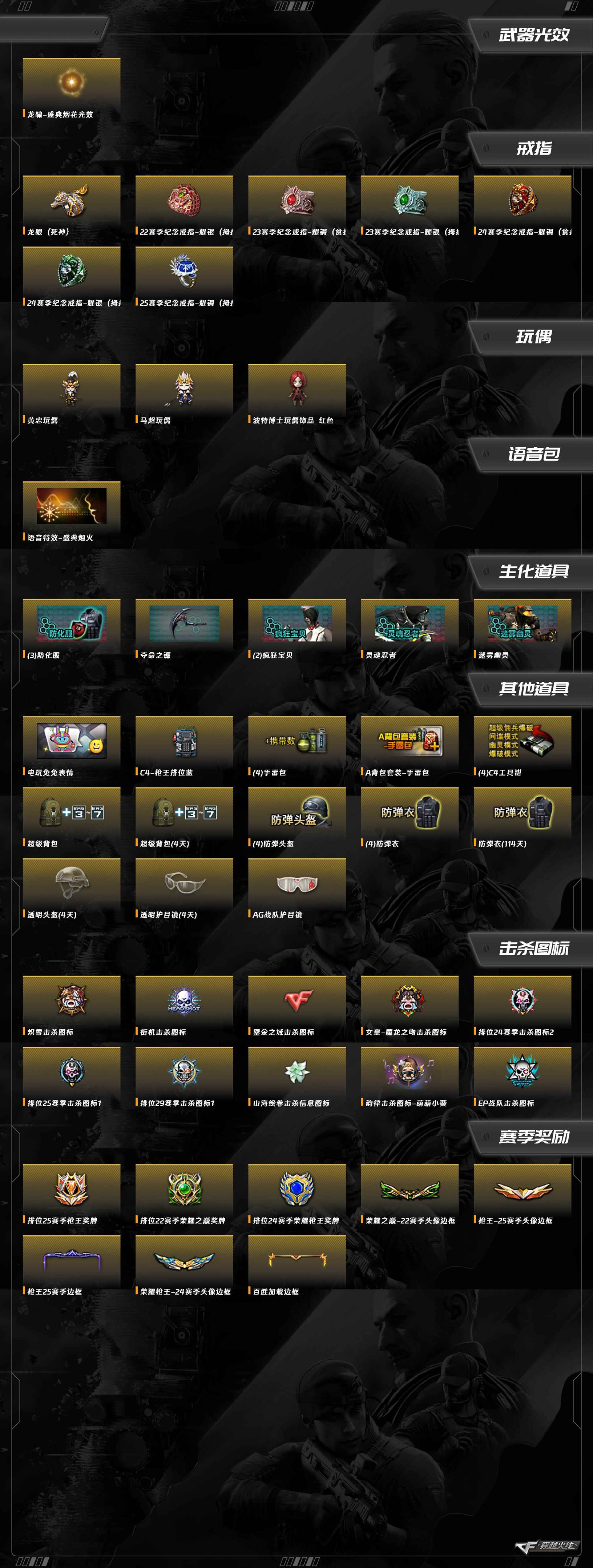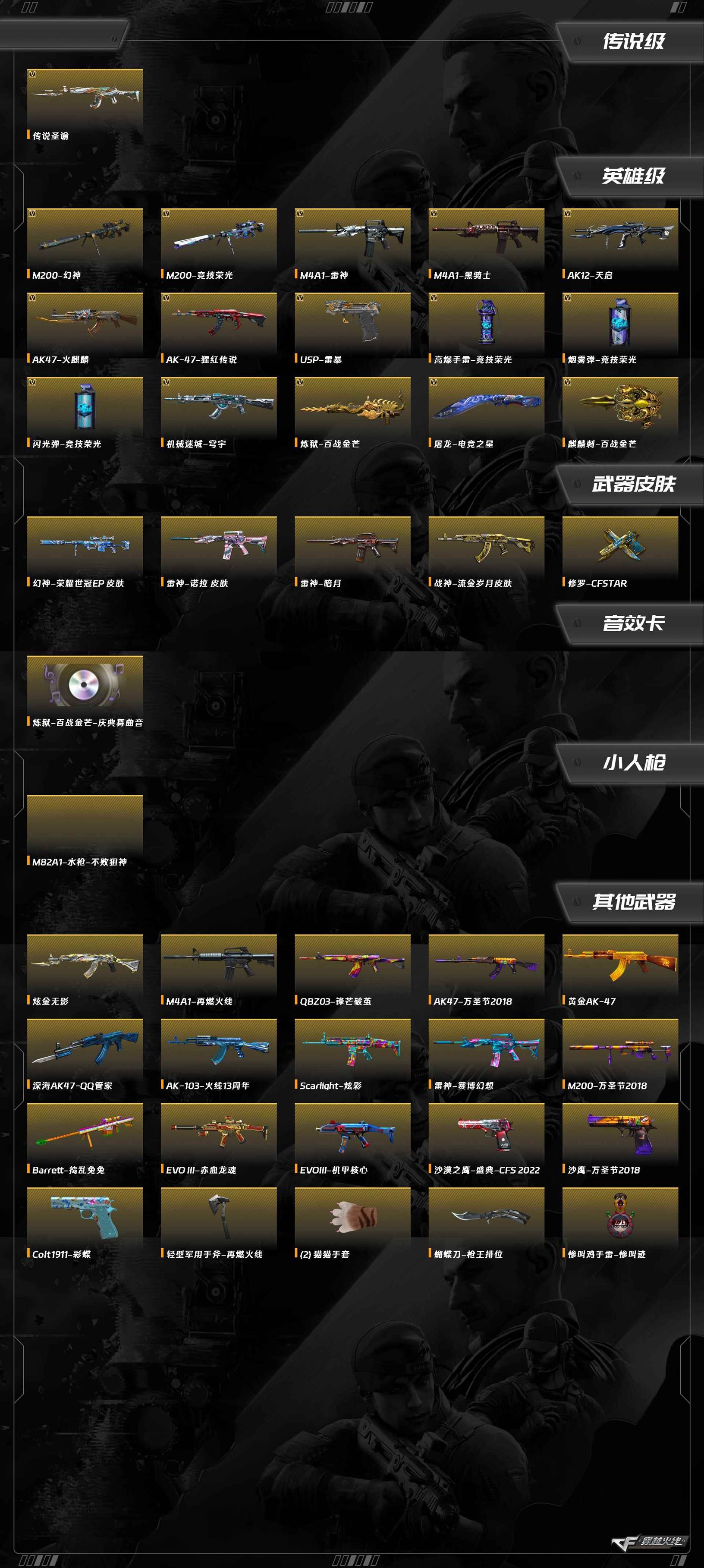M200-幻神,M200-竞技荣光,AK47-火麒麟,AK-47-猩红传说,M4A1-雷神,M4A1-黑骑士,AK12-天启,USP-雷暴