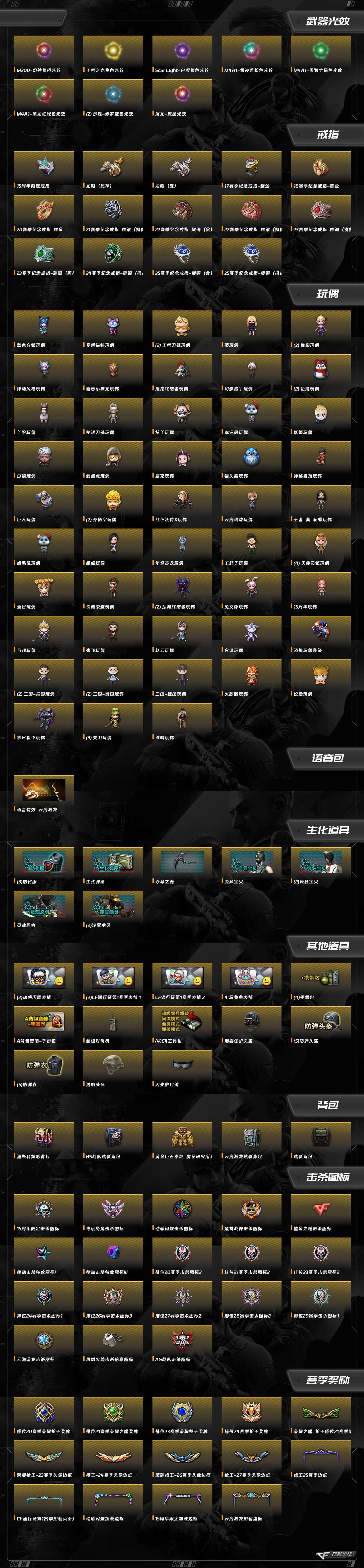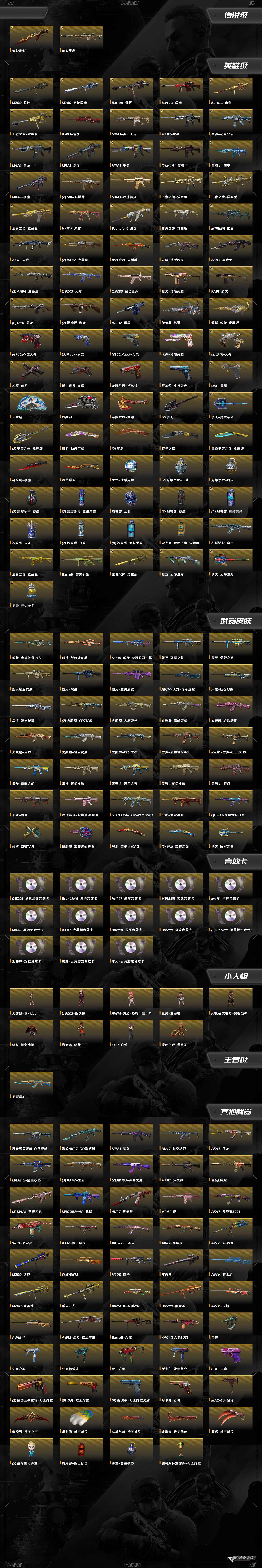 汤姆逊-烈龙,M4A1-玫瑰精灵,Barrett-毁灭,Barrett-极光,Barrett-朱雀,AWM-裁决,AA-12-雷霆,AK12-天启,AN94-超新星,HK417-朱雀,QBZ03-金色蔷薇,9A91-烈火,RPK-盘龙,M4A1-猎神,加特林-炼狱,沙鹰-修罗,擎天-竞技荣光,USP-雷暴,柯尔特-竞技荣光,柯尔特-荣耀世冠,沙鹰-天神,屠龙,麒麟刺,擎天,幻灵之锋,雷神-葫芦兄弟,破空枪刃-夜魔,M200-幻神,M14EBR-玄武,M4A1神工天巧,炽芒蝶刃,传说灵眸,烈火-动感闪耀,屠龙-动感闪耀,天神-动感闪耀,M200-竞技荣光,Scar Light-白虎,擎天-云海游龙,龙啸-荣耀世冠,火麒麟-荣耀世冠,AK47-火麒麟,AK47-黑武士,M4A1-雷神,M4A1-黑骑士,黑骑士-海王,M4A1-黑龙,M4A1-龙血,M4A1-夜魔,M4A1-千变