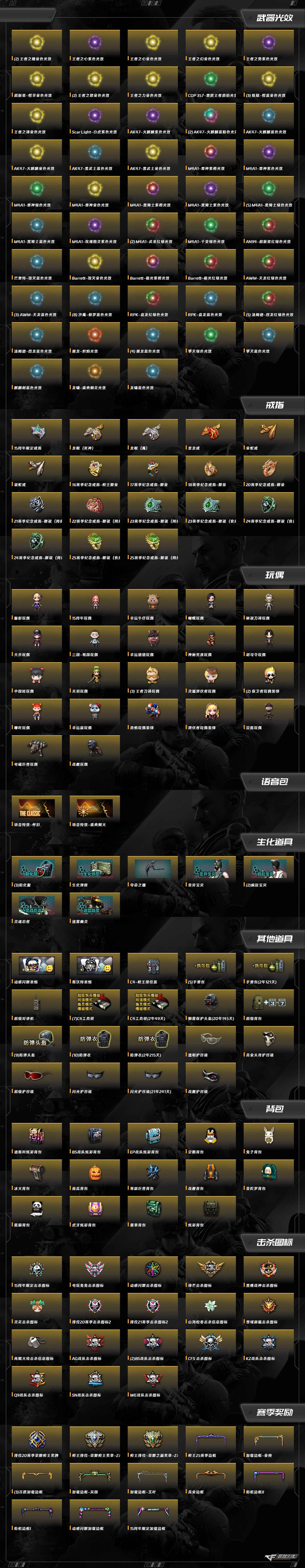 加特林-炼狱,Barrett-极光,AWM-天龙,AWM-裁决,AA-12-雷霆,AK12-天启,HK417-朱雀,QBZ03-金色蔷薇,9A91-烈火,RPK-盘龙,汤姆逊-烈龙,Barrett-毁灭,沙鹰-修罗,USP-雷暴,柯尔特-竞技荣光,沙鹰-天神,屠龙,龙啸,麒麟刺,擎天,斩神刀-雷暴,AK-47-猩红传说,柯尔特-冠军之特,龙啸-烈火龙威,M200-竞技荣光,Kar98k-星神,Scar Light-白虎,AK47-无影,AK47-火麒麟,AK47-雷暴,AK47-黑武士,M200-幻神,AK47-B-战神,M4A1-雷神,M4A1-黑骑士,黑骑士-海王,M4A1-雷霆,M4A1-黑龙,M4A1-龙血,M4A1-武圣,M4A1-千变