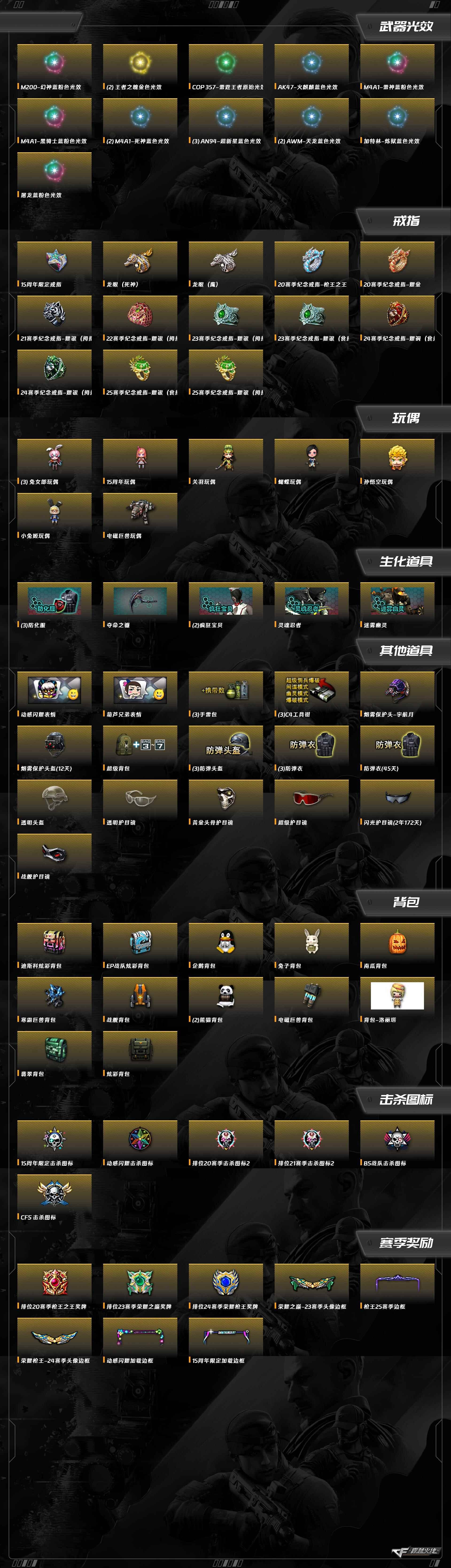 9A91-烈火,M4A1-青龙,M4A1-玫瑰精灵,Barrett-毁灭,Barrett-极光,Barrett-朱雀,Barrett-暗月传说,AWM-天龙,AWM-裁决,AA-12-雷霆,AK12-天启,AN94-超新星,HK417-朱雀,QBZ03-金色蔷薇,M4A1-千变,RPK-盘龙,汤姆逊-烈龙,沙鹰-修罗,擎天-竞技荣光,USP-雷暴,柯尔特-竞技荣光,柯尔特-荣耀世冠,沙鹰-天神,屠龙,龙啸,擎天,幻灵之锋,AK47-火麒麟,柯尔特-冠军之特,M4A1神工天巧,唐刀神工天巧,炽芒蝶刃,USP神工天巧,烈火-动感闪耀,屠龙-动感闪耀,天神-动感闪耀,M200-竞技荣光,Kar98k-星神,雷神-葫芦兄弟,雷神-荣耀世冠,AK47-无影,M200-幻神,AK47-黑鲨,AK47-黑武士,AK47-机械迷城,AK-47-猩红传说,M4A1-雷神,M4A1-黑骑士,黑骑士-海王,M4A1-死神,M4A1-黑龙,M4A1-龙血,M4A1-武圣,M4A1-堕天神