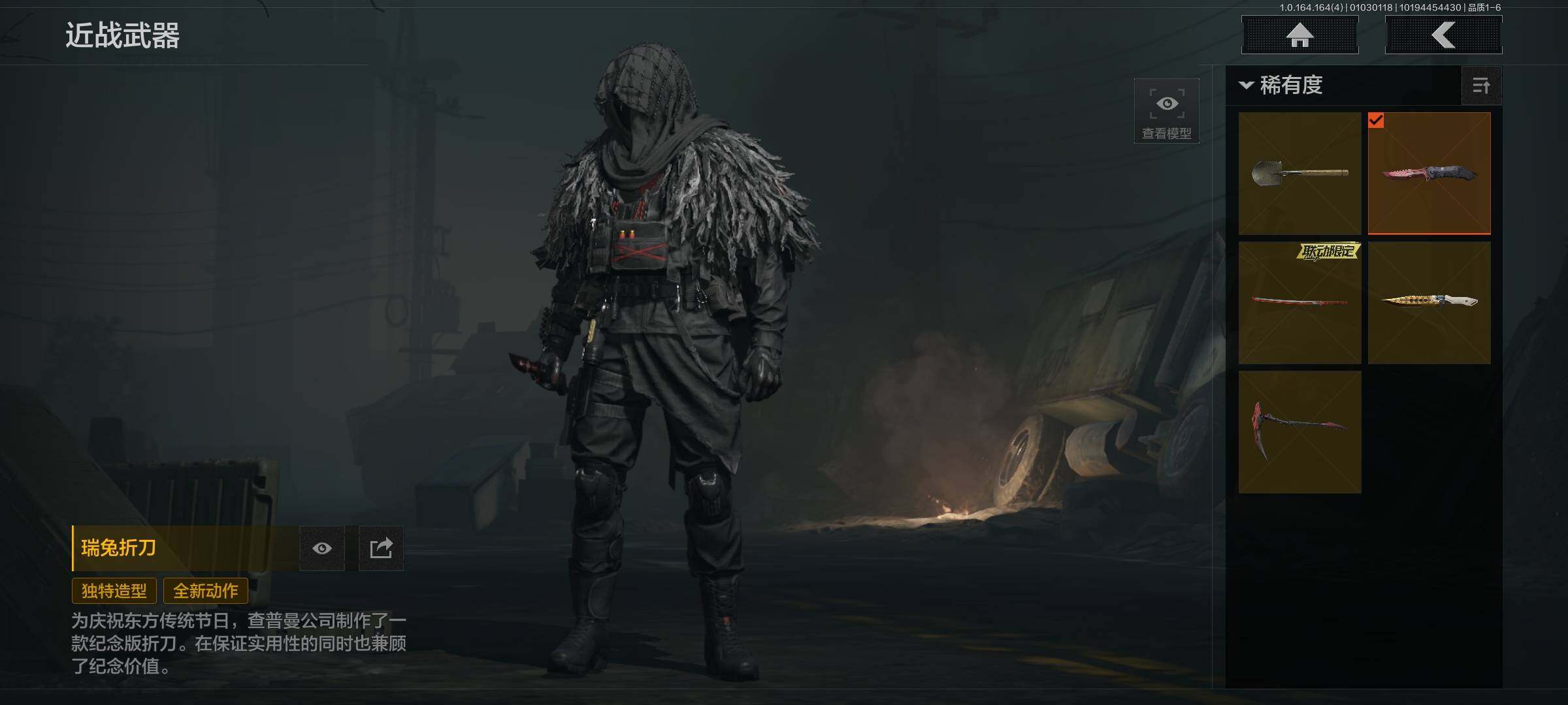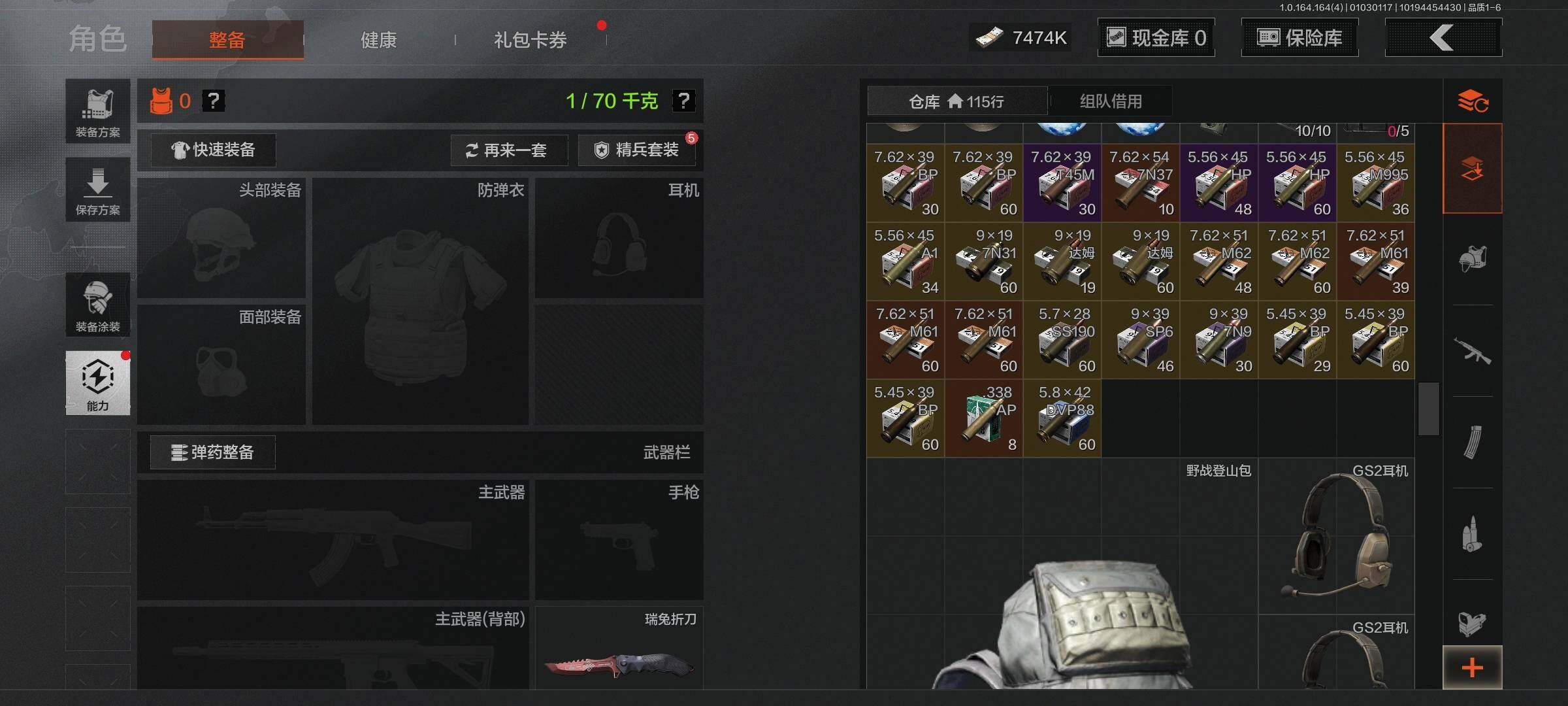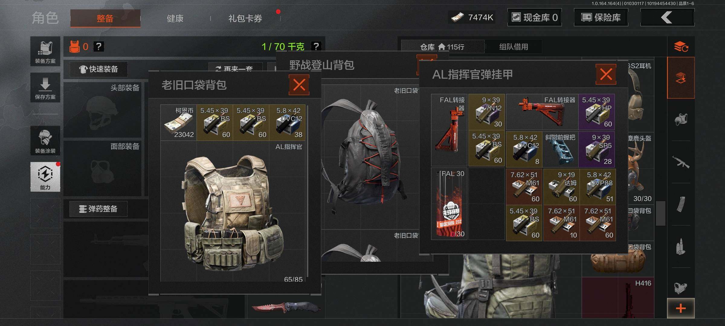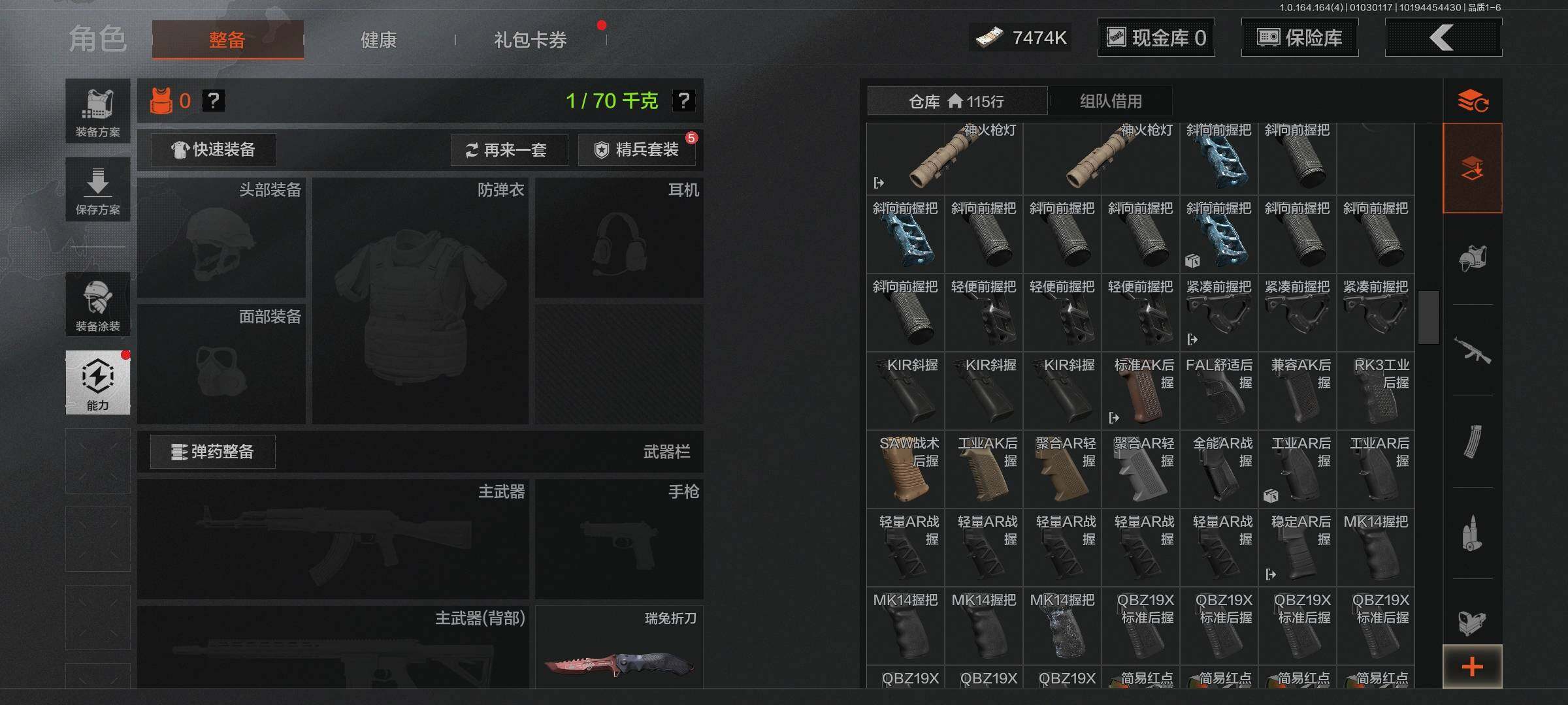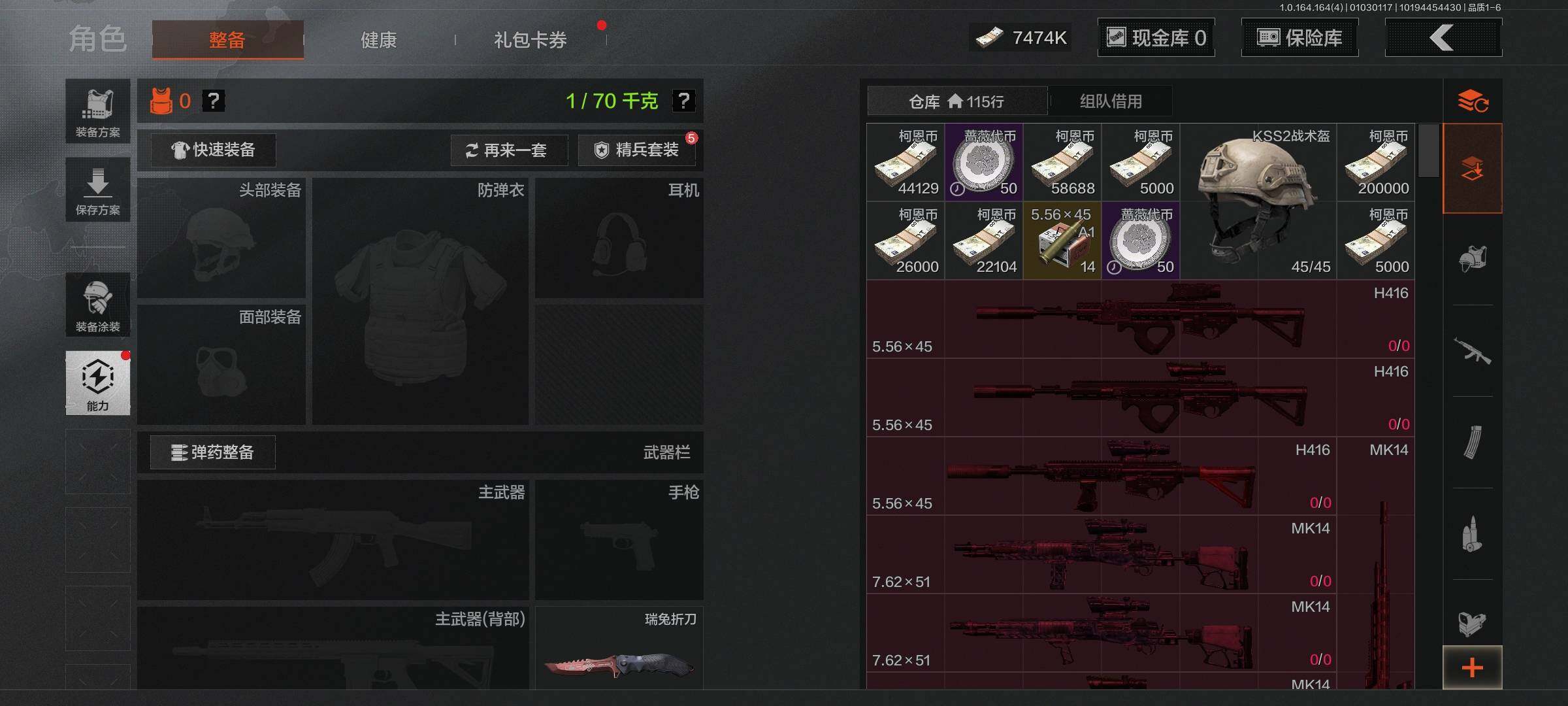 【C26284362】【AQZG842】段位:暗区传说/仓库价值(百万):16.4/柯恩币:7474000/瑞兔折刀/赢家匕首/收割者/热能武器补牢/使徒欧瑞恩/骑士之剑VSS/冰河碎影MK14/旧王圣谕VSS/伦琴幻影FAL/告丧夜曲AUG/告丧夜曲AR57