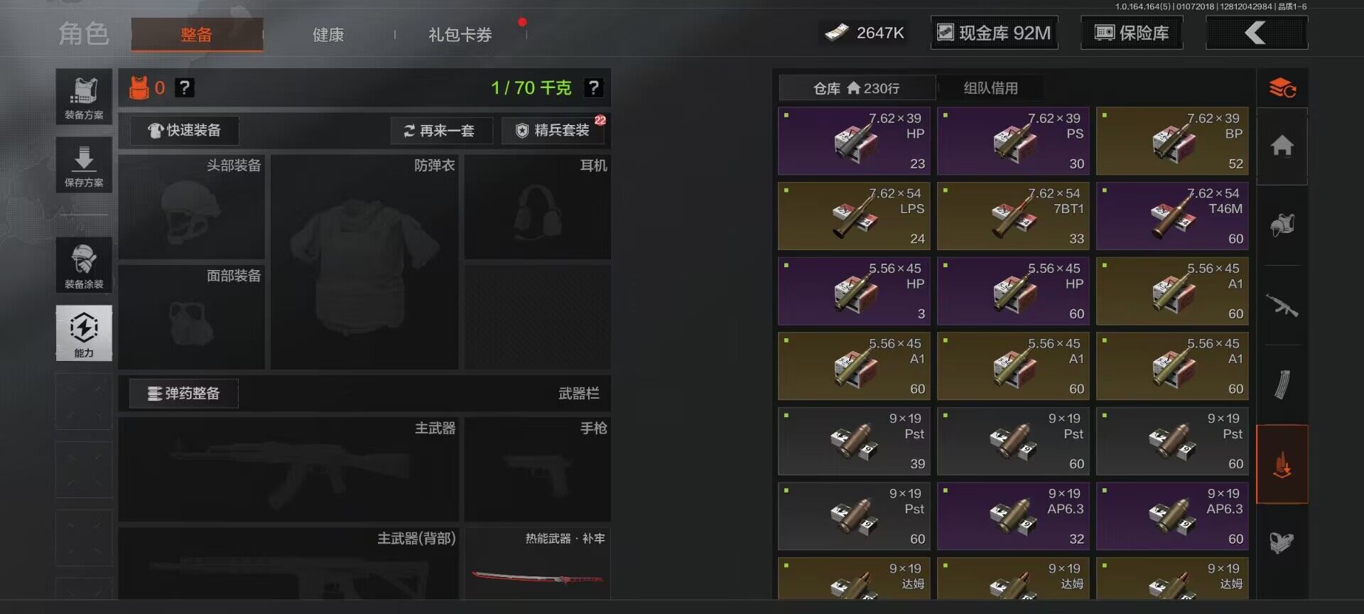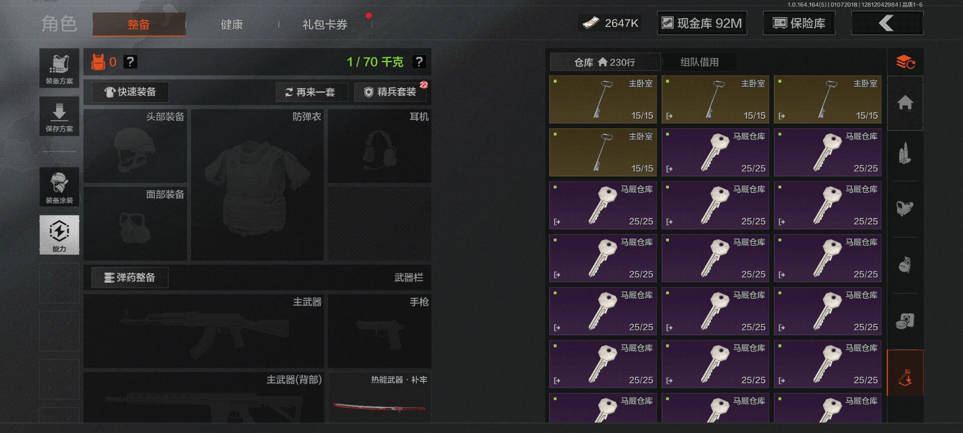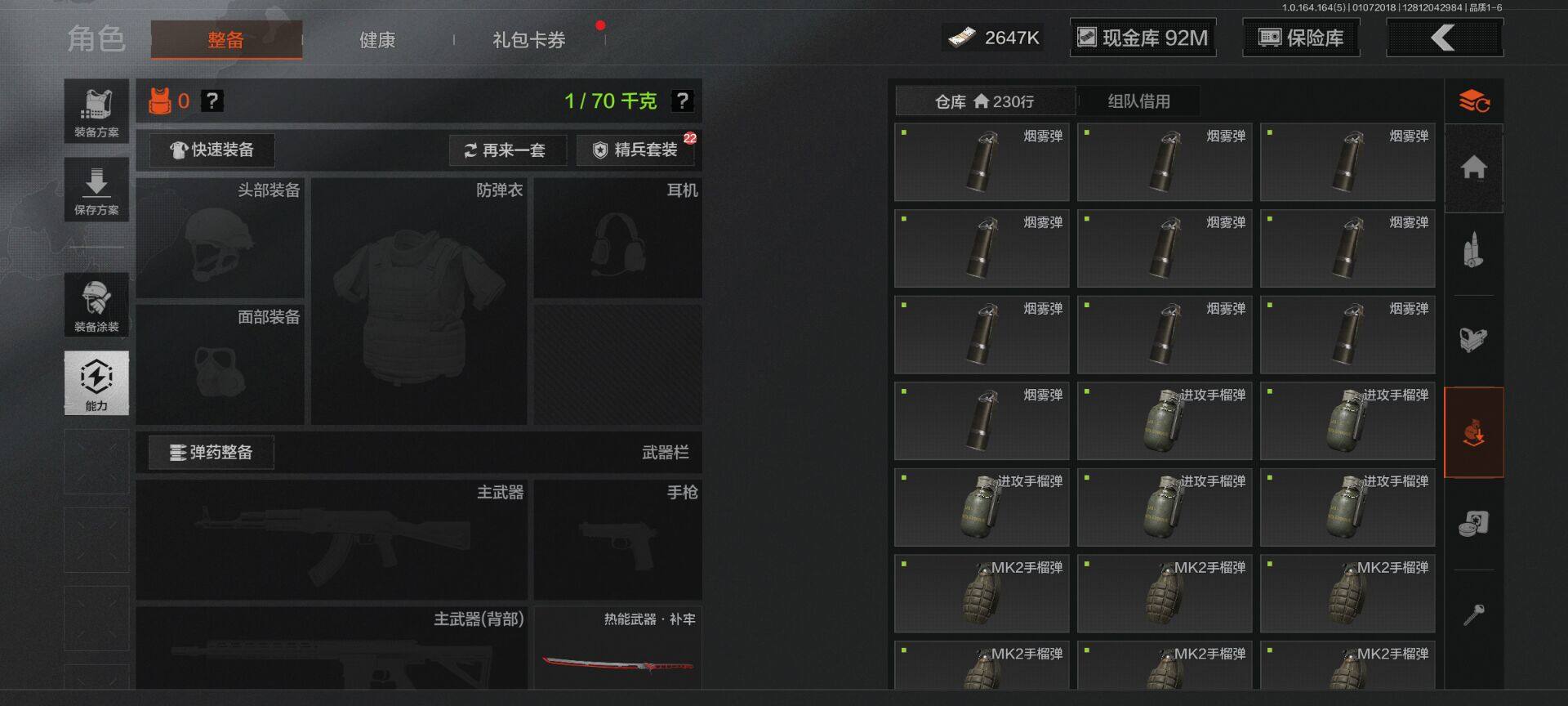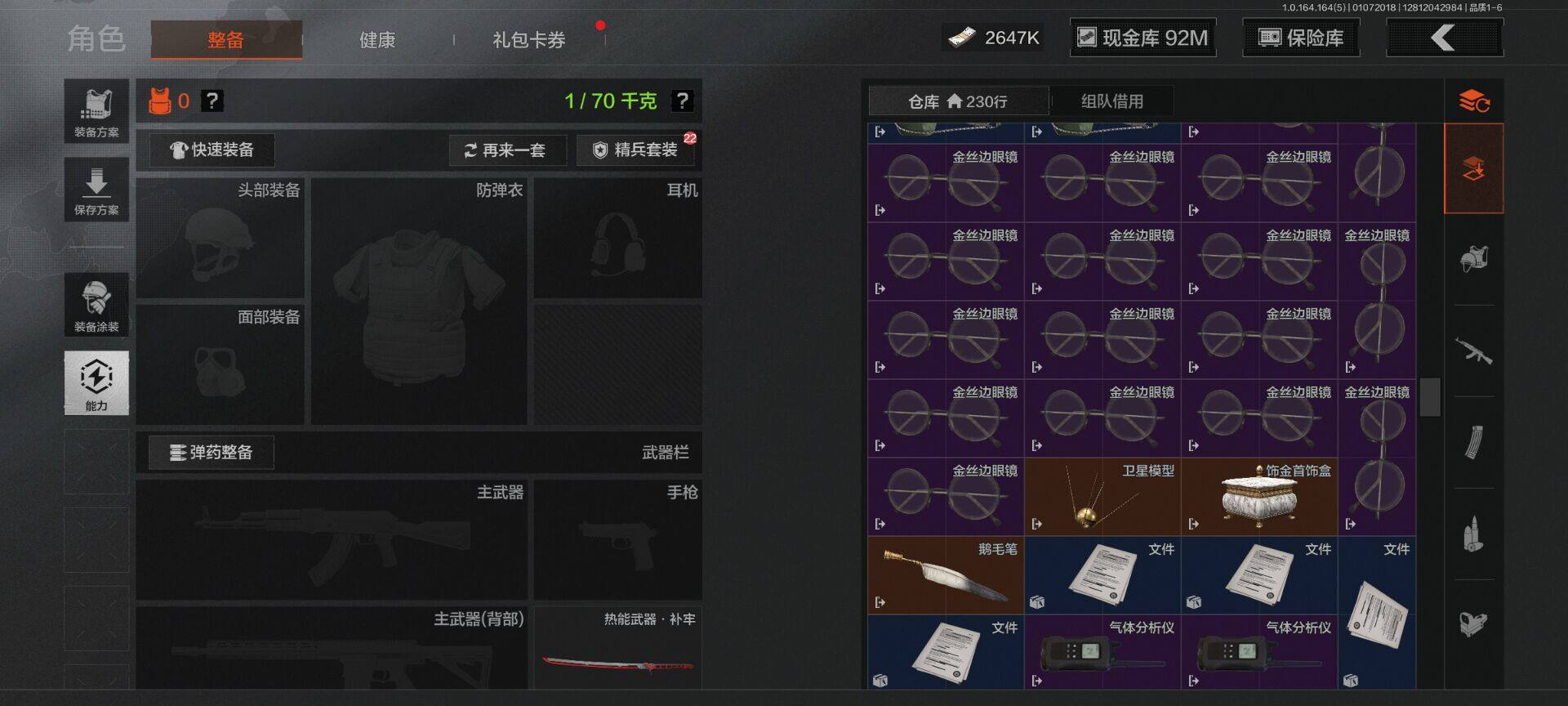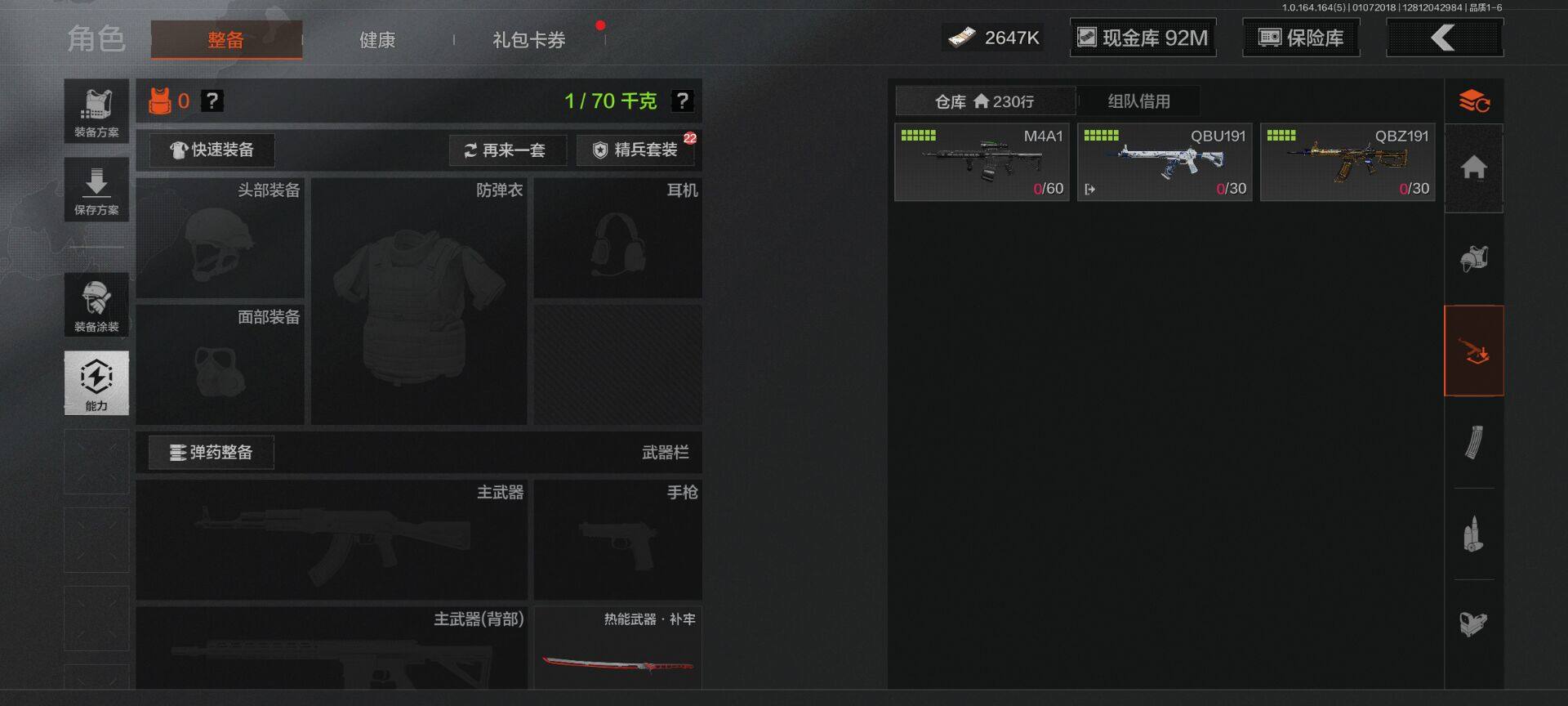 【C26693539】【AQZG896】等级:30/段位:尖兵/仓库价值(百万):114.4/柯恩币:2647000/热能武器补牢/旧王圣谕QBZ191/告丧夜曲AUG