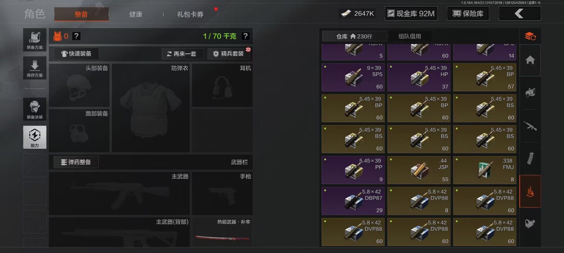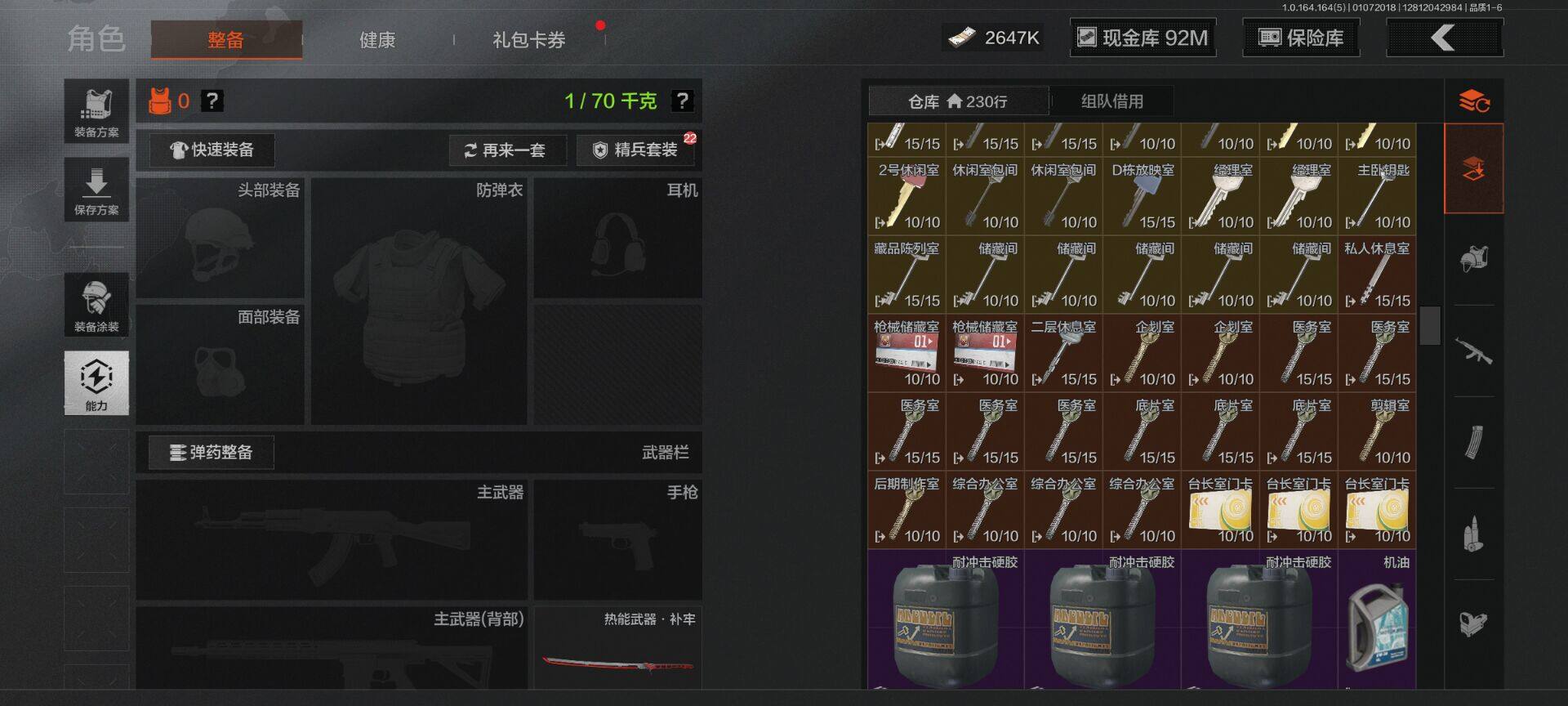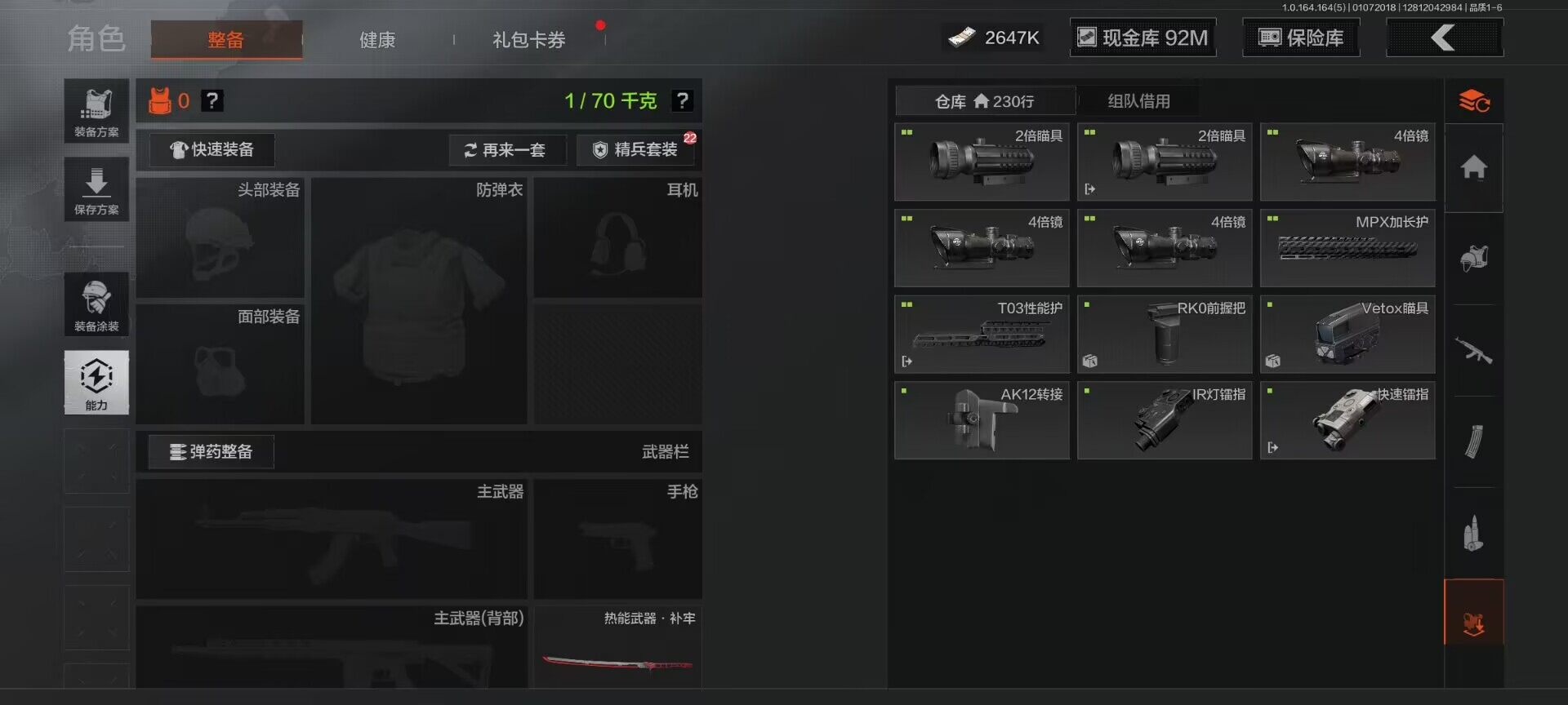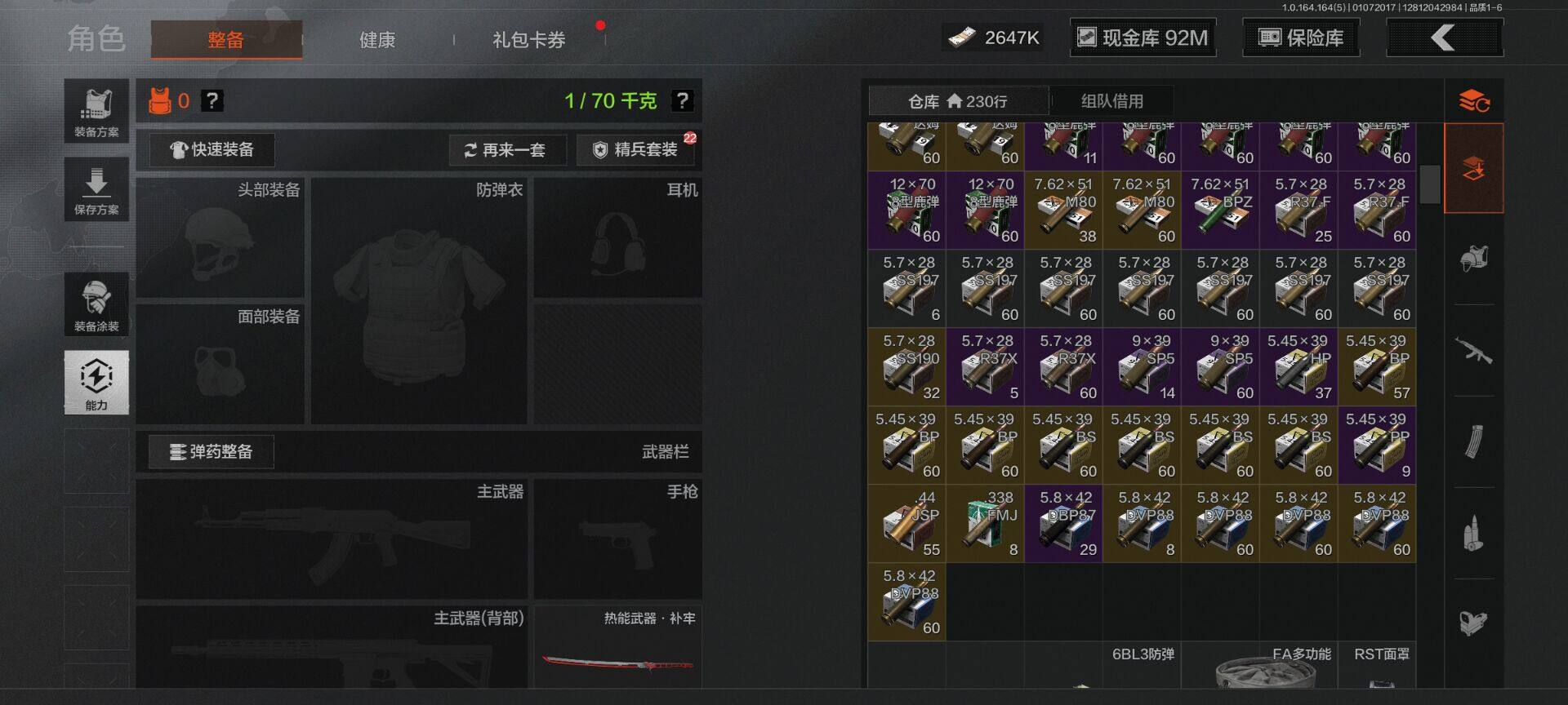 【C26693539】【AQZG896】等级:30/段位:尖兵/仓库价值(百万):114.4/柯恩币:2647000/热能武器补牢/旧王圣谕QBZ191/告丧夜曲AUG
