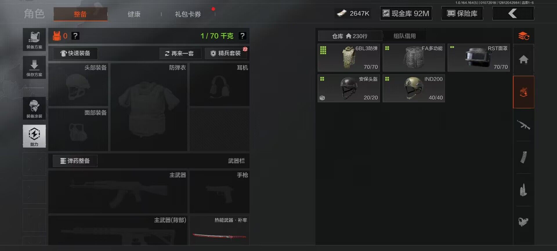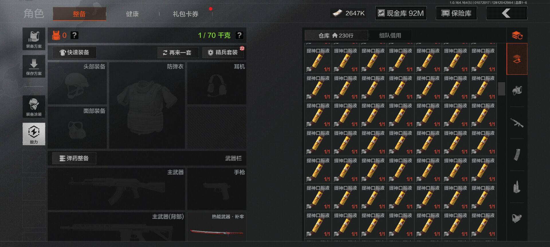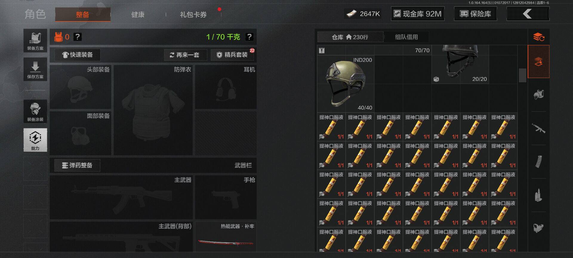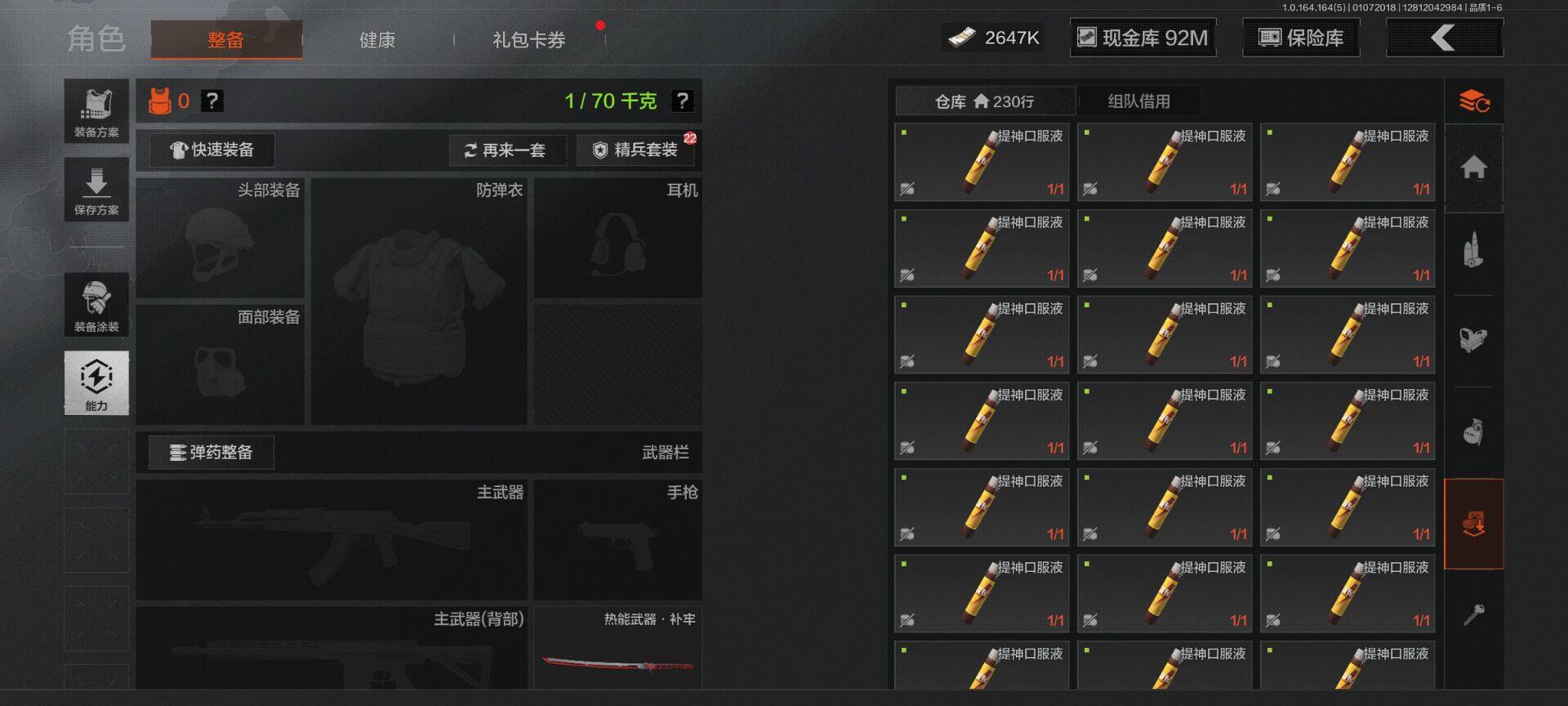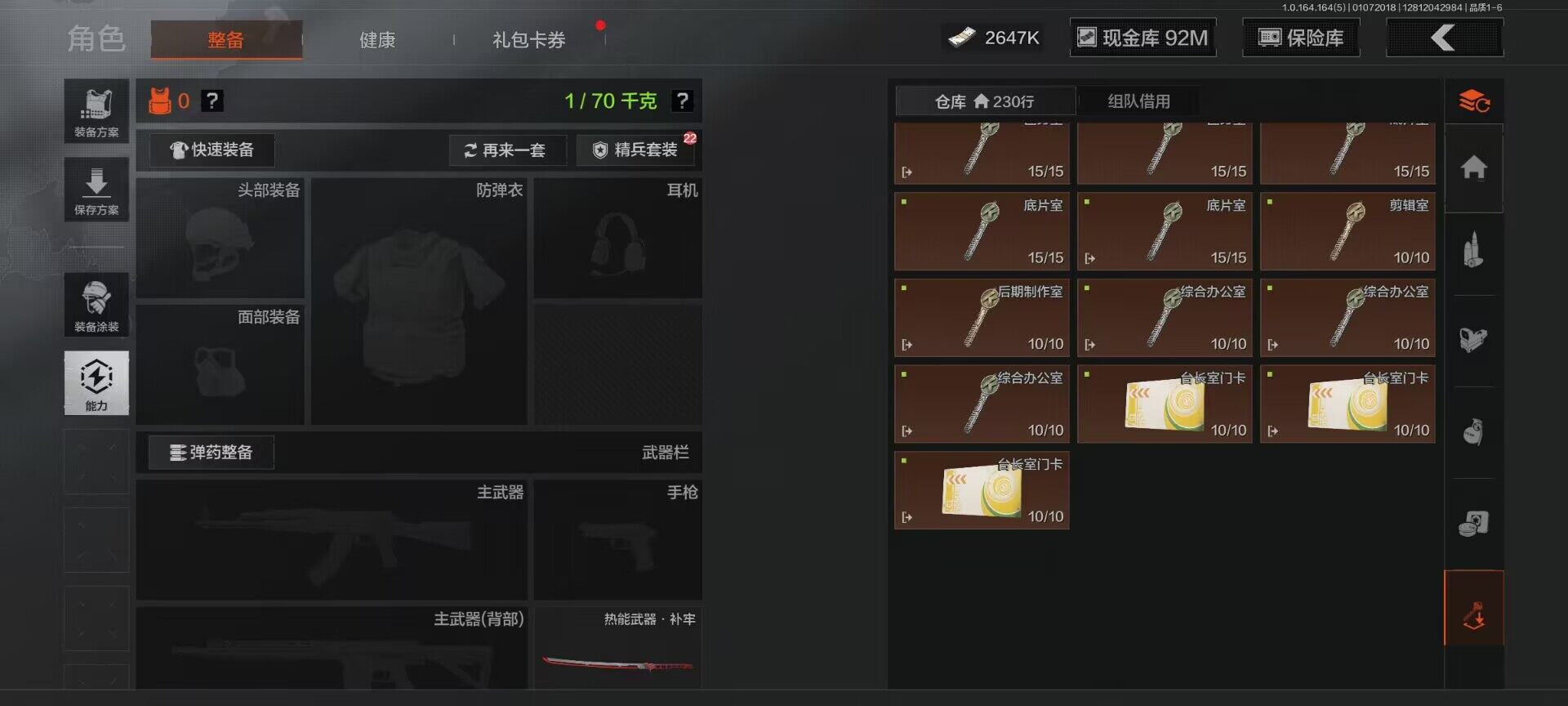 【C26693539】【AQZG896】等级:30/段位:尖兵/仓库价值(百万):114.4/柯恩币:2647000/热能武器补牢/旧王圣谕QBZ191/告丧夜曲AUG