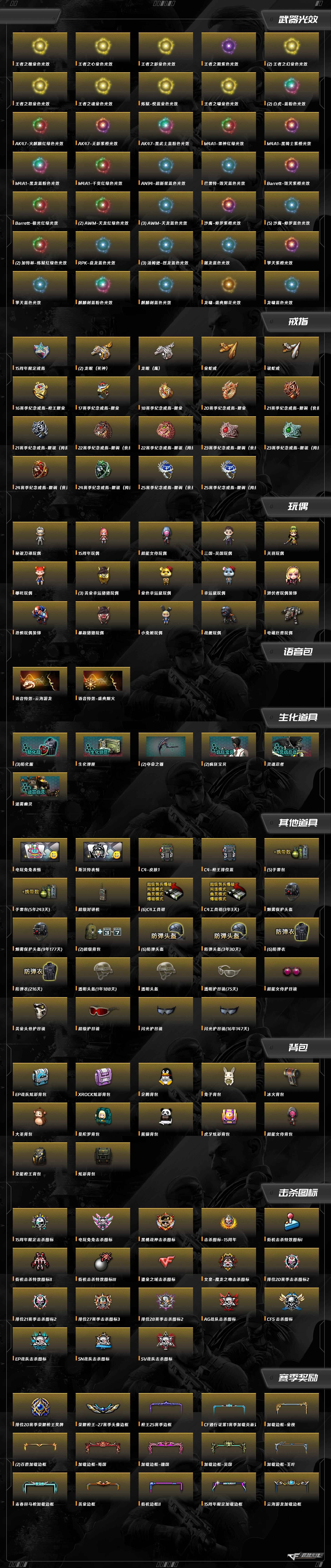 汤姆逊-烈龙,Barrett-毁灭,Barrett-极光,Barrett-暗月传说,AWM-天龙,AWM-裁决,AA-12-雷霆,AK12-天启,QBZ03-金色蔷薇,9A91-烈火,M4A1-玫瑰精灵,加特林-炼狱,沙鹰-修罗,USP-雷暴,沙鹰-天神,屠龙,龙啸,麒麟刺,擎天,斩神刀-雷暴,AK-47-猩红传说,白虎-电玩蓝兔,Scar Light-白虎,AK47-无影,AK47-火麒麟,AK47-雷暴,AK47-黑鲨,AK47-黑武士,AK47-B-战士,AK47-机械迷城,M200-幻神,AK47-B-战神,AK47-B-常胜将军,M4A1-雷神,M4A1-黑骑士,M4A1-死神,M4A1-黑龙,M4A1-龙血,M4A1-武圣,M4A1-千变