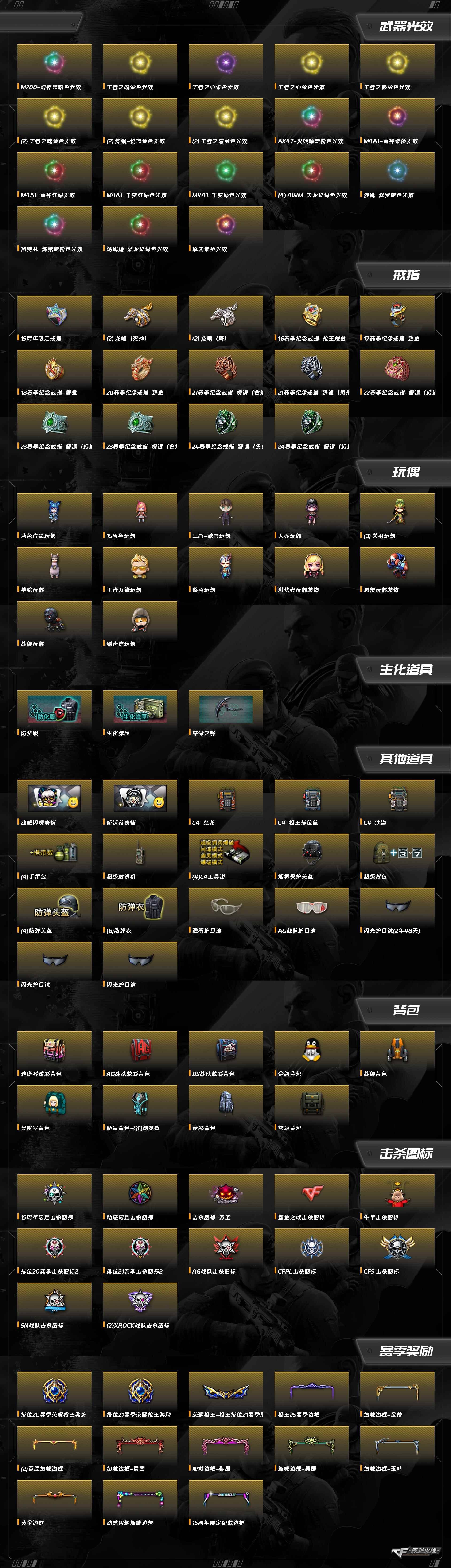 汤姆逊-烈龙,M4A1-武圣,M4A1-青龙,M4A1-猎神,Barrett-毁灭,Barrett-极光,AWM-天龙,AWM-裁决,QBZ03-金色蔷薇,9A91-烈火,RPK-盘龙,M4A1-龙血,加特林-炼狱,沙鹰-修罗,USP-雷暴,沙鹰-天神,屠龙,龙啸,麒麟刺,擎天,斩神刀-雷暴,AK47-机械迷城,烈火-动感闪耀,屠龙-动感闪耀,天神-动感闪耀,AK47-无影,AK47-火麒麟,AK47-雷暴,AK47-黑鲨,AK47-黑武士,AK47-麒麟,AK47-B-战士,M200-幻神,AK-47-猩红传说,AK47-B-战神,AK47-B-常胜将军,M4A1-雷神,M4A1-黑骑士,黑骑士-海王,M4A1-死神,M4A1-雷霆,M4A1-黑龙