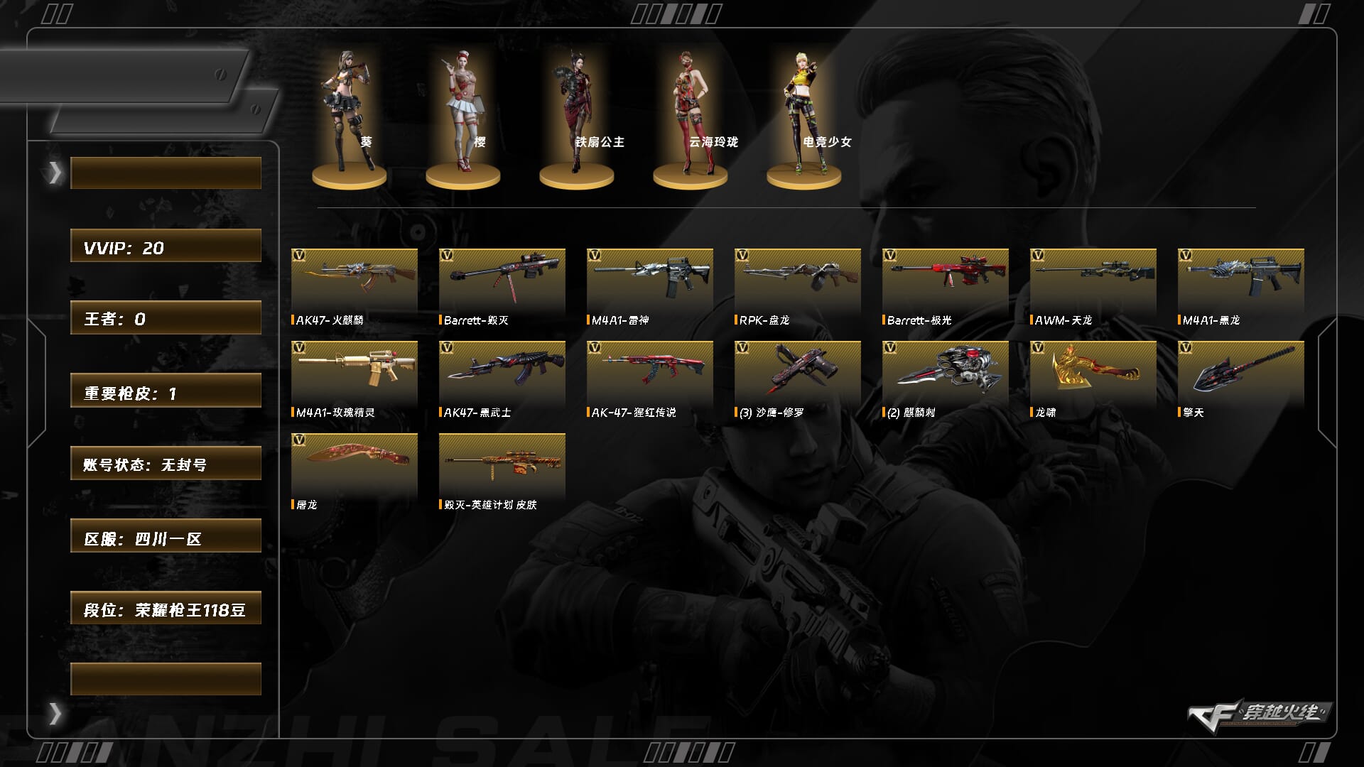 【C26635693】[15366021]XH9813/西部/四川一区/【荣耀枪王118豆】/Lv.100 大元帅/VIP2/20V/毁灭/毁灭英雄计划/极光/天龙/火麒麟/雷神/黑龙/黑武士/盘龙/3修罗/屠龙/龙啸/擎天/【角色】/葵/樱/铁扇公主/云海玲珑/电竞少女/【道具】/永久烟雾头/护目镜/超级背包/各种戒指/各种玩偶/永久AC/永久雷包/细节看图/【此账号未被封过十年】