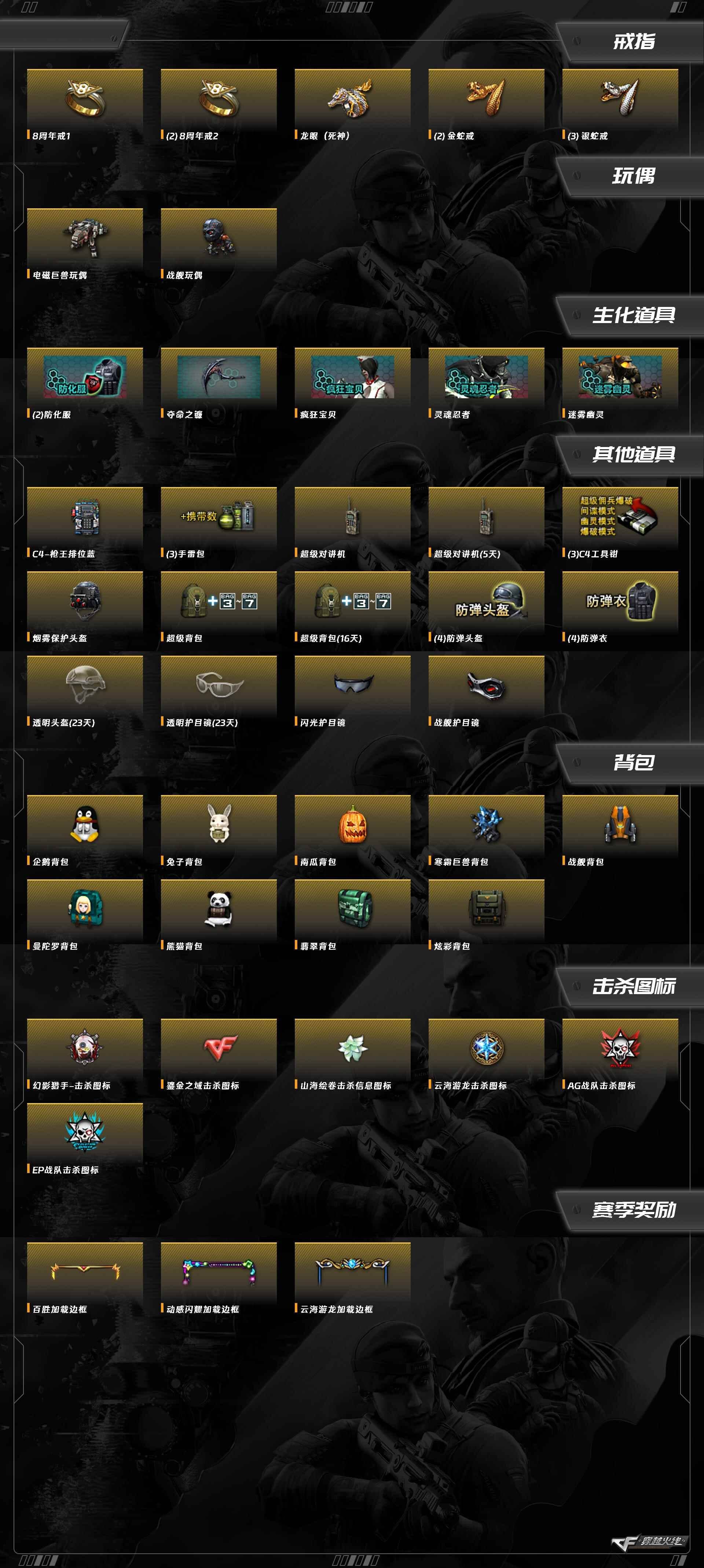 AK47-火麒麟,AK47-黑武士,AK-47-猩红传说,M4A1-雷神,M4A1-黑龙,M4A1-玫瑰精灵,Barrett-毁灭,Barrett-极光,AWM-天龙,RPK-盘龙,沙鹰-修罗,屠龙,龙啸,麒麟刺,擎天